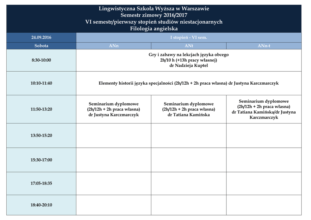 Lingwistyczna Szkoła Wyższa w Warszawie Semestr zimowy 2016/2017 VI semestr/pierwszy stopień studiów niestacjonarnych Filologia angielska I stopień - VI sem. 24.09.2016 Sobota ANn ANt ANn-t 8:30-10:00 Gry i zabawy na lekcjach języka obcego 2h/10 h (+13h pracy własnej) dr Nadzieja Kuptel 10:10-11:40 Elementy historii języka specjalności (2h/12h + 2h praca własna) dr Justyna Karczmarczyk 11:50-13:20 13:50-15:20 15:30-17:00 17:05-18:35 18:40-20:10 Seminarium dyplomowe (2h/12h + 2h praca własna) dr Justyna Karczmarczyk Seminarium dyplomowe (2h/12h + 2h praca własna) dr Tatiana Kamińska Seminarium dyplomowe (2h/12h + 2h praca własna) dr Tatiana Kamińska/dr Justyna Karczmarczyk I stopień - VI sem. 25.09.2016 Niedziela ANn ANt 8:30-10:00 10:10-11:40 11:50-13:20 13:50-15:20 15:30-17:00 17:05-18:35 Redakcja tekstu (opcja) 2h/10h (+13h pracy własnej) mgr Joanna Karłowicz-Budzik 18:40-20:10 Redakcja tekstu (opcja) 4h/10h (+13h pracy własnej) mgr Joanna Karłowicz-Budzik ANn-t Lingwistyczna Szkoła Wyższa w Warszawie Semestr zimowy 2016/2017 VI semestr/pierwszy stopień studiów niestacjonarnych Filologia angielska I stopień - VI sem. 8.10.2016 Sobota ANn ANt ANn-t Gry i zabawy na lekcjach języka obcego 4h/10 h (+4h pracy własnej) dr Nadzieja Kuptel 8:30-10:00 10:10-11:40 Dydaktyka nauczania języka specjalności (2h/18h + 12h praca własna) mgr Paweł Madej Dydaktyka nauczania języka specjalności (2h/18h + 12h praca własna) mgr Paweł Madej 11:50-13:20 Dydaktyka nauczania języka specjalności (4h/18h + 12h praca własna) mgr Paweł Madej Dydaktyka nauczania języka specjalności (4h/18h + 12h praca własna) mgr Paweł Madej 13:50-15:20 Dydaktyka nauczania języka specjalności (6h/18h + 12h praca własna) mgr Paweł Madej Dydaktyka nauczania języka specjalności (6h/18h + 12h praca własna) mgr Paweł Madej 15:30-17:00 17:05-18:35 18:40-20:10 Wybrane zagadnienia leksykograficzne (opcja) 4h/10h (+13h pracy własnej) dr Sylwia Krukowska I stopień - VI sem. 9.10.2016 Niedziela ANn ANt ANn-t 8:30-10:00 PNJ Sprawności Zintegrowane (2h/20h + 16 praca własna) mgr Katarzyna Różańska 10:10-11:40 PNJ Sprawności Zintegrowane (4h/20h + 16 praca własna) mgr Katarzyna Różańska 11:50-13:20 PNJ Konwersacje (2h/12h + 6h praca własna) mgr Katarzyna Różańska 13:50-15:20 PNJ Pisanie z elementami gramatyki (2h/12h + 6h praca własna) dr Przemysław Wilk 15:30-17:00 PNJ Pisanie z elementami gramatyki (4h/12h + 6h praca własna) dr Przemysław Wilk 17:05-18:35 Redakcja tekstu (opcja) 6h/10h (+13h pracy własnej) mgr Joanna Karłowicz-Budzik 18:40-20:10 Redakcja tekstu (opcja) 8h/10h (+13h pracy własnej) mgr Joanna Karłowicz-Budzik Lingwistyczna Szkoła Wyższa w Warszawie Semestr zimowy 2016/2017 VI semestr/pierwszy stopień studiów niestacjonarnych Filologia angielska I stopień - VI sem. 22.10.2016 Sobota ANn ANt ANn-t 8:30-10:00 Gry i zabawy na lekcjach języka obcego 6h/10 h (+4h pracy własnej) dr Nadzieja Kuptel s. 100 10:10-11:40 Elementy historii języka specjalności (4h/12h + 2h praca własna) dr Justyna Karczmarczyk s. 114 11:50-13:20 Seminarium dyplomowe (4h/12h + 2h praca własna) dr Justyna Karczmarczyk s. 105 Seminarium dyplomowe (4h/12h + 2h praca własna) dr Tatiana Kamińska s. 108 Seminarium dyplomowe (4h/12h + 2h praca własna) dr Tatiana Kamińska s. 108/dr Justyna Karczmarczyk s. 105 13:50-15:20 15:30-17:00 17:05-18:35 18:40-20:10 Wybrane zagadnienia leksykograficzne (opcja) 6h/10h (+13h pracy własnej) dr Sylwia Krukowska s. 100 I stopień - VI sem. 23.10.2016 Niedziela ANn ANt ANn-t 8:30-10:00 10:10-11:40 Podstawy przedsiębiorczości 2h/12h (2h pracy własnej) mgr Marek Kądzielski s. 100 11:50-13:20 Podstawy przedsiębiorczości 4h/12h (2h pracy własnej) mgr Marek Kądzielski s. 100 13:50-15:20 PNJ Pisanie z elementami gramatyki (6h/12h + 6h praca własna) dr Przemysław Wilk s. 109 15:30-17:00 PNJ Pisanie z elementami gramatyki (8h/12h + 6h praca własna) dr Przemysław Wilk s. 109 17:05-18:35 Redakcja tekstu (opcja) 10h/10h (+13h pracy własnej) mgr Joanna Karłowicz-Budzik s. 100 18:40-20:10 Lingwistyczna Szkoła Wyższa w Warszawie Semestr zimowy 2016/2017 VI semestr/pierwszy stopień studiów niestacjonarnych Filologia angielska I stopień - VI sem. 5.11.2016 Sobota ANn ANt ANn-t 8:30-10:00 Gry i zabawy na lekcjach języka obcego 8h/10 h (+13h pracy własnej) dr Nadzieja Kuptel s. 100 10:10-11:40 Elementy historii języka specjalności (6h/12h + 2h praca własna) dr Justyna Karczmarczyk s. 114 11:50-13:20 Seminarium dyplomowe (6h/12h + 2h praca własna) dr Justyna Karczmarczyk s. 109 Seminarium dyplomowe (6h/12h + 2h praca własna) dr Tatiana Kamińska s. 108 Seminarium dyplomowe (6h/12h + 2h praca własna) dr Tatiana Kamińska s. 108/ dr Justyna Karczmarczyk s. 109 13:50-15:20 15:30-17:00 17:05-18:35 18:40-20:10 Wybrane zagadnienia leksykograficzne (opcja) 8h/10h (+13h pracy własnej) dr Sylwia Krukowska zajęcia odwołane I stopień - VI sem. 6.11.2016 Niedziela ANn ANt ANn-t 8:30-10:00 PNJ Sprawności Zintegrowane (6h/20h + 16 praca własna) mgr Katarzyna Różańska s. 110 10:10-11:40 PNJ Sprawności Zintegrowane (8h/20h + 16 praca własna) mgr Katarzyna Różańska s. 110 11:50-13:20 Emisja głosu (2h/12h + 2h praca własna) mgr T. Mulawa-Pabisiak s. 114 Emisja głosu (2h/12h + 2h praca własna) mgr T. Mulawa-Pabisiak s. 114 13:50-15:20 Emisja głosu (4h/12h + 2h praca własna) mgr T. Mulawa-Pabisiak s. 114 Emisja głosu (4h/12h + 2h praca własna) mgr T. Mulawa-Pabisiak s. 114 Dydaktyka nauczania języka specjalności (8h/18h + 12h praca własna) mgr Paweł Madej s. 111 Dydaktyka nauczania języka specjalności (10h/18h + 12h praca własna) mgr Paweł Madej s. 111 Dydaktyka nauczania języka specjalności (12h/18h + 12h praca własna) mgr Paweł Madej s. 111 Dydaktyka nauczania języka specjalności (8h/18h + 12h praca własna) mgr Paweł Madej s. 111 Dydaktyka nauczania języka specjalności (10h/18h + 12h praca własna) mgr Paweł Madej