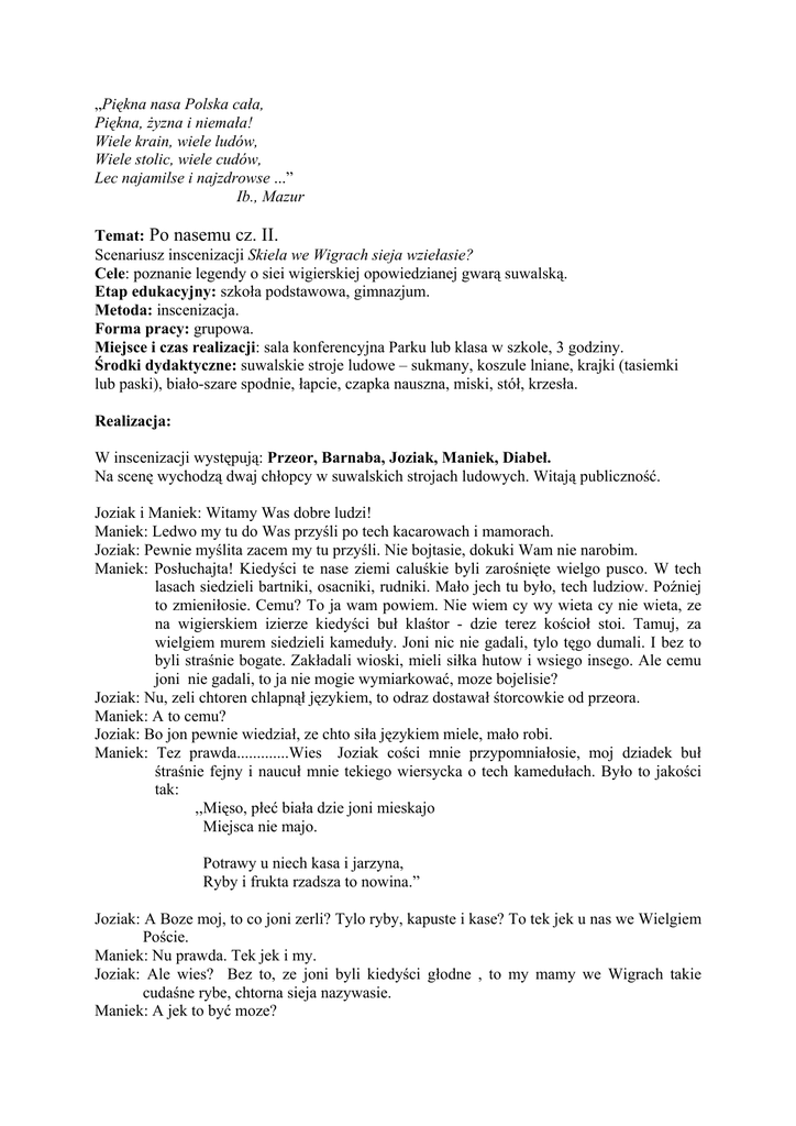 „Piękna nasa Polska cała, Piękna, żyzna i niemała! Wiele krain, wiele ludów, Wiele stolic, wiele cudów, Lec najamilse i najzdrowse ...” Ib., Mazur Temat: Po nasemu cz. II. Scenariusz inscenizacji Skiela we Wigrach sieja wziełasie? Cele: poznanie legendy o siei wigierskiej opowiedzianej gwarą suwalską. Etap edukacyjny: szkoła podstawowa, gimnazjum. Metoda: inscenizacja. Forma pracy: grupowa. Miejsce i czas realizacji: sala konferencyjna Parku lub klasa w szkole, 3 godziny. Środki dydaktyczne: suwalskie stroje ludowe – sukmany, koszule lniane, krajki (tasiemki lub paski), biało-szare spodnie, łapcie, czapka nauszna, miski, stół, krzesła. Realizacja: W inscenizacji występują: Przeor, Barnaba, Joziak, Maniek, Diabeł. Na scenę wychodzą dwaj chłopcy w suwalskich strojach ludowych. Witają publiczność. Joziak i Maniek: Witamy Was dobre ludzi! Maniek: Ledwo my tu do Was przyśli po tech kacarowach i mamorach. Joziak: Pewnie myślita zacem my tu przyśli. Nie bojtasie, dokuki Wam nie narobim. Maniek: Posłuchajta! Kiedyści te nase ziemi caluśkie byli zarośnięte wielgo pusco. W tech lasach siedzieli bartniki, osacniki, rudniki. Mało jech tu było, tech ludziow. Poźniej to zmieniłosie. Cemu? To ja wam powiem. Nie wiem cy wy wieta cy nie wieta, ze na wigierskiem izierze kiedyści buł klaśtor - dzie terez kościoł stoi. Tamuj, za wielgiem murem siedzieli kameduły. Joni nic nie gadali, tylo tęgo dumali. I bez to byli straśnie bogate. Zakładali wioski, mieli siłka hutow i wsiego insego. Ale cemu joni nie gadali, to ja nie mogie wymiarkować, moze bojelisie? Joziak: Nu, zeli chtoren chlapnął językiem, to odraz dostawał śtorcowkie od przeora. Maniek: A to cemu? Joziak: Bo jon pewnie wiedział, ze chto siła językiem miele, mało robi. Maniek: Tez prawda.............Wies Joziak cości mnie przypomniałosie, moj dziadek buł śtraśnie fejny i naucuł mnie tekiego wiersycka o tech kamedułach. Było to jakości tak: ,,Mięso, płeć biała dzie joni mieskajo Miejsca nie majo. Potrawy u niech kasa i jarzyna, Ryby i frukta rzadsza to nowina.” Joziak: A Boze moj, to co joni zerli? Tylo ryby, kapuste i kase? To tek jek u nas we Wielgiem Poście. Maniek: Nu prawda. Tek jek i my. Joziak: Ale wies? Bez to, ze joni byli kiedyści głodne , to my mamy we Wigrach takie cudaśne rybe, chtorna sieja nazywasie. Maniek: A jek to być moze? Joziak: Oj, lelak ty Maniek lelak. Ja to tek sobie miarkuje: zeli joni, te kameduły, nie zerli mięsa, to byli straśnie głodne i złe. Maniek: A wies, moze i tak było. Powiedajo, ze jenego dnia jech przeor w misce pocmerał i nie zer. Znerwowałsie tez straśnie i odraz kazał przyrychtować takie jekieście cudaśne rybe, znacysie sieje. Joziak: Nu ty, Maniek, zeli joni nic nie gadali, to jek joni dogadywalisie? Roztołkuj ty mnie co i jek. Maniek: Nu durny ty. Joni pewnie pokazuwali sobie na migi. Miarkujes? Zeli jesce nie, to obac. Scenka pantomimiczna. Przeor siedzi przy stole. Kucharz niesie miski, stawia je na stole. Jest zadowolony z siebie. Przeor zaczyna jeść, nagle wypluwa, gwałtownie odsuwa talerz i wymachuje ręką w stronę kucharza. Wystraszony kucharz odsuwa się do tyłu. Obaj zastygają w bezruchu. Joziak: Nu dobra, ale jek jon pokazał, zep jemu sieje przyrychtowali? Maniek: Nu jo, ja tez miarkuje ze joni musieli trochie gadać. I pewnie było to tak: (wyciąga rękę w stronę przeora). Przeor: (wymachując ręką w stronę kucharza) Zeli nie przyrychtuje mnie tu siei, to jek naodzieje ojculka bez chrzybietny gnat... (Przeor wychodzi. Kucharz siada i zamyśla się). Joziak: Biedny kucharz zafrasowałsie nie na zarty, dumał co by tu zrobić. Dumał, dumał, az jemu we łbie lasowałosie. I jek w sam raz diabuł juzej jestuj kole niego. Kapota na niem carna, w kapelusie, jeden kamas, jene kopyto i powieda tak: Diabeł: Niestrachajsie ojculku. Mas tu cyrograf, cierknij, dusa będzie moja, sieja będzie twoja. Kucharz: Na chorob ci moja dusa? Stara, letka, zderta jek podeswa... Diabeł: Dusa jek smoła, cem starsa tem lepsa (diabeł śmieje się). Kucharz: Ty lejes zęby, a la mnie i tak kaput, i tak. (kucharz wyciera pot z czoła, zastanawia się jeszcze chwilę i wreszcie mówi zrezygnowanym głosem) Nu, ciort z tobo, dawaj ten cyrograf (podpisuje). Tylo sieja w trymiga ma być. A terez prec z tela niecysta siło! Ty, ty ciortowe nasienie! Maniek: Satana jekby chto z procy strzeluł. Tylo sum jek poper do Włoch Kucharz: A Boze, a Boze co ja najlepsego zrobiuł (podchodzi do wchodzącego przeora). Ojculku, ojculku, poredź jekby tu diabła do wiatrzu wystawić? Przeor: Durny ty Barnaba durny ze swojo duse zaprzedał. Jenak poredze tobie. Posłuchaj ty mnie. Diabla moc przepada zeli wybije północ. Idź ty terez na wieze, weź jekie tyckie i prentko nastawis skazowkie na dwunaste godzine, jek tylo ciortowe nasienie nad Wigroma zasumi (przeor wychodzi, Barnaba siedzi przysypiając i budząc się co chwila). Joziak: Siedzi Barnaba kole zegara , sen jego bierze, w giembe scypiesie, zep nie zadrzymnąć, az tu trzydzieście minut przed północo słychać jekieście nawałnice. To satan leci ze siejo, tylo drzewa uginajosie. Maniek: Ojculek raz-dwa posunoł skazowkie i zegar zacoł wybijać północ. Diabeł: A jeki ciort? (krzyczy patrząc na zegar i na zakonnika, wyciąga rękę, chce złapać Barnabę, sieja wypada mu z rąk). Joziak: I tak to było, sieja chlapść do wody i juz. I stela jestuj jona we wigierskiem izierze. Namnozyłosie jej tamuj a namnozyłosie. Maniek: Diabuł mało co w śmierdzące smołe ze złości nie zamieniułsie. Joziak: A Barnaba drugieraz juzej duso nie andlował. Maniek i Joziak: No i widzita ludzi, jek to bieda koznego ucy rozumu.