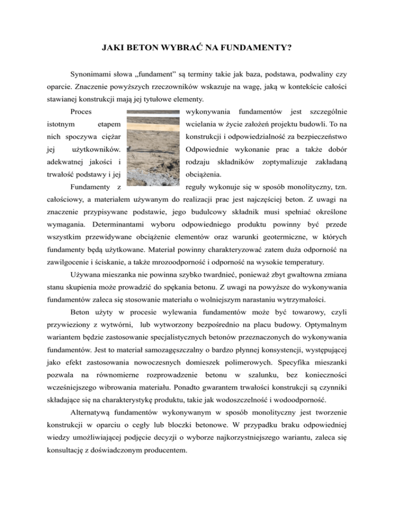 JAKI BETON WYBRAĆ NA FUNDAMENTY? Synonimami słowa „fundament” są terminy takie jak baza, podstawa, podwaliny czy oparcie. Znaczenie powyższych rzeczowników wskazuje na wagę, jaką w kontekście całości stawianej konstrukcji mają jej tytułowe elementy. Proces istotnym wykonywania fundamentów jest szczególnie etapem wcielania w życie założeń projektu budowli. To na nich spoczywa ciężar konstrukcji i odpowiedzialność za bezpieczeństwo jej Odpowiednie wykonanie prac a także dobór użytkowników. adekwatnej jakości i rodzaju trwałość podstawy i jej obciążenia. Fundamenty z składników zoptymalizuje zakładaną reguły wykonuje się w sposób monolityczny, tzn. całościowy, a materiałem używanym do realizacji prac jest najczęściej beton. Z uwagi na znaczenie przypisywane podstawie, jego budulcowy składnik musi spełniać określone wymagania. Determinantami wyboru odpowiedniego produktu powinny być przede wszystkim przewidywane obciążenie elementów oraz warunki geotermiczne, w których fundamenty będą użytkowane. Materiał powinny charakteryzować zatem duża odporność na zawilgocenie i ściskanie, a także mrozoodporność i odporność na wysokie temperatury. Używana mieszanka nie powinna szybko twardnieć, ponieważ zbyt gwałtowna zmiana stanu skupienia może prowadzić do spękania betonu. Z uwagi na powyższe do wykonywania fundamentów zaleca się stosowanie materiału o wolniejszym narastaniu wytrzymałości. Beton użyty w procesie wylewania fundamentów może być towarowy, czyli przywieziony z wytwórni, lub wytworzony bezpośrednio na placu budowy. Optymalnym wariantem będzie zastosowanie specjalistycznych betonów przeznaczonych do wykonywania fundamentów. Jest to materiał samozagęszczalny o bardzo płynnej konsystencji, występującej jako efekt zastosowania nowoczesnych domieszek polimerowych. Specyfika mieszanki pozwala na równomierne rozprowadzenie betonu w szalunku, bez konieczności wcześniejszego wibrowania materiału. Ponadto gwarantem trwałości konstrukcji są czynniki składające się na charakterystykę produktu, takie jak wodoszczelność i wodoodporność. Alternatywą fundamentów wykonywanym w sposób monolityczny jest tworzenie konstrukcji w oparciu o cegły lub bloczki betonowe. W przypadku braku odpowiedniej wiedzy umożliwiającej podjęcie decyzji o wyborze najkorzystniejszego wariantu, zaleca się konsultację z doświadczonym producentem.