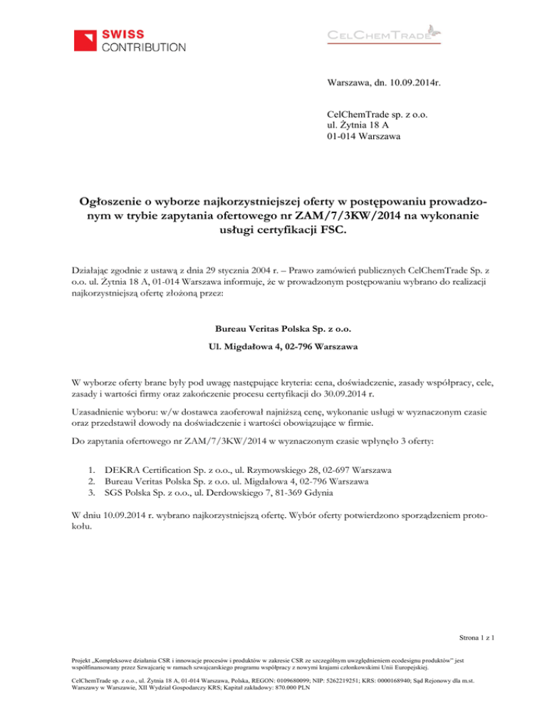 Warszawa, dn. 10.09.2014r. CelChemTrade sp. z o.o. ul. Żytnia 18 A 01-014 Warszawa Ogłoszenie o wyborze najkorzystniejszej oferty w postępowaniu prowadzonym w trybie zapytania ofertowego nr ZAM/7/3KW/2014 na wykonanie usługi certyfikacji FSC. Działając zgodnie z ustawą z dnia 29 stycznia 2004 r. – Prawo zamówień publicznych CelChemTrade Sp. z o.o. ul. Żytnia 18 A, 01-014 Warszawa informuje, że w prowadzonym postępowaniu wybrano do realizacji najkorzystniejszą ofertę złożoną przez: Bureau Veritas Polska Sp. z o.o. Ul. Migdałowa 4, 02-796 Warszawa W wyborze oferty brane były pod uwagę następujące kryteria: cena, doświadczenie, zasady współpracy, cele, zasady i wartości firmy oraz zakończenie procesu certyfikacji do 30.09.2014 r. Uzasadnienie wyboru: w/w dostawca zaoferował najniższą cenę, wykonanie usługi w wyznaczonym czasie oraz przedstawił dowody na doświadczenie i wartości obowiązujące w firmie. Do zapytania ofertowego nr ZAM/7/3KW/2014 w wyznaczonym czasie wpłynęło 3 oferty: 1. DEKRA Certification Sp. z o.o., ul. Rzymowskiego 28, 02-697 Warszawa 2. Bureau Veritas Polska Sp. z o.o. ul. Migdałowa 4, 02-796 Warszawa 3. SGS Polska Sp. z o.o., ul. Derdowskiego 7, 81-369 Gdynia W dniu 10.09.2014 r. wybrano najkorzystniejszą ofertę. Wybór oferty potwierdzono sporządzeniem protokołu. Strona 1 z 1 Projekt „Kompleksowe działania CSR i innowacje procesów i produktów w zakresie CSR ze szczególnym uwzględnieniem ecodesignu produktów” jest współfinansowany przez Szwajcarię w ramach szwajcarskiego programu współpracy z nowymi krajami członkowskimi Unii Europejskiej. CelChemTrade sp. z o.o., ul. Żytnia 18 A, 01-014 Warszawa, Polska, REGON: 0109680099; NIP: 5262219251; KRS: 0000168940; Sąd Rejonowy dla m.st. Warszawy w Warszawie, XII Wydział Gospodarczy KRS; Kapitał zakładowy: 870.000 PLN