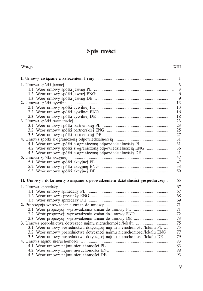 Spis treści Wstęp .............................................................................................................................. XIII I. Umowy związane z założeniem firmy ...................................................................... 1 1. Umowa spółki jawnej .................................................................................................. 3 1.1. Wzór umowy spółki jawnej pl ........................................................................... 3 1.2. Wzór umowy spółki jawnej ENG ..................................................................... 6 1.3. Wzór umowy spółki jawnej DE ........................................................................ 9 2. Umowa spółki cywilnej ............................................................................................... 13 2.1. Wzór umowy spółki cywilnej pl ...................................................................... 13 2.2. Wzór umowy spółki cywilnej ENG .................................................................. 16 2.3. Wzór umowy spółki cywilnej DE ..................................................................... 18 3. Umowa spółki partnerskiej ......................................................................................... 23 3.1. Wzór umowy spółki partnerskiej PL ................................................................. 23 3.2. Wzór umowy spółki partnerskiej ENG ............................................................. 25 3.3. Wzór umowy spółki partnerskiej DE ................................................................ 27 4. Umowa spółki z ograniczoną odpowiedzialnością .................................................... 31 4.1. Wzór umowy spółki z ograniczoną odpowiedzialnością PL ............................ 31 4.2. Wzór umowy spółki z ograniczoną odpowiedzialnością ENG ........................ 36 4.3. Wzór umowy spółki z ograniczoną odpowiedzialnością DE ........................... 41 5. Umowa spółki akcyjnej .............................................................................................. 47 5.1. Wzór umowy spółki akcyjnej PL ...................................................................... 47 5.2. Wzór umowy spółki akcyjnej ENG .................................................................. 53 5.3. Wzór umowy spółki akcyjnej DE ..................................................................... 59 II. Umowy i dokumenty związane z prowadzeniem działalności gospodarczej ..... 65 1. Umowa sprzedaży ........................................................................................................ 67 1.1. Wzór umowy sprzedaży PL ............................................................................... 67 1.2. Wzór umowy sprzedaży ENG ........................................................................... 68 1.3. Wzór umowy sprzedaży DE .............................................................................. 69 2. Propozycja wprowadzenia zmian do umowy ............................................................. 71 2.1. Wzór propozycji wprowadzenia zmian do umowy PL .................................... 71 2.2. Wzór propozycji wprowadzenia zmian do umowy ENG ................................. 72 2.3. Wzór propozycji wprowadzenia zmian do umowy DE .................................... 73 3. Umowa pośrednictwa dotycząca najmu nieruchomości/lokalu .................................. 75 3.1. Wzór umowy pośrednictwa dotyczącej najmu nieruchomości/lokalu PL ....... 75 3.2. Wzór umowy pośrednictwa dotyczącej najmu nieruchomości/lokalu ENG .... 77 3.3. Wzór umowy pośrednictwa dotyczącej najmu nieruchomości/lokalu DE ....... 79 4. Umowa najmu nieruchomości ..................................................................................... 83 4.1. Wzór umowy najmu nieruchomości PL ............................................................ 83 4.2. Wzór umowy najmu nieruchomości ENG ........................................................ 88 4.3. Wzór umowy najmu nieruchomości DE ........................................................... 93 V Spis treści 5. Umowa najmu samochodu ......................................................................................... 99 5.1. Wzór umowy najmu samochodu PL ................................................................. 99 5.2. Wzór umowy najmu samochodu ENG ............................................................. 101 5.3. Wzór umowy najmu samochodu DE ................................................................ 104 6. Umowa pożyczki ........................................................................................................ 107 6.1. Wzór umowy pożyczki PL ................................................................................ 107 6.2. Wzór umowy pożyczki ENG ............................................................................. 108 6.3. Wzór umowy pożyczki DE ................................................................................ 109 7. Umowa użyczenia ........................................................................................................ 111 7.1. Wzór umowy użyczenia PL ............................................................................... 111 7.2. Wzór umowy użyczenia ENG ........................................................................... 113 7.3. Wzór umowy użyczenia DE .............................................................................. 116 8. Umowa dzierżawy ........................................................................................................ 119 8.1. Wzór umowy dzierżawy PL .............................................................................. 119 8.2. Wzór umowy dzierżawy ENG ........................................................................... 121 8.3. Wzór umowy dzierżawy DE ....................