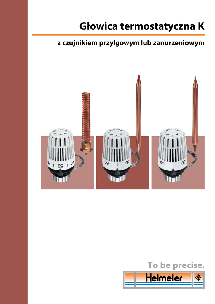 Głowica termostatyczna K z czujnikiem przylgowym lub zanurzeniowym To be precise. Głowica termostatyczna K z wbudowanym lub zdalnym czujnikiem Opis Głowica termostatyczna HEIMEIER K z wypełnionym cieczą czujnikiem przylgowym lub zanurzeniowym (całkowita długość 157 mm) lub ze spiralnym czujnikiem zanurzeniowym (¦� x 118 mm). Długość rurki kapilarnej — 2 m Pokrętło białe RAL 9016. Odpowiednia dla instalacji na wszystkich korpusach zaworów termostatycznych firmy HEIMEIER, trójdrogowych zaworach przełączających oraz trójdrogowych zaworach mieszających. Głowice termostatyczne 6402-00/ 6402-09/6412/6602/6662 mogą być użyte w połączeniu z oprawą o dużym współczynniku przewodnictwa jako czujnik przylgowy lub z tulejką zanurzeniową jako czujnik zanurzeniowy. Głowica termostatyczna 6672 jako czujnik zanurzeniowy bez tulejki zanurzeniowej przymocowanej do rurki poprzez klamry łączące. Zakres nastaw: 10° C to 40° C, 20° C do 50° C, 20° C do 70° C, 40° C do 70° C lub 60° C do 90° C. Maksymalna temperatura czujnika 50° C z głowicą termostatyczną 6412, 60° C z głowicą termostatyczną 6402, 80° C z głowicą termostatyczną 6602 90° C z głowicą termostatyczną 6672 oraz 100° C z głowicą termostatyczną 6662. Ukryte ograniczenie nastawy górnego i dolnego zakresu temperatury lub blokada danej nastawy za pomocą klipsów ograniczających. Zastosowanie z oprawą o dużym współczynniku przewodnictwa z tulejką zanurzeniową (akcesoria) jako czujnik zanurzeniowy ze spiralnym czujnikiem zanurzeniowym ¦ 11 mm Działanie Regulacja zadanej temperatury bez energii pomocniczej w zakresie wymaganego pasma proporcjonalności. Mierzony przez czujnik przyrost temperatury powoduje zamknięcie termostatycznego zaworu grzejnikowego. Z trójdrogowym zaworem przełączającym, przepływ przelotowy jest zamykany, a kątowy przepływ przez obejście jest otwierany. Z trójdrogowym zaworem mieszającym firmy HEIMEIER przepływ kątowy jest zamykany, a przepływ przelotowy jest otwierany. Nastawa Nr. kat. 6402-00.500 / 6402-09.500 6602-00.500 6672-00.500 Wartość nastawy 20 30 40 50 40 50 60 70 20 30 40 50 60 70 Wartość nastawy [°C] 20 30 40 50 40 50 60 70 20 30 40 50 60 70 Nr. kat. 6412-09.500 6662-00.500 Wartość nastawy 10 20 30 40 60 70 80 90 Wartość nastawy [°C] 10 20 30 40 60 70 80 90 2 Głowica termostatyczna K z wbudowanym lub zdalnym czujnikiem Zastosowanie — regulacja temperatury wody w podgrzewaczach wody użytkowej —o graniczenie minimalnej temperatury wzgl. podnoszenie temperatury na powrocie — stała regulacja temperatury na zasilaniu w przypadku kombinowanych systemów ogrzewania podłogowego / grzejnikowego — r egulacja temperatury na zasilaniu po stronie wtórnej wymiennika ciepła — r egulacja temperatury nawiewanego powietrza w systemach ogrzewania nawiewowego — ograniczenie maksymalnej temperatury na zasilaniu lub powrocie Specjalna cecha głowicy termostatycznej K ze spiralnym czujnikiem zanurzeniowym to błyskawiczny czas reakcji (około 3 do 5 sekund) - prawdziwa korzyść w błyskawicznie regulowanych systemach, np. z płytowymi wymiennikami ciepła. Przykłady zastosowań 7 7 d a 5 Regulacja poprzez mieszanie stosowana w systemach ogrzewania podłogowego połączonych z obiegami grzewczymi o wysokiej temperaturze wody zasilającej 7 c Regulacja ilości w celu utrzymania stałej temperatury wody w podgrzewaczu wody użytkowej b 7 1 Zbiornik wody użytkowej 2 Nagrzewnica powietrza 3 Obieg grzewczy 4 Rozdzielacz strefowy 5 Wymiennik ciepła 6 Zawór równoważący TA STAD 7 Zawór termostatyczny 3 6 Regulacja poziomu przepływu dla stałej temperatury zasilania na obiegu wtórnym wymiennika ciepła poprzez spiralny czujnik zanurzeniowy 6 7 6 Regulacja ilości w celu utrzymania stałej temperatury powietrza z nagrzewnicy powietrza Regulacja poprzez mieszanie w celu utrzymania stałej temperatury na zasilaniu odbiornika ciepła Numery katalogowe Rysunek Model Zakres wartości Długość kapilary zadanej Nr. kat. Głowica termostatyczna K z oprawą o dużym współ. przewodzenia i sprężyną spiralną 20 °C — 50 °C 2 m 6402-00.500 Głowica termostatyczna K bez osprzętu 10 °C — 40 °C 20 °C — 50 °C 40 °C — 70 °C 60 °C — 90 °C 2 m 2 m 2 m 2 m 6412-09.500 6402-09.500 6602-00.500 6662-00.500 Tuleja zanurzeniowa, mosiądz R� x 186 mm długość całkowita 6602-00.363 6402-00.200 20 °C — 70 °C 6672-00.500 3 4 Oprawa o dużym współ. przewodzenia oraz spiralna sprężyna Głowica termostatyczna K ze spiralnym czujnikiem zanurzeniowym 2 m 3 3 4 4 R � x 118 mm całkowitej długości Długości odpowiadają danym podanym w broszurze „Głowice termostatyczne”. 3 Głowica termostatyczna K z wbudowanym lub zdalnym czujnikiem Dane techniczne Wykres Dodatkowe informacje w broszurach „Korpusy zaworów termostatycznych“, „Trójdrogowy zawór przełączający“ oraz „Trójdrogowy zawór mieszający“. DN 10 DN 15 DN 20 DN 25 DN 32 ET (kątowy) DT (prosty) ET (kątowy) DT (prosty) ET (kątowy) DT (prosty) ET (kątowy) DT (prosty) ET (kątowy) DT (prosty) Dopuszczalne nadciśnienie robocze PB [bar] Dopuszczalne ciśnienie różnicowe Δp [bar] 120 10 1.00 0.39 0.68 0.92 1.08 1.25 0.39 0.68 0.92 1.13 1.35 0.62 1.31 1.81 2.18 2.50 Przykład obliczeń Szukane: NW korpus zaworu termostatycznego 1.05 1.92 2.61 3.20 5.70 1.11 2.37 3.19 3.82 6.70 DN 15 Zawór przełączający 0.60 1.20 1.71 2.10 DN 20 Zawór przełączający 0.70 1.50 2.39 DN 25 1.08 2.28 3.48 Zawór przełączający Dopuszcz. temperatura robocza TB [°C] 120 10 0.25 2.47 120 10 1.20 3.10 3.48 120 10 0.75 4.62 5.12 120 10 0.50 DN 15 Zawór mieszający 3 1.40 2 2.50 120 10 1.20 3 DN 20 Zawór mieszający 1.90 2 3.50 120 10 0.75 DN 25 Zawór mieszający 3 2.60 2 4.60 120 10 0.50 3 2 6.40 120 10 0.25 DN 32 Zawór mieszający Dla trójdrogowego zaworu mieszającego wartości kv odpowiadają przepływowi w kierunku kątowym B-AB lub w kieru