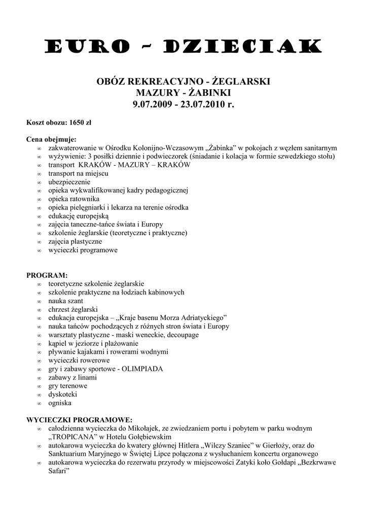 EURO – DZIECIAK OBÓZ REKREACYJNO - śEGLARSKI MAZURY - śABINKI 9.07.2009 - 23.07.2010 r. Koszt obozu: 1650 zł Cena obejmuje: • zakwaterowanie w Ośrodku Kolonijno-Wczasowym „śabinka” w pokojach z węzłem sanitarnym • wyŜywienie: 3 posiłki dziennie i podwieczorek (śniadanie i kolacja w formie szwedzkiego stołu) • transport KRAKÓW - MAZURY – KRAKÓW • transport na miejscu • ubezpieczenie • opieka wykwalifikowanej kadry pedagogicznej • opieka ratownika • opieka pielęgniarki i lekarza na terenie ośrodka • edukację europejską • zajęcia taneczne-tańce świata i Europy • szkolenie Ŝeglarskie (teoretyczne i praktyczne) • zajęcia plastyczne • wycieczki programowe PROGRAM: • teoretyczne szkolenie Ŝeglarskie • szkolenie praktyczne na łodziach kabinowych • nauka szant • chrzest Ŝeglarski • edukacja europejska – „Kraje basenu Morza Adriatyckiego” • nauka tańców pochodzących z róŜnych stron świata i Europy • warsztaty plastyczne - maski weneckie, decoupage • kąpiel w jeziorze i plaŜowanie • pływanie kajakami i rowerami wodnymi • wycieczki rowerowe • gry i zabawy sportowe - OLIMPIADA • zabawy z linami • gry terenowe • dyskoteki • ogniska WYCIECZKI PROGRAMOWE: • całodzienna wycieczka do Mikołajek, ze zwiedzaniem portu i pobytem w parku wodnym „TROPICANA” w Hotelu Gołębiewskim • autokarowa wycieczka do kwatery głównej Hitlera „Wilczy Szaniec” w GierłoŜy, oraz do Sanktuarium Maryjnego w Świętej Lipce połączona z wysłuchaniem koncertu organowego • autokarowa wycieczka do rezerwatu przyrody w miejscowości Zatyki koło Gołdapi „Bezkrwawe Safari”