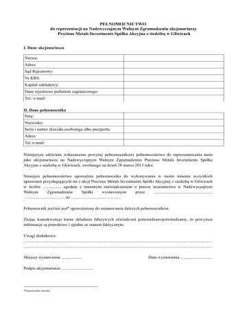 PEŁNOMOCNICTWO do reprezentacji na Nadzwyczajnym Walnym Zgromadzeniu akcjonariuszy Precious Metals Investments Spółka Akcyjna z siedzibą w Gliwicach I. Dane akcjonariusza Nazwa: Adres: Sąd Rejestrowy: Nr KRS: Kapitał zakładowy: Dane rejestrowe podmiotu zagranicznego: Tel./ e-mail: II. Dane pełnomocnika Imię: Nazwisko: Seria i numer dowodu osobistego albo paszportu: Adres: Tel./e-mail: Niniejszym udzielam wskazanemu powyżej pełnomocnikowi pełnomocnictwa do reprezentowania mnie jako akcjonariusza na Nadzwyczajnym Walnym Zgromadzeniu Precious Metals Investments Spółka Akcyjna z siedzibą w Gliwicach, zwołanego na dzień 28 marca 2013 roku. Niniejsze pełnomocnictwo upoważnia pełnomocnika do wykonywania w moim imieniu wszystkich uprawnień przysługujących mi z akcji Precious Metals Investments Spółki Akcyjnej z siedzibą w Gliwicach w liczbie …............. zgodnie z imiennym zaświadczeniem o prawie uczestnictwa w Nadzwyczajnym Walnym Zgromadzeniu Spółki wystawionym przez ….................................................. ….................................. nr ….......................................... Pełnomocnik jest/nie jest* upoważniony do ustanawiania dalszych pełnomocników. Znając konsekwencje karne składania fałszywych oświadczeń potwierdzam/potwierdzamy, że powyższe informacje są prawdziwe i zgodne ze stanem faktycznym. Uwagi dodatkowe: …......................................................................................................................................................................... ............................................................................................................................................................................. Miejsce wystawienia …............... Podpis akcjonariusza …......................... *Niepotrzebne skreślić Data wystawienia ….........................