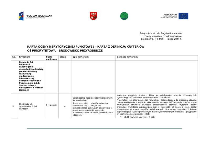 Załącznik nr 8.1 do Regulaminu naboru i oceny wniosków o dofinansowanie projektów (…) z dnia … lutego 2014 r. KARTA OCENY MERYTORYCZNEJ PUNKTOWEJ – KARTA Z DEFINICJĄ KRYTERIÓW OŚ PRIORYTETOWA – ŚRODOWISKO PRZYRODNICZE Lp. Kryterium Skala punktowa Waga Opis kryterium Definicja kryterium Działanie 6.1 Poprawa i zapobieganie degradacji środowiska poprzez budowę, rozbudowę i modernizację infrastruktury ochrony środowiska. Poddziałanie 6.1.3. System odbioru nieczystości z łodzi na jeziorach Ograniczenie ilości odpadów kierowanych na składowisko. 1 Eliminacja lub ograniczenie ilości odpadów. 0-4 punkty 4 Suma wszystkich rodzajów odpadów (niebezpiecznych i innych niż niebezpieczne) zebranych selektywnie w ramach ekoprzystani i następnie przekazanych do zakładów przetwarzania odpadów. Kryterium punktuje projekty, które w największym stopniu eliminują lub ograniczają ilość odpadów kierowanych do składowania. Priorytetem jest skierowanie jak największej ilości odpadów do procesów odzysku i unieszkodliwiania, innych niż składowanie. Dlatego ilość odpadów o którą został zmniejszony strumień odpadów składowanych stanowi kryterium oceny projektów. Punktacja przyznawana jest w zależności od ilości, o którą został zmniejszony strumień odpadów składowanych. Stworzono przedziały ilościowe odpowiadające ilości ograniczonych bądź wyeliminowanych odpadów i przypisano im konkretną ilość punktów. I tak: 12,01 Mg/rok i powyżej – 4 pkt; Lp. Kryterium Skala punktowa Waga Opis kryterium Definicja kryterium Ograniczenie ilości ścieków wprowadzanych do środowiska. 2 Eliminacja lub ograniczenie ilości ścieków. 0-4 punkty 4 Sumaryczna ilość ścieków odebranych z jednostek pływających i odprowadzonych do oczyszczalni bezpośrednio poprzez system kanalizacji lub zebranych do bezodpływowego zbiornika i przekazanych do punktu zlewnego oczyszczalni ścieków. 8,01 – 12,00 Mg/rok – 3 pkt; 4,01 – 8,00 Mg/rok – 2 pkt; 2,01 – 4,00 Mg/rok – 1 pkt; do 2,0 Mg/rok - 0 pkt. Kryterium punktuje projekty, które w największym stopniu eliminują lub ograniczają ilość ścieków wprowadzanych bezpośrednio do środowiska. Priorytetem jest odebranie ścieków z jak największej ilości jednostek pływających. Punktacja przyznawana jest w zależności od ilości ścieków odbieranych przez ekomarinę. Stworzono przedziały ilościowe odpowiadające ilości ograniczonych bądź wyeliminowanych ścieków i przypisano im konkretną ilość punktów. Przyznawana punktacja: 120,01 m3/rok i powyżej – 4 pkt; 80,01 – 120 m3/rok – 3 pkt; 40,01 – 80 m3/rok – 2 pkt; 10,01 – 40 m3/rok – 1 pkt; do 10 m3/rok – 0 pkt.. 0 p. – do 10 m3/rok Kryterium punktuje ilości turystów oraz mieszkańców korzystających z ekomarin lub 3 4 5 Wpływ na zwiększenie poziomu bezpieczeństwa ludzi i środowiska. Ilość osób objętych działaniem w skali roku. 0-4 punkty Wskaźnik jednostkowych kosztów inwestycyjnych. 0-1 punkt Przygotowanie projektu – gotowość do realizacji inwestycji: a) 0-1 punkt b) 0-1 3 2 a) 2 b) 2 c) 1 Ilość turystów oraz mieszkańców korzystających z ekomarin lub zabezpieczanych przez sprzęt ratowniczy. Wartość wskaźnika w zł/łódź/rok. Całkowite nakłady inwestycyjne niezbędne do realizacji projektu w przeliczeniu na jednostkę pływającą obsługiwaną w ramach projektu. Kryterium punktuje przygotowanie projektu rozumiane jako gotowość do realizacji inwestycji. Najwięcej punktów zabezpieczanych w sprzęt ratowniczy. I tak punktacja przyznawana jest w następujący sposób: 10 001 i powyżej – 4 pkt; 5 001 – 10 000 – 3 pkt; 1 001 – 5 000 – 2 pkt; 200 -1 000 – 1 pkt; do 199 – 0 pkt. Kryterium punktuje całkowite nakłady inwestycyjne niezbędne do realizacji projektu w przeliczeniu na jednostkę pływającą obsługiwaną w ramach projektu. Przyznawana punktacja: poniżej 700 zł/łódź/rok - 1 pkt; powyżej 700 zł/łódź/rok – 0 pkt. Kryterium punktuje przygotowanie projektu rozumiane jako gotowość do realizacji inwestycji. 2 Lp. Kryterium a) własność gruntów, b) stan prawny beneficjenta, c) przygotowanie instytucjonalne do wdrażania, d) wartość zadań inwestycyjnych posiadających pozwolenia na budowę w stosunku do wartości wszystkich zadań, e) wartość kontraktów posiadających dokumentację przetargową w stosunku do całkowitej wartości projektu Skala punktowa punkt c) 0-1 punkt d) 0-4 punkty e) 0-4 punkty Waga d) 3 e) 2 Opis kryterium otrzymają projekty, których przygotowanie jest najbardziej zaawansowane. Przez stopień przygotowania projektu rozumie się uregulowanie własności gruntów, stanu prawnego beneficjenta, przygotowanie instytucjonalne do wdrażania projektu, zaawansowanie uzyskiwania pozwoleń na budowę oraz dokumentacji przetargowych. Definicja kryterium Przyznawana punktacja: a) własność gruntów uregulowana w 100% dla całego projektu– 1 pkt b) uregulowany stan prawny beneficjenta – 1 pkt c) przygotowanie instytucjonalne do wdrażania projektu - beneficjent otrzymuje punkt za powołanie Jednostki Realizującej Projekt oraz Pełnomocnika ds. Realizacji Projektu. Przygotowanie instytucjonalne weryfikowane będzie na podstawie złożonego oświadczenia lub uchwały odpowiedniego organu o powołaniu JRP (struktury odpowiedzialnej za realizację projektu) i Pełnomocnika. – 1 pkt d) zaawansowanie uzyskiwania pozwoleń na budowę Przez pozwolenie na budowę dla potrzeb oceny projektów przyjmuje się pozwolenie na budowę - w rozumieniu art. 28 ust. 1 ustawy z dnia 7 lipca 1994 r. Prawo budowlane (Dz. U. 06.156.1118), jak również zgłoszenie - w rozumieniu art. 30 ust. 1 ustawy z dnia 7 lipca 1994 r. Prawo budowlane (Dz. U. 06.156.1118). Stopień pozyskania pozwoleń na budowę weryfikowany będzie na podstawie złożonego oświadczenia o stosunku wartości zadań inwestycyjnych posiadających pozwolenia na budowę do wartości
