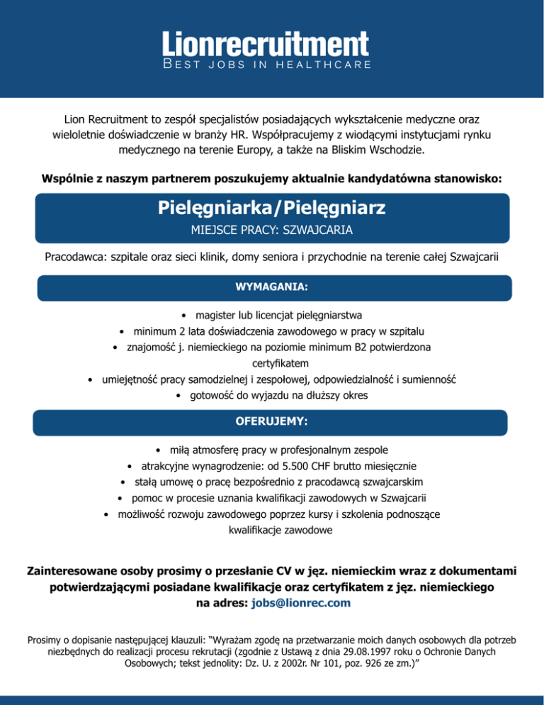 Lionrecruitment Best jobs in healthcare Lion Recruitment to zespół specjalistów posiadających wykształcenie medyczne oraz wieloletnie doświadczenie w branży HR. Współpracujemy z wiodącymi instytucjami rynku medycznego na terenie Europy, a także na Bliskim Wschodzie. Wspólnie z naszym partnerem poszukujemy aktualnie kandydatówna stanowisko: Pielęgniarka/Pielęgniarz MIEJSCE PRACY: SZWAJCARIA Pracodawca: szpitale oraz sieci klinik, domy seniora i przychodnie na terenie całej Szwajcarii WYMAGANIA: • magister lub licencjat pielęgniarstwa • minimum 2 lata doświadczenia zawodowego w pracy w szpitalu • znajomość j. niemieckiego na poziomie minimum B2 potwierdzona certyfikatem • umiejętność pracy samodzielnej i zespołowej, odpowiedzialność i sumienność • gotowość do wyjazdu na dłuższy okres OFERUJEMY: • miłą atmosferę pracy w profesjonalnym zespole • atrakcyjne wynagrodzenie: od 5.500 CHF brutto miesięcznie • stałą umowę o pracę bezpośrednio z pracodawcą szwajcarskim • pomoc w procesie uznania kwalifikacji zawodowych w Szwajcarii • możliwość rozwoju zawodowego poprzez kursy i szkolenia podnoszące kwalifikacje zawodowe Zainteresowane osoby prosimy o przesłanie CV w jęz. niemieckim wraz z dokumentami potwierdzającymi posiadane kwalifikacje oraz certyfikatem z jęz. niemieckiego na adres: [email protected] Prosimy o dopisanie następującej klauzuli: “Wyrażam zgodę na przetwarzanie moich danych osobowych dla potrzeb niezbędnych do realizacji procesu rekrutacji (zgodnie z Ustawą z dnia 29.08.1997 roku o Ochronie Danych Osobowych; tekst jednolity: Dz. U. z 2002r. Nr 101, poz. 926 ze zm.)”