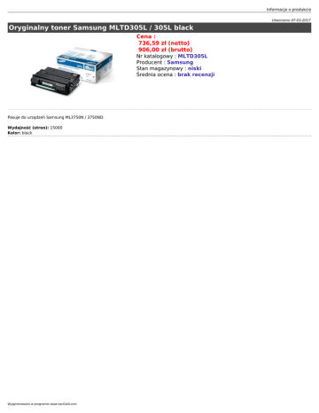 Informacje o produkcie Utworzono 07-03-2017 Oryginalny toner Samsung MLTD305L / 305L black Cena : 736,59 zł (netto) 906,00 zł (brutto) Nr katalogowy : MLTD305L Producent : Samsung Stan magazynowy : niski Średnia ocena : brak recenzji Pasuje do urządzeń Samsung ML3750N / 3750ND. Wydajność (stron): 15000 Kolor: black Wygenerowano w programie www.oscGold.com