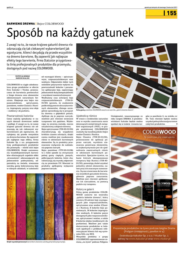 gpd24.pl gazeta przemysłu drzewnego | kwiecień 2011 | 155 Barwienie drewna | Bejce COLORWOOD Sposób na każdy gatunek patrycja nowak marcin skalski COLORWOOD to ciągle udoskonalana grupa produktów w ofercie firm Italcolor i Vicolor, przeznaczona do barwienia powierzchni z litego drewna oraz elementów okleinowanych naturalnym fornirem. Obejmuje ona bejce rozpuszczalnikowe, spirytusowe, pastelowe, wodne Classica i Rustica, impregnaty, patyny oraz oleje – meblowy i do parkietu. Powtarzalność kolorów Coraz częściej spotykamy w naszych domach drewniane meble i podłogi. Z uwagi na to, że nasze krajowe gatunki drewna nie odznaczają się tak ciekawymi wybarwieniami jak egzotyczne, decydujemy się przede wszystkim na drewno barwione. By zapewnić jak najlepsze tego efekty, firma Italcolor Sp. z o.o. przygotowała linię profesjonalnych produktów dla przemysłu – wśród nich bejce COLORWOOD. Dzięki zastosowaniu wyselekcjonowanych barwników eliminujących zupełnie efekt „krwawienia”, odznaczających się jednocześnie podwyższoną odpornością na światło, stworzono szeroką gamę kolorystyczną bejc w różnych układach, w zależności od wymagań klienta – spirytusowym, rozpuszczalnikowym oraz wodnym. Odpowiedni dobór tych nośników pozytywnie wpływa na powtarzalność kolorów i parametry aplikacyjne bejc, zapewniając jednocześnie dużą kompatybilność z wyrobami nawierzchniowymi. Wydłużony czas schnięcia bejc rozpuszczalnikowych (TIN-1001/30) sprawia, że znakomicie podkreślają one strukturę barwionych elementów, dlatego szczególnie sprawdzają się w przypadku drewna o głębokich porach. Aplikuje się je poprzez natrysk, możliwe jest również wcieranie tamponem lub pędzlem. Wybierając tę ostatnią metodę, mocno uwydatnimy usłojenie drewna. Bejce spirytusowe (TIN-20-01/30) charakteryzują się wyjątkowo krótkim czasem schnięcia, dzięki czemu możliwe jest maskowanie różnic w odcieniach barwionych elementów. Są to produkty przeznaczone wyłącznie do nakładania poprzez natrysk. Bejce pastelowe (TPV-20-01/08) to z kolei sposób na otrzymanie pełnej gamy ciepłych, jasnych, półkryjących kolorów, które charakteryzują się wysoką odpornością na promienie UV. Również te produkty aplikujemy wyłącznie poprzez natrysk. fot. Italcolor Z uwagi na to, że nasze krajowe gatunki drewna nie odznaczają się tak ciekawymi wybarwieniami jak egzotyczne, klienci decydują się przede wszystkim na drewno barwione. By zapewnić jak najlepsze efekty tego barwienia, firma Italcolor przygotowała linię profesjonalnych produktów dla przemysłu, dostępnych pod nazwą COLORWOOD. Pełną gamę produktów COLORWOOD zawarto we wzorniku „galeria kolorów drewna”. Ujednolicą różnice W trosce o środowisko naturalne oraz w wyniku zaostrzania norm dotyczących emisji lotnych związków organicznych (VOC), w grupie produktowej COLORWOOD znalazły się wysokiej jakości bejce wodne Classica i Rustica. Bejce Classica (TIN-30-01/30), przeznaczone do aplikacji poprzez natrysk, wyróżnia nieznaczna penetracja elementów, co wykorzystywane jest do ujednolicenia ewentualnych różnic w odcieniach barwionych powierzchni. Specjalne żywice, na bazie których skomponowano receptury bejc Rustica (TIN-4001/30), pozwalają z kolei uzyskać jednolity odcień elementów, nawet przy ich znacznym namoczeniu. Są one stworzone do barwienia wszelkich gatunków drewna, głównie poprzez zanurzenie. Możliwe jest również aplikowanie ich natryskiem, za pomocą pędzla czy tamponu. fot. Italcolor Kolory w galerii Dzięki wyselekcjonowanym barwnikom stworzono szeroką gamę kolorystyczną bejc. Pełną gamę produktów COLORWOOD zawarto we wzorniku „galeria kolorów drewna”, który zawiera 30 odcieni bejc występujących jako rozpuszczalnikowe, spirytusowe oraz wodne (Classica i Rustica), 8 kolorów bejc pastelowych, 16 kolorów impregnatów wodnych, 8 kolorów patyn dostępnych jako rozpuszczalnikowe, spirytusowe i wodne, a także 8 kolorów olejów (meblowych i do parkietów). Możliwe jest także dostarczenie produktów w kolorach zgodnych z próbkami referencyjnymi klienta lub wg systemów RAL czy NCS. Wszystkie produkty z grupy COLORWOOD zaprezentowane zostaną „na żywo” podczas Poligonu Umiejętności, towarzyszącego co roku targom DREMA. Z przedstawicielami Italcolor będzie można spotkać się w trakcie trwania tar- gów w pawilonie 4, na stoisku nr 44. Tam również będzie można uzyskać pełną informację na temat całej linii produktów. n