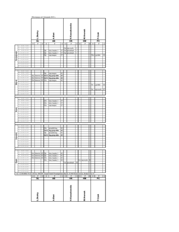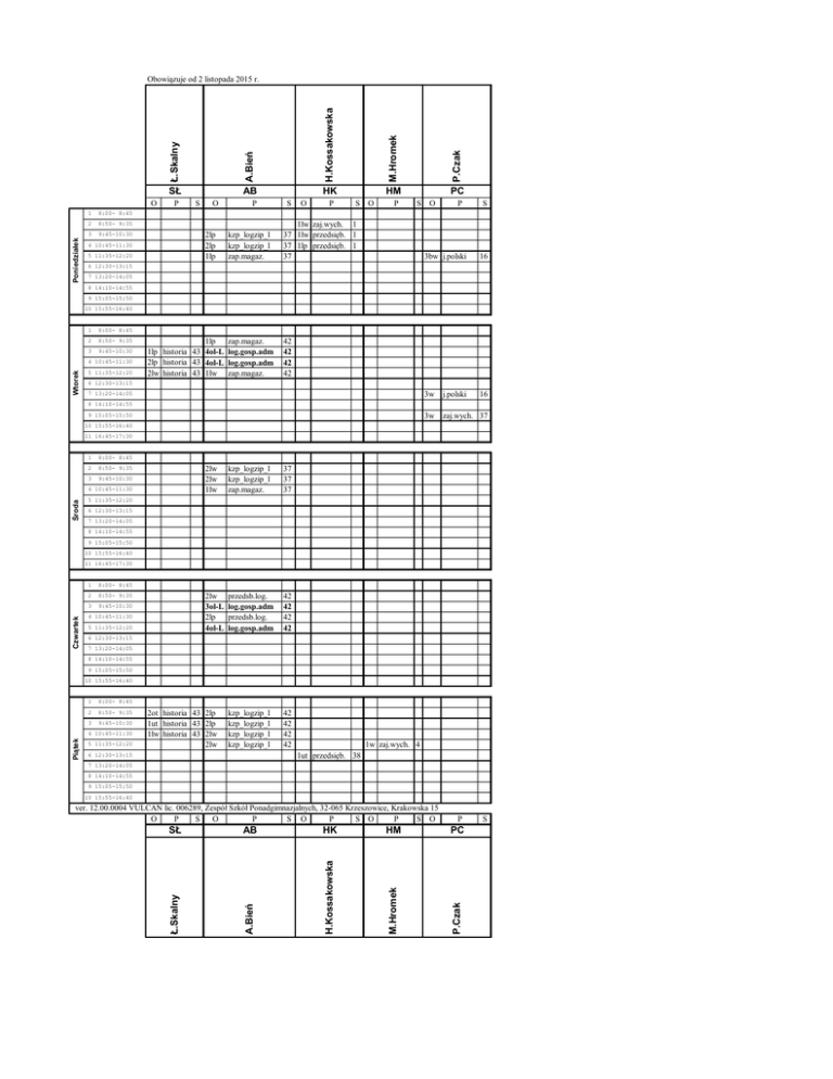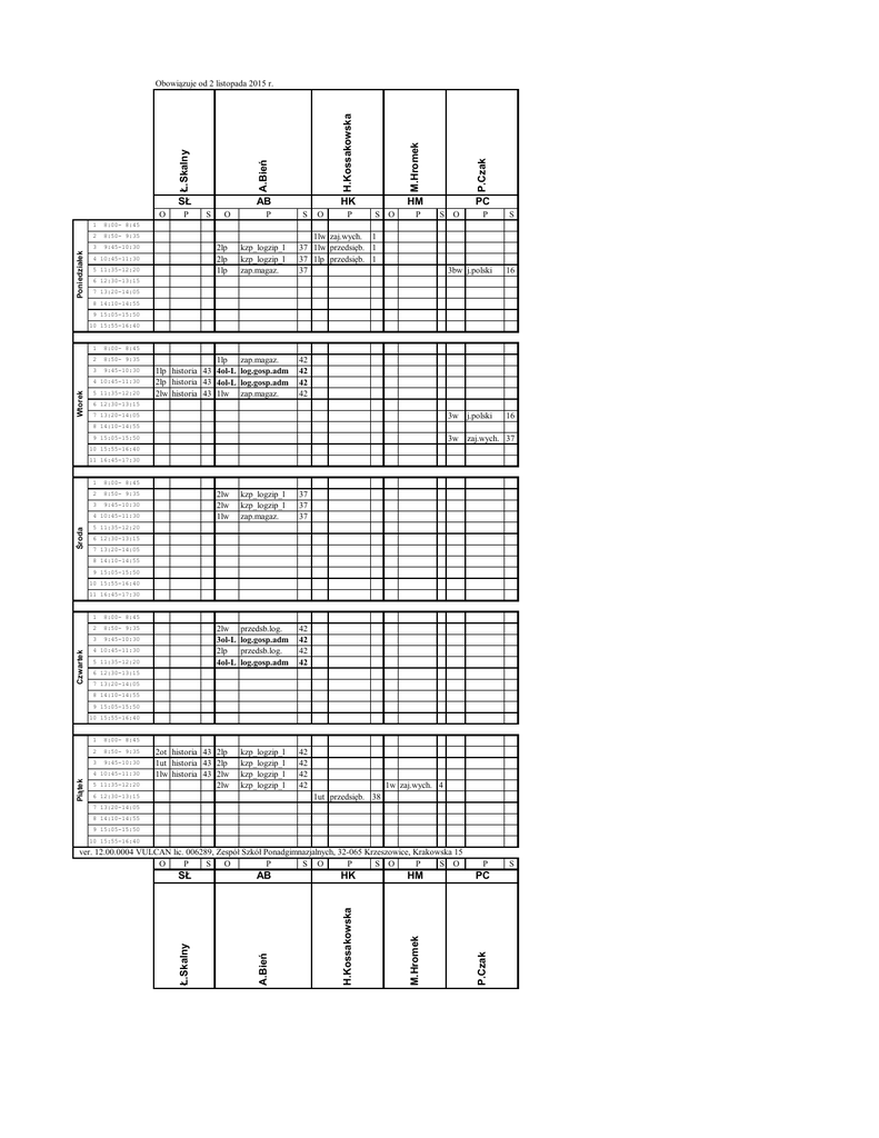 SŁ Poniedziałek O 1 8:00- 8:45 2 8:50- 9:35 3 9:45-10:30 P AB S O 2lp 2lp 1lp 4 10:45-11:30 5 11:35-12:20 P HK S O P P.Czak M.Hromek H.Kossakowska A.Bień Ł.Skalny Obowiązuje od 2 listopada 2015 r. HM S O kzp_logzip_l kzp_logzip_l zap.magaz. 1lw zaj.wych. 1 37 1lw przedsięb. 1 37 1lp przedsięb. 1 37 zap.magaz. log.gosp.adm log.gosp.adm zap.magaz. 42 42 42 42 P PC S O P S 3bw j.polski 16 3w j.polski 16 6 12:30-13:15 7 13:20-14:05 8 14:10-14:55 9 15:05-15:50 10 15:55-16:40 1 8:00- 8:45 2 8:50- 9:35 3 9:45-10:30 Wtorek 4 10:45-11:30 5 11:35-12:20 1lp 1lp historia 43 4ol-L 2lp historia 43 4ol-L 2lw historia 43 1lw 6 12:30-13:15 7 13:20-14:05 8 14:10-14:55 9 15:05-15:50 3w zaj.wych. 37 10 15:55-16:40 11 16:45-17:30 1 8:00- 8:45 2 8:50- 9:35 3 9:45-10:30 Środa 4 10:45-11:30 2lw 2lw 1lw kzp_logzip_l kzp_logzip_l zap.magaz. 37 37 37 2lw 3ol-L 2lp 4ol-L przedsb.log. log.gosp.adm przedsb.log. log.gosp.adm 42 42 42 42 kzp_logzip_l kzp_logzip_l kzp_logzip_l kzp_logzip_l 42 42 42 42 5 11:35-12:20 6 12:30-13:15 7 13:20-14:05 8 14:10-14:55 9 15:05-15:50 10 15:55-16:40 Czwartek 11 16:45-17:30 1 8:00- 8:45 2 8:50- 9:35 3 9:45-10:30 4 10:45-11:30 5 11:35-12:20 6 12:30-13:15 7 13:20-14:05 8 14:10-14:55 9 15:05-15:50 10 15:55-16:40 1 8:00- 8:45 2 8:50- 9:35 3 9:45-10:30 Piątek 4 10:45-11:30 5 11:35-12:20 2ot historia 43 2lp 1ut historia 43 2lp 1lw historia 43 2lw 2lw 1w zaj.wych. 4 1ut przedsięb. 38 6 12:30-13:15 7 13:20-14:05 8 14:10-14:55 9 15:05-15:50 10 15:55-16:40 AB HK HM PC A.Bień H.Kossakowska M.Hromek P.Czak P SŁ Ł.Skalny ver. 12.00.0004 VULCAN lic. 006289, Zespół Szkół Ponadgimnazjalnych, 32-065 Krzeszowice, Krakowska 15 O P S O P S O P S O P S O S P 1lp j.polski 2ot j.polski 3ut 1lp 1ut 1lp 4ae j.polski j.polski j.polski j.polski j.polski PD S O P 39 39 3ol j.polski 3ol j.polski 39 39 39 39 39 38 38 38 38 38 38 38 2ot 1w 3ut 1bw j.polski j.polski j.polski j.polski j.polski zaj.wych. j.polski j.polski j.polski j.polski 39 1lw j.polski 39 1lw j.polski 39 4t j.polski 39 3ut j.polski 1w j.polski 39 39 1bw j.polski 2w j.polski 2w j.polski 39 39 39 2lp 2lp 2ot-T 2ot 2lw 4ol 4ol 2lp 2lw 2lw 1ut 4ae 4ae 4ae 39 O 4t j.polski 4t j.polski 4ol j.polski 1lw 2lw 2lp j.polski 39 2lp j.polski 39 3ol j.polski 39 3ol zaj.wych. 39 1ut j.polski KG S 38 38 1ut-T 4t 38 38 38 kultura kultura j.polski j.polski kultura j.polski j.polski 38 38 38 38 38 38 2lw 2lw 2ot-1/2 2ot-1/2 3w 3bw 1ut BO S 30 16 30 r_angielski j.ang_zaw_t 30 2LW/2LP 40 16 2LW/2LP 40 4ol-L j.o.logist. 4ol-L j.o.logist. 4ae-2/2 j.angielski 40 40 40 40 40 40 40 40 36 16 j.o.logist. j.o.logist. j.angielski j.angielski j.angielski j.angielski j.angielski 1lp j.o.logist. 1ut j.angielski r_angielski j.angielski z_angielski j.angielski j.o.logist. j.ang_zaw_t j.o.logist. j.o.logist. O P S j.angielski j.angielski j.angielski j.angielski j.angielski j.o.logist. 30 30 30 30 40 40 2ot-T j.ang_zaw_t 40 40 40 1w-1/2 40 2w-2/2 40 2w-1/2 2w 1 3ol-2/2 16 3ol-2/2 4 1lp-2/2 30 2r_nieokreśl 2r_nieokreśl 2r_nieokreśl j.angielski j.angielski j.angielski j.angielski j.angielski j.angielski zaj.wych. j.angielski j.angielski j.angielski O P O I.Spisak N.Kulka SK S NK P S O P SI S O P S 2LW/2LP 39 2LW/2LP 39 1lw-1/2 2ot-2/2 2ot-2/2 1lp-2/2 4ae-2/2 4ol-L 40 40 4ae-1/2 4ae-1/2 4 4ae-1/2 1bw-2/2 40 1lw-1/2 3ol-2/2 K.Samborska JZ P j.o.logist. j.o.logist. r_angielski 1w-2/2 j.angielski 3bw z_angielski 3ut-T 3ut-1/2 38 3ut-U 38 3ut-1/2 38 1lp 4t 2lp 2lw J.Zarusińska B.Oczkowska K.Gajda D.Prusak I.Czarkowska IC O 1lw-2/2 j.angielski 30 4ae-1/2 j.francuski 4t 15 4t 15 4t 15 4t 37 37 40 4ol-1/2 1lw-2/2 2r_nieokreśl j.angielski 26 26 1lp-1/2 j.angielski 37 4ol-O j.ang_zaw 4ae-1/2 j.francuski j.francuski 36 4t 4t j.francuski j.ang_zaw_t 2r_nieokreśl j.o.logist. 40 1 39 j.o.logist. j.angielski 40 15 3ol-1/2 j.angielski 37 4ol-O 3ut-2/2 j.ang_zaw j.angielski 30 1 3ut-2/2 4ol-O 4 3ol-1/2 4 3ol-1/2 37 1lp-1/2 37 3ol-L j.angielski j.ang_zaw j.angielski j.angielski j.angielski j.o.logist. 36 40 38 4ol 25 4ol 38 38 3ut-T j.angielski 30 4ol-1/2 j.angielski 30 3ol-L r_angielski 30 r_angielski 30 3ol-L 1bw-1/2 38 30 30 16 40 1lw j.o.logist. 40 1lw j.o.logist. 40 4t j.angielski 4t r_angielski 3ol-L 4ol 4ae-1/2 4ae-1/2 4ol 4ol-1/2 j.o.logist. j.angielski j.angielski j.angielski j.angielski 2r_nieokreśl 40 40 40 40 37 37 #f1 3ol-2/2 3ut-2/2 3ut-2/2 4ae-2/2 4ae-2/2 #f2 30 2ot-2/3 j.obcy-inny 30 1ut 1 zaj.wych. 30 30 30 j.francuski j.francuski 30 30 j.francuski j.obcy-inny j.obcy-inny j.obcy-inny j.francuski j.francuski j.francuski 30 30 30 30 30 30 30 2lw-1/2 j.obcy-inny 1lp-1/2 j.obcy-inny 30 30 2ot-1/3 j.obcy-inny 1lw-1/2 j.obcy-inny 15 15 1ut-1/2 3ol-1/2 3ut-1/2 3ut-1/2 40 40 38 38 j.obcy-inny j.obcy-inny j.obcy-inny j.obcy-inny 2lp-1/2 j.obcy-inny 1 ka 15 S O P S O P S O P S O P S O P BO JZ SK NK SI I.Spisak P KG N.Kulka O K.Samborska S J.Zarusińska P PD B.Oczkowska O K.Gajda S D.Prusak P IC I.Czarkowska O S P ED S O P 4ol u_hist.i sp. 43 4t u_hist.i sp. 16 4t u_hist.i sp. 16 1ut-T p.dz.gosp.t. 1lp 1lw 3ut 1lw 4t 3w 3bw 4ae u_hist.i sp. wos u_hist.i sp. wos wos u_hist.i sp. 16 43 43 1ut 43 43 1lp 43 przedsb.log. chemia chemia chemia SA S O 3ut-T 3ut-T 9 1lw 2ot-T 1 1 1ut 2lw 1 2ot-T 3ut 1 P r_geografia r_geografia fizyka r_geografia geografia r_geografia r_geografia zaj.wych. JT S O P KP S 37 9 43 43 26 26 26 26 O P M.Szecówka K.Szneler K.Pałka J.Tekieli A.Szklarczyk E.Dziekan M.Kulka MK O KS S O P MS S 2lw 2lw 1lw 1lw matematyka r_matematyka matematyka matematyka 4 4 4 4 4t 2ot 1lp 1lp matematyka matematyka matematyka matematyka 1 37 37 37 1lw 2lp 2lp 2lw 3ol-L matematyka r_matematyka matematyka r_matematyka r_matematyka 3ut 4 1lp 4 4 3ut 37 3ut 37 O P S 4ol 3bw 3w matematyka matematyka matematyka 38 15 39 matematyka matematyka 4 26 matematyka matematyka 3w 15 4ae 15 4ol 3bw matematyka matematyka zaj.wych. matematyka 15 1 9 1 r_matematyka 26 4ae u_hist.i sp. 43 4ae u_hist.i sp. 43 1lp wos 43 4ol u_hist.i sp. 43 3ol-L r_geografia 1lw 1w 1bw 4ol 1w 3ol 1ut 2w 1bw u_hist.