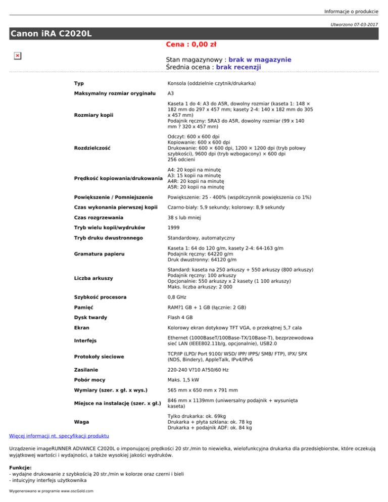 Informacje o produkcie Utworzono 07-03-2017 Canon iRA C2020L Cena : 0,00 zł Stan magazynowy : brak w magazynie Średnia ocena : brak recenzji Typ Konsola (oddzielnie czytnik/drukarka) Maksymalny rozmiar oryginału A3 Rozmiary kopii Kaseta 1 do 4: A3 do A5R, dowolny rozmiar (kaseta 1: 148 × 182 mm do 297 x 457 mm; kasety 2-4: 140 x 182 mm do 305 x 457 mm) Podajnik ręczny: SRA3 do A5R, dowolny rozmiar (99 x 140 mm ? 320 x 457 mm) Rozdzielczość Odczyt: 600 x 600 dpi Kopiowanie: 600 x 600 dpi Drukowanie: 600 × 600 dpi, 1200 × 1200 dpi (tryb połowy szybkości), 9600 dpi (tryb wzbogacony) × 600 dpi 256 odcieni A4: 20 kopii na minutę A3: 15 kopii na minutę Prędkość kopiowania/drukowania A4R: 20 kopii na minutę A5R: 20 kopii na minutę Powiększenie / Pomniejszenie Powiększenie: 25 - 400% (współczynnik powiększenia co 1%) Czas wykonania pierwszej kopii Czarno-biały: 5,9 sekundy; kolorowy: 8,9 sekundy Czas rozgrzewania 38 s lub mniej Tryb wielu kopii/wydruków 1999 Tryb druku dwustronnego Standardowy, automatyczny Gramatura papieru Kaseta 1: 64 do 120 g/m, kasety 2-4: 64-163 g/m Podajnik ręczny: 64220 g/m Druk dwustronny: 64120 g/m Liczba arkuszy Standard: kaseta na 250 arkuszy + 550 arkuszy (800 arkuszy) Podajnik ręczny: 100 arkuszy Opcjonalnie: 550 arkuszy x 2 kasety (1 100 arkuszy) Maks. liczba arkuszy: 2 000 Szybkość procesora 0,8 GHz Pamięć RAM?1 GB + 1 GB (łącznie: 2 GB) Dysk twardy Flash 4 GB Ekran Kolorowy ekran dotykowy TFT VGA, o przekątnej 5,7 cala Interfejs Ethernet (1000BaseT/100Base-TX/10Base-T), bezprzewodowa sieć LAN (IEEE802.11b/g, opcjonalnie), USB2.0 Protokoły sieciowe TCP/IP (LPD/ Port 9100/ WSD/ IPP/ IPPS/ SMB/ FTP), IPX/ SPX (NDS, Bindery), AppleTalk, IPv4/IPv6 Zasilanie 220-240 V?10 A?50/60 Hz Pobór mocy Maks. 1,5 kW Wymiary (szer. x gł. x wys.) 565 mm x 650 mm x 791 mm Miejsce na instalację (szer. x gł.) 846 mm x 1139mm (uniwersalny podajnik + wysunięta kaseta) Waga Tylko drukarka: ok. 69kg Drukarka + płyta szklana: ok. 78 kg Drukarka + podajnik ADF: ok. 84 kg Więcej informacji nt. specyfikacji produktu Urządzenie imageRUNNER ADVANCE C2020L o imponującej prędkości 20 str./min to niewielka, wielofunkcyjna drukarka dla przedsiębiorstw, które oczekują wyjątkowej wartości i wydajności, a także wysokiej jakości wydruków. Funkcje: - wydajne drukowanie z szybkością 20 str./min w kolorze oraz czerni i bieli - intuicyjny interfejs użytkownika Wygenerowano w programie www.oscGold.com - wysoka jakość druku - zaawansowane funkcje współpracy przy opracowywaniu dokumentów - pakiet funkcji zabezpieczeń jako standard - zużycie energii na poziomie zaledwie 1,5 W - oszczędność miejsca dzięki wewnętrznemu modułowi wykańczania Wydajne drukowanie w wysokiej jakości Model C2020L oferuje wysokie standardy jakości, zachowując jednocześnie prędkość wydruku na poziomie 20 stron na minutę, zarówno w trybie kolorowym, jak i czarno-białym. Zgodność z bogatą gamą nośników i kompaktowe opcje wykańczania gwarantują wręcz nieprzebrany arsenał środków wzmacniania komunikacji. Łatwa obsługa i wszechstronne możliwości dostosowywania Urządzenie C2020L wyposażono w kolorowy, interaktywny ekran dotykowy VGA o wysokiej rozdzielczości i przekątnej 5,7 cala, na którym wyświetlane są przyjazne dla użytkownika ikony ułatwiające pracę. Użytkownicy mogą sami określać liczbę przycisków wyświetlanych na ekranie, a nawet wybierać tło spośród 8 dostępnych wzorów tapet. Dzięki możliwości konfigurowania własnych sekwencji operacji skomplikowane albo najpopularniejsze zadania mogą być inicjowane kliknięciem jednego przycisku. Wydajne funkcje obsługi współpracy i konwersji Skanowanie dwustronne pozwala na szybkie i bezproblemowe przekazywanie obrazów do lokalizacji docelowych, takich jak wiadomości e-mail, witryny FTP czy foldery udostępnione. Integracja z systemami, takimi jak Microsoft, SharePoint, Adobe, a także z bogatą gamą oprogramowania firmy Canon, zapewnia przedsiębiorstwu możliwość stosowania najwydajniejszych elektronicznych procesów obiegu dokumentów - znacznie bardziej wydajnych niż tradycyjne systemy. Wydajne i bezpieczne Urządzenie wyposażono w szereg narzędzi ułatwiających kontrolę kosztów użytkowania, np. ograniczających dostęp do wybranych funkcji. Ponadto pakiet specjalnych funkcji, takich jak zabezpieczanie znakiem wodnym i uwierzytelnianie użytkowników chcących korzystać z urządzenia, zapewnia odpowiednią dbałość o bezpieczeństwo dokumentów na wszystkich etapach ich generowania. Rewolucyjna przyjazność dla środowiska Modele z serii imageRUNNER ADVANCE to pierwsze na świecie urządzenia wykonane z wysokiej klasy biodegradowalnego niepalnego plastiku. Dzięki zużyciu energii na poziomie zaledwie 1,5 W urządzenie C2020L jest zgodne z normami ochrony środowiska, takimi jak Energy Star. Ponadto spełniają wymogi dyrektywy RoHS. Dołączenie modułu dwustronnego pozwala wydatnie ograniczyć zużycie papieru.