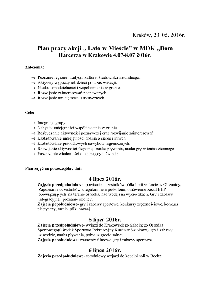Kraków, 20. 05. 2016r. Plan pracy akcji „ Lato w Mieście” w MDK „Dom Harcerza w Krakowie 4.07-8.07 2016r. Założenia: Poznanie regionu: tradycji, kultury, środowiska naturalnego. Aktywny wypoczynek dzieci podczas wakacji. Nauka samodzielności i współistnienia w grupie. Rozwijanie zainteresowań poznawczych. Rozwijanie umiejętności artystycznych. Cele: Integracja grupy. Nabycie umiejętności współdziałania w grupie. Rozbudzanie aktywności poznawczej oraz rozwijanie zainteresowań. Kształtowanie umiejętności dbania o siebie i innych. Kształtowanie prawidłowych nawyków higienicznych. Rozwijanie aktywności fizycznej- nauka pływania, nauka gry w tenisa ziemnego Poszerzanie wiadomości o otaczającym świecie. Plan zajęć na poszczególne dni: 4 lipca 2016r. Zajęcia przedpołudniowe- powitanie uczestników półkolonii w forcie w Olszanicy. Zapoznanie uczestników z regulaminem półkolonii, omówienie zasad BHP obowiązujących na terenie ośrodka, nad wodą i na wycieczkach. Gry i zabawy integracyjne, poznanie okolicy. Zajęcia popołudniowe- gry i zabawy sportowe, konkursy zręcznościowe, konkurs plastyczny, turniej piłki nożnej 5 lipca 2016r. Zajęcia przedpołudniowe- wyjazd do Krakowskiego Szkolnego Ośrodka Sportowego(Ośrodek Sportowo Rekreacyjny Kurdwanów Nowy), gry i zabawy w wodzie, nauka pływania, pobyt w grocie solnej Zajęcia popołudniowe- warsztaty filmowe, gry i zabawy sportowe 6 lipca 2016r. Zajęcia przedpołudniowe- całodniowy wyjazd do kopalni soli w Bochni 7 lipca 2016r. Zajęcia przedpołudniowe- wyjazd do Krakowskiego Szkolnego Ośrodka Sportowego(Ośrodek Sportowo Rekreacyjny Kurdwanów Nowy), gry i zabawy w wodzie, nauka pływania, pobyt w grocie solnej Zajęcia popołudniowe – Gry i zabawy sportowe, warsztaty filmowe, konkurs plastyczny 10 lipca 2015r. Zajęcia przedpołudniowe- wyjazd do Klubu Sportowego Kryspinów , zajęcia z nauki i doskonalenia gry w tenisa ziemnego, park rozrywki Zajęcia popołudniowe- ognisko na zakończenie turnusu rozdanie nagród pożegnanie z kadra *Program może ulec zmianie z powodu złych warunków atmosferycznych