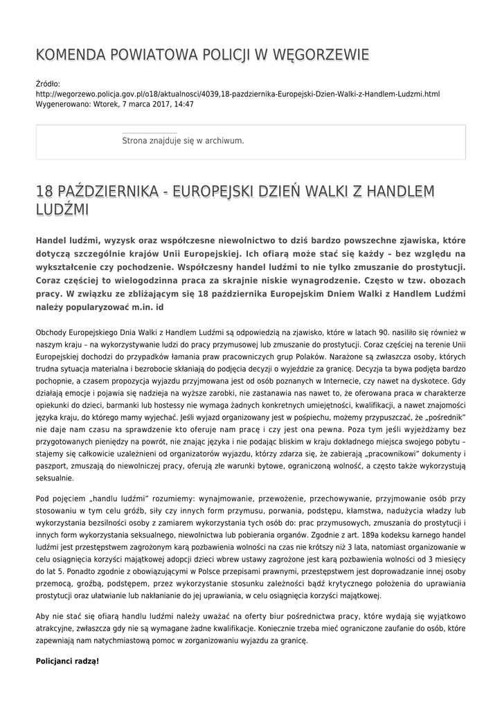 KOMENDA POWIATOWA POLICJI W WĘGORZEWIE Źródło: http://wegorzewo.policja.gov.pl/o18/aktualnosci/4039,18-pazdziernika-Europejski-Dzien-Walki-z-Handlem-Ludzmi.html Wygenerowano: Wtorek, 7 marca 2017, 14:47 Strona znajduje się w archiwum. 18 PAŹDZIERNIKA - EUROPEJSKI DZIEŃ WALKI Z HANDLEM LUDŹMI Handel ludźmi, wyzysk oraz współczesne niewolnictwo to dziś bardzo powszechne zjawiska, które dotyczą szczególnie krajów Unii Europejskiej. Ich ofiarą może stać się każdy – bez względu na wykształcenie czy pochodzenie. Współczesny handel ludźmi to nie tylko zmuszanie do prostytucji. Coraz częściej to wielogodzinna praca za skrajnie niskie wynagrodzenie. Często w tzw. obozach pracy. W związku ze zbliżającym się 18 października Europejskim Dniem Walki z Handlem Ludźmi należy popularyzować m.in. id Obchody Europejskiego Dnia Walki z Handlem Ludźmi są odpowiedzią na zjawisko, które w latach 90. nasiliło się również w naszym kraju – na wykorzystywanie ludzi do pracy przymusowej lub zmuszanie do prostytucji. Coraz częściej na terenie Unii Europejskiej dochodzi do przypadków łamania praw pracowniczych grup Polaków. Narażone są zwłaszcza osoby, których trudna sytuacja materialna i bezrobocie skłaniają do podjęcia decyzji o wyjeździe za granicę. Decyzja ta bywa podjęta bardzo pochopnie, a czasem propozycja wyjazdu przyjmowana jest od osób poznanych w Internecie, czy nawet na dyskotece. Gdy działają emocje i pojawia się nadzieja na wyższe zarobki, nie zastanawia nas nawet to, że oferowana praca w charakterze opiekunki do dzieci, barmanki lub hostessy nie wymaga żadnych konkretnych umiejętności, kwalifikacji, a nawet znajomości języka kraju, do którego mamy wyjechać. Jeśli wyjazd organizowany jest w pośpiechu, możemy przypuszczać, że „pośrednik” nie daje nam czasu na sprawdzenie kto oferuje nam pracę i czy jest ona pewna. Poza tym jeśli wyjeżdżamy bez przygotowanych pieniędzy na powrót, nie znając języka i nie podając bliskim w kraju dokładnego miejsca swojego pobytu – stajemy się całkowicie uzależnieni od organizatorów wyjazdu, którzy zdarza się, że zabierają „pracownikowi” dokumenty i paszport, zmuszają do niewolniczej pracy, oferują złe warunki bytowe, ograniczoną wolność, a często także wykorzystują seksualnie. Pod pojęciem „handlu ludźmi” rozumiemy: wynajmowanie, przewożenie, przechowywanie, przyjmowanie osób przy stosowaniu w tym celu gróźb, siły czy innych form przymusu, porwania, podstępu, kłamstwa, nadużycia władzy lub wykorzystania bezsilności osoby z zamiarem wykorzystania tych osób do: prac przymusowych, zmuszania do prostytucji i innych form wykorzystania seksualnego, niewolnictwa lub pobierania organów. Zgodnie z art. 189a kodeksu karnego handel ludźmi jest przestępstwem zagrożonym karą pozbawienia wolności na czas nie krótszy niż 3 lata, natomiast organizowanie w celu osiągnięcia korzyści majątkowej adopcji dzieci wbrew ustawy zagrożone jest karą pozbawienia wolności od 3 miesięcy do lat 5. Ponadto zgodnie z obowiązującymi w Polsce przepisami prawnymi, przestępstwem jest doprowadzanie innej osoby przemocą, groźbą, podstępem, przez wykorzystanie stosunku zależności bądź krytycznego położenia do uprawiania prostytucji oraz ułatwianie lub nakłanianie do jej uprawiania, w celu osiągnięcia korzyści majątkowej. Aby nie stać się ofiarą handlu ludźmi należy uważać na oferty biur pośrednictwa pracy, które wydają się wyjątkowo atrakcyjne, zwłaszcza gdy nie są wymagane żadne kwalifikacje. Koniecznie trzeba mieć ograniczone zaufanie do osób, które zapewniają nam natychmiastową pomoc w zorganizowaniu wyjazdu za granicę. Policjanci radzą! Jeśli planujesz podjąć pracę za granicą, przestrzegaj poniższych zasad: Nie przyjmuj ofert pracy od osób, których nie znasz lub znasz słabo i krótko – jeśli planujesz podjęcie pracy za granicą, skorzystaj z pomocy urzędu pracy lub profesjonalnego, legalnie działającego pośrednika. Dowiedz się, w jaki sposób może pomóc Ci pośrednik w sytuacji, gdy warunki pracy okażą się inne niż zapowiadano, jeśli pracodawca nie wywiązuje się z umowy – poproś pośrednika o zapewnienie na piśmie o takiej pomocy. Upewnij się, że firma lub osoba oferująca pracę istnieje. W tym celu ustal jej adres, telefon i koniecznie skontaktuj się z przedstawicielem tej firmy/ z tą osobą. Uważnie czytaj dokumenty, które pokazuje Ci pośrednik, w szczególności te, które wymagają Twojego podpisu. O wszystkie wątpliwości pytaj pośrednika i nigdy nie podpisuj dokumentu, którego treści nie rozumiesz! Zbierz informacje o kraju, do którego wyjeżdżasz – dowiedz się np. jak regulowane jest zatrudnianie obcokrajowców, zwłaszcza poza Unią Europejską. Zanotuj i zabierz ze sobą adres i numer telefonu najbliższego polskiego konsulatu w kraju, do którego wyjeżdżasz. Dopełnij wszystkich formalności, m.in. sprawdź ważność swoich dokumentów jeśli wyjeżdżasz na ich podstawie, przygotuj wszystkie dokumenty konieczne do podjęcia pracy (np. poświadczenia kwalifikacji zawodowych) oraz ubezpiecz się (od następstw nieszczęśliwych wypadków i ewentualnych kosztów leczenia). Zrób kserokopie dokumentów, które ze sobą zabierasz, tj. paszportu, dowodu osobistego, wiz, pozwolenia na pracę, umowy o pracę. Kserokopie te zostaw osobom bliskim, które zostają w kraju. Zostaw bliskim adres, pod którym będziesz przebywać za granicą, numer telefonu, imię i nazwisko pracodawcy oraz nazwiska osób, z którymi wyjeżdżasz. O każdej zmianie miejsca pobytu, informuj bliskich w kraju. Ustal z bliskimi to, jak często będziesz z nimi w kontakcie, o jakiej porze dnia. Ustalcie również formę przekazania informacji, że dzieje się z Tobą coś niepokojącego, zwłaszcza, gdy nie będziesz móc powiedzieć o tym wprost. Wyjeżdżając zabierz ze sobą: Adres polski