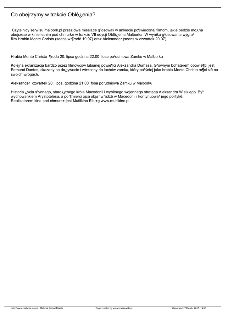 Co obejrzymy w trakcie Oblê¿enia? Czytelnicy serwisu malbork.pl przez dwa miesi±ce g³osowali w ankiecie po¶wiêconej filmom, jakie bêdzie mo¿na obejrzeæ w kinie letnim pod chmurk± w trakcie VII edycji Oblê¿enia Malborka. W wyniku g³osowania wygra³ film Hrabia Monte Christo (seans w ¶rodê 19.07) oraz Aleksander (seans w czwartek 20.07) Hrabia Monte Christo ¶roda 20. lipca godzina 22:00 fosa po³udniowa Zamku w Malborku Kolejna ekranizacja bardzo przez filmowców lubianej powie¶ci Aleksandra Dumasa. G³ównym bohaterem opowie¶ci jest Edmund Dantes, skazany na do¿ywocie i wtr±cony do lochów zamku, który pó¼niej jako hrabia Monte Christo m¶ci siê na swoich wrogach. Aleksander czwartek 20. lipca, godzina 21:00 fosa po³udniowa Zamku w Malborku Historia ¿ycia s³ynnego, staro¿ytnego króla Macedonii i wybitnego wojennego stratega Aleksandra Wielkiego. By³ wychowankiem Arystotelesa, a po ¶mierci ojca obj±³ w³adzê w Macedonii i kontynuowa³ jego politykê. Realizatorem kina pod chmurk± jest Mutlikino Elbl±g www.multikino.pl http://www.malbork.pl/um/ - Malbork, Urz±d Miasta Page created by www.kraszewski.pl Generated: 7 March, 2017, 14:55