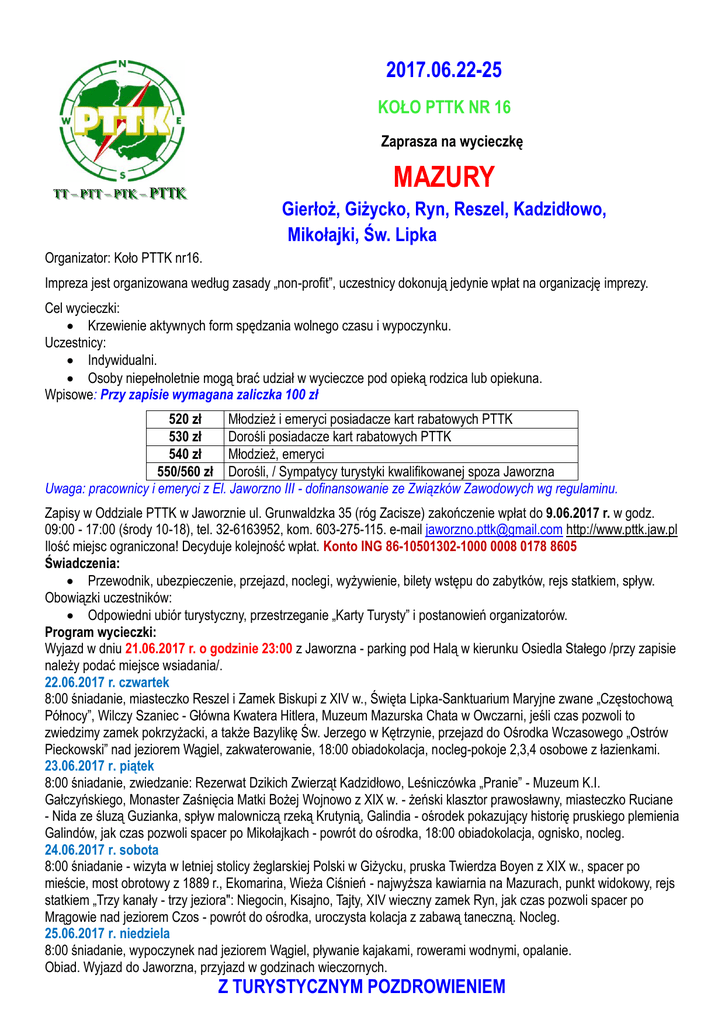2017.06.22-25 KOŁO PTTK NR 16 Zaprasza na wycieczkę TTTT –– PPTTTT –– PPTTK K –– PPT TTTK K MAZURY Gierłoż, Giżycko, Ryn, Reszel, Kadzidłowo, Mikołajki, Św. Lipka Organizator: Koło PTTK nr16. Impreza jest organizowana według zasady „non-profit”, uczestnicy dokonują jedynie wpłat na organizację imprezy. Cel wycieczki: Krzewienie aktywnych form spędzania wolnego czasu i wypoczynku. Uczestnicy: Indywidualni. Osoby niepełnoletnie mogą brać udział w wycieczce pod opieką rodzica lub opiekuna. Wpisowe: Przy zapisie wymagana zaliczka 100 zł 520 zł Młodzież i emeryci posiadacze kart rabatowych PTTK 530 zł Dorośli posiadacze kart rabatowych PTTK 540 zł Młodzież, emeryci 550/560 zł Dorośli, / Sympatycy turystyki kwalifikowanej spoza Jaworzna Uwaga: pracownicy i emeryci z El. Jaworzno III - dofinansowanie ze Związków Zawodowych wg regulaminu. Zapisy w Oddziale PTTK w Jaworznie ul. Grunwaldzka 35 (róg Zacisze) zakończenie wpłat do 9.06.2017 r. w godz. 09:00 - 17:00 (środy 10-18), tel. 32-6163952, kom. 603-275-115. e-mail [email protected] http://www.pttk.jaw.pl Ilość miejsc ograniczona! Decyduje kolejność wpłat. Konto ING 86-10501302-1000 0008 0178 8605 Świadczenia: Przewodnik, ubezpieczenie, przejazd, noclegi, wyżywienie, bilety wstępu do zabytków, rejs statkiem, spływ. Obowiązki uczestników: Odpowiedni ubiór turystyczny, przestrzeganie „Karty Turysty” i postanowień organizatorów. Program wycieczki: Wyjazd w dniu 21.06.2017 r. o godzinie 23:00 z Jaworzna - parking pod Halą w kierunku Osiedla Stałego /przy zapisie należy podać miejsce wsiadania/. 22.06.2017 r. czwartek 8:00 śniadanie, miasteczko Reszel i Zamek Biskupi z XIV w., Święta Lipka-Sanktuarium Maryjne zwane „Częstochową Północy”, Wilczy Szaniec - Główna Kwatera Hitlera, Muzeum Mazurska Chata w Owczarni, jeśli czas pozwoli to zwiedzimy zamek pokrzyżacki, a także Bazylikę Św. Jerzego w Kętrzynie, przejazd do Ośrodka Wczasowego „Ostrów Pieckowski” nad jeziorem Wągiel, zakwaterowanie, 18:00 obiadokolacja, nocleg-pokoje 2,3,4 osobowe z łazienkami. 23.06.2017 r. piątek 8:00 śniadanie, zwiedzanie: Rezerwat Dzikich Zwierząt Kadzidłowo, Leśniczówka „Pranie” - Muzeum K.I. Gałczyńskiego, Monaster Zaśnięcia Matki Bożej Wojnowo z XIX w. - żeński klasztor prawosławny, miasteczko Ruciane - Nida ze śluzą Guzianka, spływ malowniczą rzeką Krutynią, Galindia - ośrodek pokazujący historię pruskiego plemienia Galindów, jak czas pozwoli spacer po Mikołajkach - powrót do ośrodka, 18:00 obiadokolacja, ognisko, nocleg. 24.06.2017 r. sobota 8:00 śniadanie - wizyta w letniej stolicy żeglarskiej Polski w Giżycku, pruska Twierdza Boyen z XIX w., spacer po mieście, most obrotowy z 1889 r., Ekomarina, Wieża Ciśnień - najwyższa kawiarnia na Mazurach, punkt widokowy, rejs statkiem „Trzy kanały - trzy jeziora": Niegocin, Kisajno, Tajty, XIV wieczny zamek Ryn, jak czas pozwoli spacer po Mrągowie nad jeziorem Czos - powrót do ośrodka, uroczysta kolacja z zabawą taneczną. Nocleg. 25.06.2017 r. niedziela 8:00 śniadanie, wypoczynek nad jeziorem Wągiel, pływanie kajakami, rowerami wodnymi, opalanie. Obiad. Wyjazd do Jaworzna, przyjazd w godzinach wieczornych. Z TURYSTYCZNYM POZDROWIENIEM „Wilczy Szaniec”- w samym sercu Mazur znajdują się porośnięte lasem ruiny kwatery głównej Adolfa Hitlera. Zamaskowane miasteczko w lesie - 200 budynków: schrony, baraki, 2 lotniska, elektrownia, dworzec kolejowy, urządzenia klimatyzacyjne, wodociągi, ciepłownie, dwie centrale dalekopisowe. W 1944 r. mieszkało tu ponad 2000 osób. 20 lipca 1944 roku pułkownik hrabia Claus Schenk von Stauffenberg dokonuje tu nieudanego zamachu na Adolfa Hitlera. Tu decydowano o wykorzystaniu jeńców w niemieckim przemyśle zbrojeniowym, budowie nowych obozów koncentracyjnych. Tu wcielano w życie plan budowy Tysiącletniej Rzeszy. Tu podejmowano zbrodnicze decyzje, dotyczące losów wielu narodów Europy. Kadzidłowo-.Prywatny Park Dzikich Zwierząt, zajmuje obszar ok.100 ha w Puszczy Piskiej. Dr Andrzej Krzywiński założył park w celu zachowania wymierających gatunków zwierząt. Zobaczyć tam można m. in. tarpany, daniele, wilki skandynawskie, łosie, jelenie. Niektóre zwierzęta można karmić i głaskać. Twierdza Boyen – twierdza w kształcie gwiazdy stanowiąca ważny obiekt strategiczny, blokujący. Położona w zachodniej części Giżycka na wąskim przesmyku pomiędzy dwoma dużymi jeziorami mazurskimi – Kisajno (południowa część kompleksu Mamr) i Niegocin. Zbudowana w latach 1844-1856 z rozkazu króla Fryderyka Wilhelma IV, została przygotowana dla załogi liczącej około 3000 żołnierzy. Wzniesiona została na obszarze Prus Wschodnich liczącym ok. 100 ha i stanowiła główne ogniwo w łańcuchu umocnień zamykających od wschodu dostęp na teren państwa pruskiego. Najpiękniejsze chyba zakątki Mazur znajdują się nad rzeką Krutynią, /dopływ Pisy/, która wraz 17 jeziorami tworzy popularny szlak kajakowy. Rzeka płynie przez rezerwat krajobrazowo-wodno-leśny położony na terenie trzech gmin: Piecki, Mikołajki i Ruciane-Nida. Jej długość to 99 km, a powierzchnia dorzecza wynosi 638 km. Nurt rzeki jest wolny, a rzeka tworzy liczne zakola, szczególnie w środkowej części rezerwatu, dobra na organizowanie spływów. Święta Lipka - ta niewielka miejscowość znana już od XV wieku jako miejsce licznych pielgrzymek, położona jest w pobliżu Kętrzyna nad jeziorem Dejnowo. Co roku, ponad 100 tys. turystów przyjeżdżających na Mazury, odwiedza znajdujące się tu Sanktuarium Maryjne. Z powodu licznych grup pielgrzymów, Święta Lipka często nazywana jest "Częstochową Północy". Galindia to jedna z krain leżących w południowej części Prus, zamieszkana przez plemię Galindów. Okres bytowania Galindów datuje się na około V w. p.n.e. - XIII w. n.e. Według przekazów ustnych Galindowie zamieszkiw
