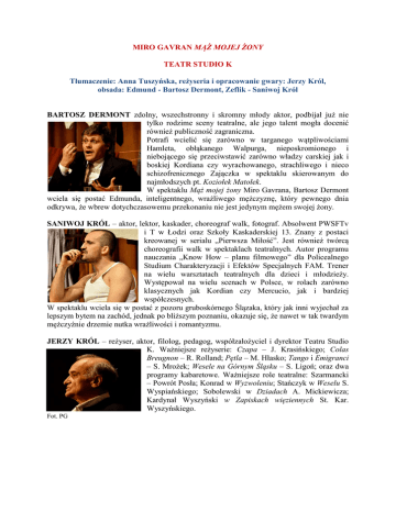 MIRO GAVRAN MĄŻ MOJEJ ŻONY TEATR STUDIO K Tłumaczenie: Anna Tuszyńska, reżyseria i opracowanie gwary: Jerzy Król, obsada: Edmund - Bartosz Dermont, Zeflik - Saniwoj Król BARTOSZ DERMONT zdolny, wszechstronny i skromny młody aktor, podbijał już nie tylko rodzime sceny teatralne, ale jego talent mogła docenić również publiczność zagraniczna. Potrafi wcielić się zarówno w targanego wątpliwościami Hamleta, obłąkanego Walpurga, nieposkromionego i niebojącego się przeciwstawić zarówno władzy carskiej jak i boskiej Kordiana czy wyrachowanego, strachliwego i nieco schizofrenicznego Zajączka w spektaklu skierowanym do najmłodszych pt. Koziołek Matołek. W spektaklu Mąż mojej żony Miro Gavrana, Bartosz Dermont wciela się postać Edmunda, inteligentnego, wrażliwego mężczyznę, który pewnego dnia odkrywa, że wbrew dotychczasowemu przekonaniu nie jest jedynym mężem swojej żony. SANIWOJ KRÓL – aktor, lektor, kaskader, choreograf walk, fotograf. Absolwent PWSFTv i T w Łodzi oraz Szkoły Kaskaderskiej 13. Znany z postaci kreowanej w serialu „Pierwsza Miłość”. Jest również twórcą choreografii walk w spektaklach teatralnych. Autor programu nauczania „Know How – planu filmowego” dla Policealnego Studium Charakteryzacji i Efektów Specjalnych FAM. Trener na wielu warsztatach teatralnych dla dzieci i młodzieży. Występował na wielu scenach w Polsce, w rolach zarówno klasycznych jak Kordian czy Mercucio, jak i bardziej współczesnych. W spektaklu wciela się w postać z pozoru gruboskórnego Ślązaka, który jak inni wyjechał za lepszym bytem na zachód, jednak po bliższym poznaniu, okazuje się, że nawet w tak twardym mężczyźnie drzemie nutka wrażliwości i romantyzmu. JERZY KRÓL – reżyser, aktor, filolog, pedagog, współzałożyciel i dyrektor Teatru Studio K. Ważniejsze reżyserie: Czapa – J. Krasińskiego; Colas Breugnon – R. Rolland; Pętla – M. Hłasko; Tango i Emigranci – S. Mrożek; Wesele na Górnym Śląsku – S. Ligoń; oraz dwa programy kabaretowe. Ważniejsze role teatralne: Szarmancki – Powrót Posła; Konrad w Wyzwoleniu; Stańczyk w Weselu S. Wyspiańskiego; Sobolewski w Dziadach A. Mickiewicza; Kardynał Wyszyński w Zapiskach więziennych St. Kar. Wyszyńskiego. Fot. PG