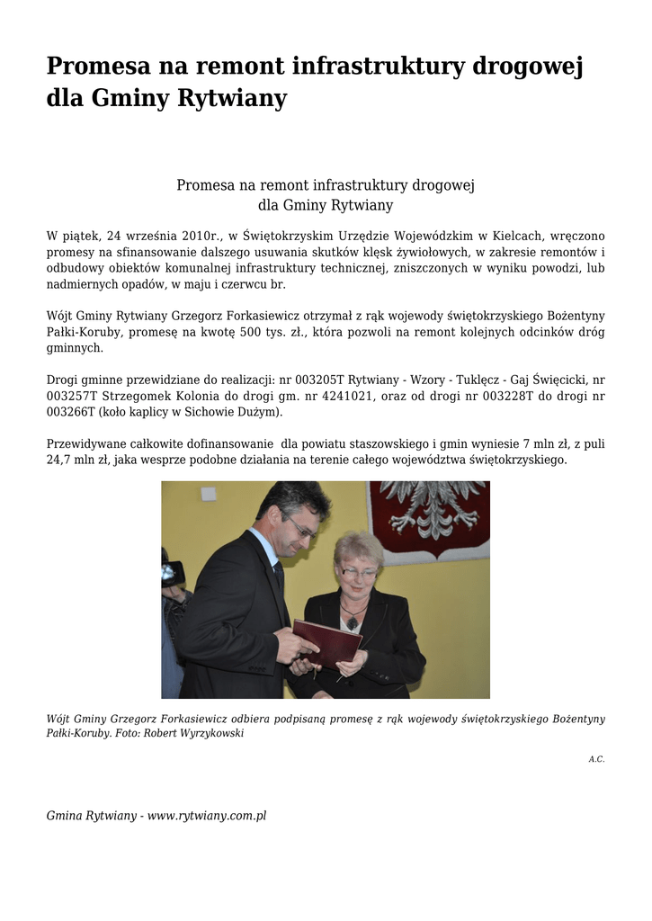 Promesa na remont infrastruktury drogowej dla Gminy Rytwiany Promesa na remont infrastruktury drogowej dla Gminy Rytwiany W piątek, 24 września 2010r., w Świętokrzyskim Urzędzie Wojewódzkim w Kielcach, wręczono promesy na sfinansowanie dalszego usuwania skutków klęsk żywiołowych, w zakresie remontów i odbudowy obiektów komunalnej infrastruktury technicznej, zniszczonych w wyniku powodzi, lub nadmiernych opadów, w maju i czerwcu br. Wójt Gminy Rytwiany Grzegorz Forkasiewicz otrzymał z rąk wojewody świętokrzyskiego Bożentyny Pałki-Koruby, promesę na kwotę 500 tys. zł., która pozwoli na remont kolejnych odcinków dróg gminnych. Drogi gminne przewidziane do realizacji: nr 003205T Rytwiany - Wzory - Tuklęcz - Gaj Święcicki, nr 003257T Strzegomek Kolonia do drogi gm. nr 4241021, oraz od drogi nr 003228T do drogi nr 003266T (koło kaplicy w Sichowie Dużym). Przewidywane całkowite dofinansowanie dla powiatu staszowskiego i gmin wyniesie 7 mln zł, z puli 24,7 mln zł, jaka wesprze podobne działania na terenie całego województwa świętokrzyskiego. Wójt Gminy Grzegorz Forkasiewicz odbiera podpisaną promesę z rąk wojewody świętokrzyskiego Bożentyny Pałki-Koruby. Foto: Robert Wyrzykowski A.C. Gmina Rytwiany - www.rytwiany.com.pl