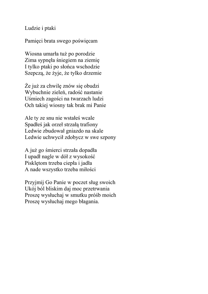 Ludzie i ptaki Pamięci brata swego poświęcam Wiosna umarła tuż po porodzie Zima sypnęła śniegiem na ziemię I tylko ptaki po słońca wschodzie Szepczą, że żyje, że tylko drzemie Że już za chwilę znów się obudzi Wybuchnie zieleń, radość nastanie Uśmiech zagości na twarzach ludzi Och takiej wiosny tak brak mi Panie Ale ty ze snu nie wstałeś wcale Spadłeś jak orzeł strzałą trafiony Ledwie zbudował gniazdo na skale Ledwie uchwycił zdobycz w swe szpony A już go śmierci strzała dopadła I upadł nagle w dół z wysokość Pisklętom trzeba ciepła i jadła A nade wszystko trzeba miłości Przyjmij Go Panie w poczet sług swoich Ukój ból bliskim daj moc przetrwania Proszę wysłuchaj w smutku próśb moich Proszę wysłuchaj mego błagania. Kolce i ciernie Drzewa raczej nas nie ranią Choć niektóre maja ciernie My wpadamy czasem na nie One stoją biernie Nie przeklinaj krzewu róży Kiedy dotkniesz kolców dłonią My sięgamy po ich kwiaty One swego bronią Jeśli walczysz w obcym kraju Z nie do końca swoim wrogiem Nie wiesz czyś jest bohaterem Czyś przeklęty przed ich Bogiem Czy zanosisz im nadzieję Co cenniejsza jest jak diament Czy ich braci zabijając Powodujesz płacz i lament