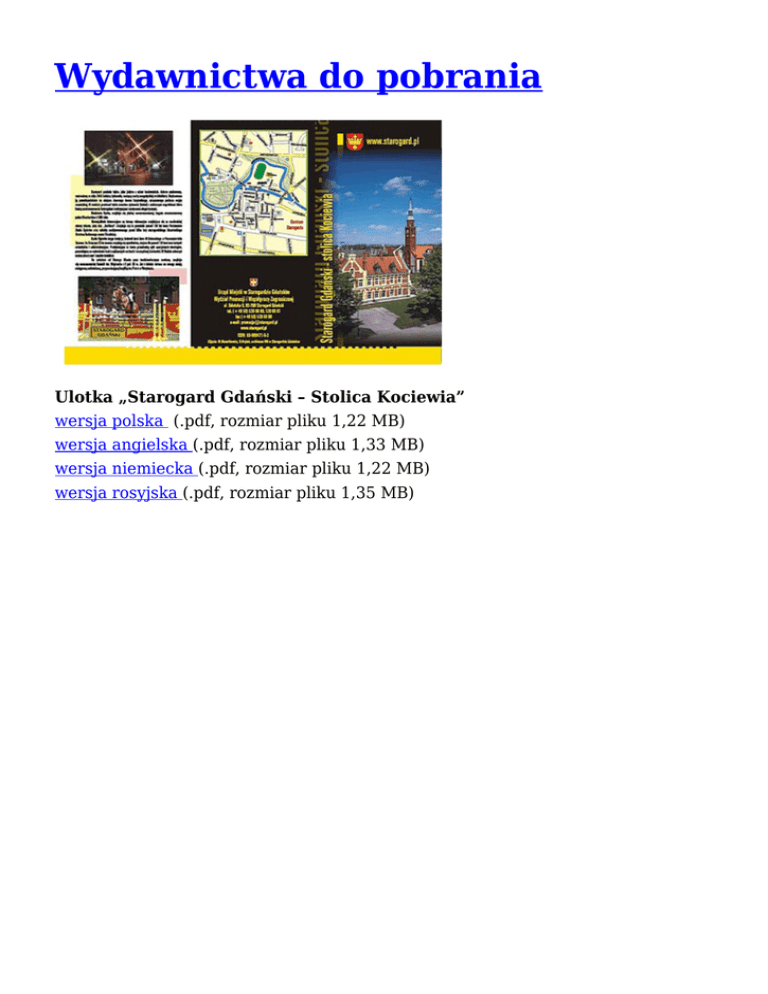 Wydawnictwa do pobrania Ulotka „Starogard Gdański – Stolica Kociewia” wersja polska (.pdf, rozmiar pliku 1,22 MB) wersja angielska (.pdf, rozmiar pliku 1,33 MB) wersja niemiecka (.pdf, rozmiar pliku 1,22 MB) wersja rosyjska (.pdf, rozmiar pliku 1,35 MB)