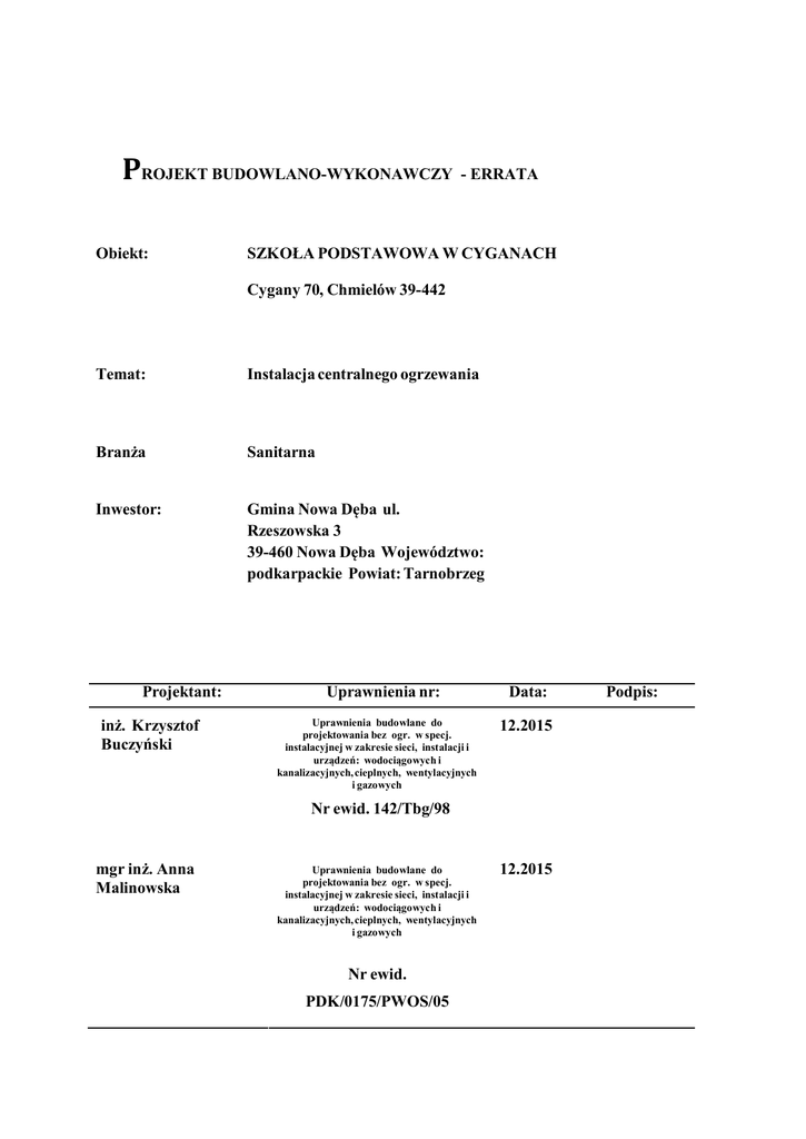 PROJEKT BUDOWLANO-WYKONAWCZY - ERRATA Obiekt: SZKOŁA PODSTAWOWA W CYGANACH Cygany 70, Chmielów 39-442 Temat: Instalacja centralnego ogrzewania Branża Sanitarna Inwestor: Gmina Nowa Dęba ul. Rzeszowska 3 39-460 Nowa Dęba Województwo: podkarpackie Powiat: Tarnobrzeg Projektant: inż. Krzysztof Buczyński Uprawnienia nr: Uprawnienia budowlane do projektowania bez ogr. w specj. instalacyjnej w zakresie sieci, instalacji i urządzeń: wodociągowych i kanalizacyjnych, cieplnych, wentylacyjnych i gazowych Data: 12.2015 Nr ewid. 142/Tbg/98 mgr inż. Anna Malinowska Uprawnienia budowlane do projektowania bez ogr. w specj. instalacyjnej w zakresie sieci, instalacji i urządzeń: wodociągowych i kanalizacyjnych, cieplnych, wentylacyjnych i gazowych Nr ewid. PDK/0175/PWOS/05 12.2015 Podpis: Załączniki: 1. Oświadczenie projektantów 2. Uprawnienia projektantów 3. Zaświadczenia o przynależności do Izby Inżynierów SPIS TREŚCI: Opis techniczny 1. Podstawa opracowania 2. Przedmiot, cel i zakres opracowania 2.1. Przedmiot opracowania 2.2. Cel opracowania 2.3. Zakres opracowania 3. Charakterystyka obiektu 4. Instalacja centralnego ogrzewania 4.1. Charakterystyka instalacji 4.2. Przewody I armature 4.3. Element grzejne 4.4. Odpowietrzenie instalacji c.o. 4.5. Zabezpieczenie antykorozyjne 5. Kotłownia 6. Próby ciśnieniowe 7. Wytyczne wykonania 8. Załącznik graficzny Spis rysunków: 1. Instalacja c.o. – rzut parteru 2. Instalacja c.o. – rzut piętra 3. Instalacja centralnego ogrzewania – rozwinięcie Rys. nr CO-1 Rys. nr CO-2 Rys. nr CO-3 TARNOBRZEG DNIA 18.12.2015r. OŚWIADCZENIE Zgodnie z art.20 ust.4 Prawa budowlanego (Dz. U. Nr 207 poz. 2016 z późniejszymi zmianami) oświadczam, że opracowany przeze mnie projekt branży: sanitarnej wewnętrznych instalacji centralnego ogrzewania: DLA BUDYNKU SZKOŁY PODSTAWOWEJ im. JANA PAWŁA II W CYGANACH Inwestor: Gmina Nowa Dęba ul. Rzeszowska 3, 39-460 Nowa Dęba został sporządzony zgodnie z obowiązującymi przepisami oraz zasadami wiedzy technicznej. Projektant: inż. sanit. Krzysztof Buczyński Nr upr. 142/TBG/98 ............................. (podpis) Sprawdzający: mgr inż. Anna Malinowska Nr upr. PDK/0175/PWOS/05 ............................. (podpis) OPIS TECHNICZNY Do projektu budowlano-wykonawczego instalacji centralnego ogrzewania dla szkoły podstawowej im. JANA PAWŁA II w Cyganach,, gmina Nowa Dęba” ZAMAWIAJĄCY: Gmina Nowa Dęba ul. Rzeszowska 3, 39-460 Nowa Dęba 1. PODSTAWA OPRACOWANIA − umowa z Zamawiającym − pomiary I oględziny − inwentaryzacja instalacji centralnego ogrzewania − Polskie normy I przepisy związane z opracowanym tematem 2. PRZEDMIOT, CEL I ZAKRES OPRACOWANIA 2.1 Przedmiot opracowania Przedmiotem opracowania jest termomodernizacja Szkoły Podstawowej W Cyganach, gmina Nowa Dęba w zakresie instalacji centralnego ogrzewania. 2.2. Cel I zakres opracowania Celem opracowania jest projekt instalacji centralnego ogrzewania dla całego budynku zgodnie z ustaleniami z Zamawiającym. Projekt obejmuje wymianę starej instalacji grzejnikowej I rur instalacyjnych do c.o. na nowe. Nową instalację c.o. projektuje się po trasie istniejącej. Powodem przebudowy instalacji c.o. jej termomodernizacja całego budynku wraz z dociepleniem zewnętrznym warstwą styropianu. 3. CHARAKTERYSTYKA OBIEKTU Modernizowany budynek to obiekt 2-kondygnacyjny, częściowo pdpiwniczony. Budynek składa się z części przeznaczonej na pomieszczenia edukacyjne, to jest: sale lekcyjne, pokój nauczycielski, gabinet lekarski, korytarze, pomieszczenia sanitarne: WC i pomieszczenie techniczne: kotłownia, kuchnia, zaplecze gastronomiczne oraz części sportowej sali gimnastycznej . Odrębną częścią budynku są pomieszczenia mieszkalne zlokalizowane na piętrze budynku. Część mieszkalna budynku nie objęta jest projektem modernizacji. W sali gimnastycznej zainstalowana jest nowa instalacja c.o. wraz z grzejnikami. Należy rozważyć wymianę tych grzejników lub pozostawienie ich w obecnym stanie, gdyż instalacja ta została wykonana niedawno i są w bardzo dobrym stanie. Do budynku doprowadzone są wszystkie media. Budynek pełni funkcję obiektu szkolno-sportowego z częścią mieszkalną. 4. INSTALACJA CENTRALNEGO OGRZEWANIA Parametry czynnika grzewczego na instalacje c.o. – 70/55˚C. Instalacja c.o. zasilana będzie z kotłowni znajdującej się w przyziemiu budynku. Projekt kotłowni według odrębnego opracowania. Obliczenia strat ciepła dokonano w oparciu o normy: PN-EN ISO 6946 - Norma na obliczeń współczynnika przenikania ciepła PN-B-03406 – Norma na obliczeń projekt. obciążenia cieplnego. Sumaryczna strata ciepła dla części budynku objętego opracowaniem wynosi: Qc.o. = 97,0 kW. Projektuje się 1 obieg grzewczy z podmieszaniem , który zasilać będzie cały o biekt część szkolno – dydaktyczą budynku . Przewody c.o. prowadzone będą częściowo pod stropem parteru i piwnic , oraz nad posadzką . Szczegóły dotyczące zapotrzebowania na ciepło poszczególnych pomieszczeń a także usytuowania i mocy zainstalowanych grzejników przedstawiono w graficznej części opracowania. Instalację projektuje się z rur stalowych bez szwu o średnicach DN15÷DN65 mm. Dane hydrauliczne : − Opór hydrauliczny instalacji I źródła ciepła dPc,[kPa] 19,0 − Całkowita pojemność instalacji Vc,[l] 985 − Całkowity strumień wody w instalacji − Obliczeniowa moc cieplna instalacji − Moc tracona Gc,[kg/s] Qo,[kW] Qtr,[kW] 1,54 96,8 19,5 − Całkowita moc przekazywana przez instalację Qcał,[kW] 97,0 4.1. Charakterystyka instalacji W celu rozprowadzenia czynnika grzewczego do grzejników w przedmiotowym obiekcie szkoły zaprojektowano jeden obieg z podmieszaniem wychodzący z układu kotłowego . Instalacja technologiczna kotłowa obejmuje zasilanie całego obiektu . Ukłąd instalacji c.o. na sali gimnastycznej wraz z grzejnikami zaleca się pozostawić bez zmian z uwagi na jego bardzo dobry