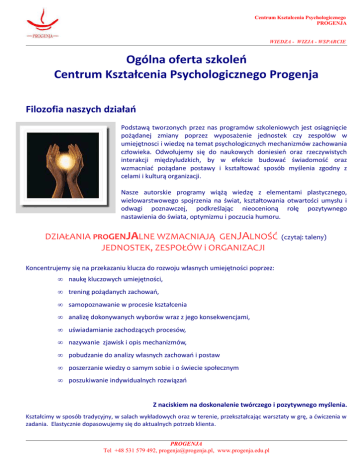 Centrum Kształcenia Psychologicznego PROGENJA WIEDZA - WIZJA - WSPARCIE Ogólna oferta szkoleń Centrum Kształcenia Psychologicznego Progenja Filozofia naszych działań Podstawą tworzonych przez nas programów szkoleniowych jest osiągnięcie pożądanej zmiany poprzez wyposażenie jednostek czy zespołów w umiejętnosci i wiedzę na temat psychologicznych mechanizmów zachowania człowieka. Odwołujemy się do naukowych doniesień oraz rzeczywistych interakcji międzyludzkich, by w efekcie budować świadomość oraz wzmacniać pożądane postawy i kształtować sposób myślenia zgodny z celami i kulturą organizacji. Nasze autorskie programy wiążą wiedzę z elementami plastycznego, wielowarstwowego spojrzenia na świat, kształtowania otwartości umysłu i odwagi poznawczej, podkreślając nieocenioną rolę pozytywnego nastawienia do świata, optymizmu i poczucia humoru. DZIAŁANIA PROGENJALNE WZMACNIAJĄ GENJALNOŚĆ JEDNOSTEK, ZESPOŁÓW i ORGANIZACJI (czytaj: taleny) Koncentrujemy się na przekazaniu klucza do rozwoju własnych umiejętności poprzez: • naukę kluczowych umiejętności, • trening pożądanych zachowań, • samopoznawanie w procesie kształcenia • analizę dokonywanych wyborów wraz z jego konsekwencjami, • uświadamianie zachodzących procesów, • nazywanie zjawisk i opis mechanizmów, • pobudzanie do analizy własnych zachowań i postaw • poszerzanie wiedzy o samym sobie i o świecie społecznym • poszukiwanie indywidualnych rozwiązań Z naciskiem na doskonalenie twórczego i pozytywnego myślenia. Kształcimy w sposób tradycyjny, w salach wykładowych oraz w terenie, przekształcając warsztaty w grę, a ćwiczenia w zadania. Elastycznie dopasowujemy się do aktualnych potrzeb klienta. PROGENJA Tel +48 531 579 492, [email protected], www.progenja.edu.pl Centrum Kształcenia Psychologicznego PROGENJA WIEDZA - WIZJA - WSPARCIE Zakres oferty szkoleniowej 1. Szkolenia, w formie warsztatów/ treningów z wykorzystaniem rozmaitych narzędzi w tym symulacyjnych gier szkoleniowych, doskonaląc rozwój osobisty i umiejętności poprzez uczenie się przez doświadczenie (experiential learning). 2. Procesy i programy rozwojowe w tym budowanie skutecznych zespołów zorientowanych na cel, wypracowywanie wspólnych wartości i wsparcie w procesie kształtowania kultury organizacji i etosu pracy Budowania wiedzy w firmie i tworzenie organizacji uczącej się z wykorzystaniem banchmarkingu wewnętrznego, zespołów w oparciu o istotne w firmie kryteria. 3. 4. Programy pobudzające zaangażowanie i efektywność pracowników przez m.in. włączenie działań z obszaru społecznej odpowiedzialności biznesu. 5. Coaching dla kadry zarządzającej i pracowników - indywidualne/ zespołowe wsparcie w rozwoju w osiąganiu wyznaczonych celów, w tym coaching motywacji czyli analiza motywacji jednostki z pomocą testu Motivational Maps (aktualny poziom, struktura motywacji) wraz z wypracowaniem strategii działań dbając o jej optymalnie wysoki poziom. Programy badawcze powstałe na skutek tworzenia nowych rozwiązań lub dostrzeganych utrudnień, które mają na celu usprawnianie funkcjonowania działów i organizacji: 6. Obserwacja Analiza Wnioski Program działań Usprawnienia Z podziałem na następujące obszary tematyczne: PROGENJA Tel +48 531 579 492, [email protected], www.progenja.edu.pl Centrum Kształcenia Psychologicznego PROGENJA WIEDZA - WIZJA - WSPARCIE Rozwój osobisty • • • • • • • • • • Komunikacja interpersonalna i praca w zespole • Postawa asertywna jako wartość osobista i podstawa dobrych relacji interpersonalnych • Postępowanie etyczne jako zasada i standard • Wystąpienia publiczne i autoprezentacja • Radzenie sobie ze stresem • Równowaga: życie zawodowe i życie osobiste Proaktywność i pozytywne myślenie Zarządzanie czasem Otwarty umysł i twórcze myślenie Podejmowanie decyzji i paradoks wyboru Savoir vivre na co dzień Budowanie mocy i budowanie marki osobistej Czytanie sytuacji - inteligencja emocjonalna w praktyce Umiejętność przeciwstawiania się psychomanipulacjom Perspektywiczne myślenie w pracy projektowej Przywództwo i umiejętności menedżerskie • • • • • • • • • • • • Rozwój kompetencji menedżerskich Szef – manager, lider czy przywódca. Coaching jako styl zarządzania Płeć a zarządzanie: praktyczna wiedza, wsparcie różnorodności. • Empowerment czyli stawiam na kadry • Sprawne i efektywne negocjacje: zasady, taktyki i strategie. Twórcze zarządzanie – podejmowanie decyzji i rola intuicji. Budowanie i zarządzanie zespołem Informacja zwrotna w rozwoju Delegowanie zadań i uprawnień Istota zarządzania zmianą. Inteligencja emocjonalna w pracy Konflikt i metody zaradcze Deszyfrant motywacji czyli jak rozumieć „chcieć”, by więcej „móc” PROGENJA Tel +48 531 579 492, [email protected], www.progenja.edu.pl Centrum Kształcenia Psychologicznego PROGENJA WIEDZA - WIZJA - WSPARCIE Sprzedaż • • • • Identyfikacja potrzeb klienta Biegłość interpersonalna czyli zrozumienie klienta Telefoniczne kontakty handlowe Twórcze wypracowywanie nowych form sprzedaży • • • • • Doskonalenie metod sprzedażowych Lider/ Coach w zespole handlowym Podstawy negocjacji handlowych Skuteczny doradca handlowy Budowanie trwałych relacji z klientami Zarządzanie zasobami ludzkimi • Zarządzanie zasobami ludzkimi: Nowoczesne ZZL, Selekcja i rekrutacja, Ocena kompetencji: AC/DC, derekrutacja, outplacement • Moderacja rozmów pracowniczych • Integracja z zamysłem: szkolenia w terenie – połączenie praktyki z teorią – wyjazdy integracyjne z uczeniem się przez doświadczenie. Inne • Grywalizacja w pracy – nowe działania marketingowe wzmagające motywację i rozwój jednostki • CSR czyli BOS - Biznes Odpowiedzialny Społecznie – zarządzanie wartościami, wypracowywanie kodeksów etycznych i działań w trzech podstawo