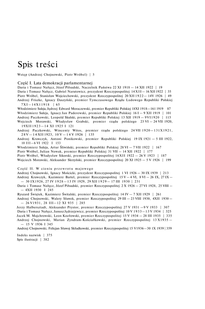 Spis treści Wstęp (Andrzej Chojnowski, Piotr Wróbel) | 5 Część I. Lata demokracji parlamentarnej Daria i Tomasz Nałęcz, Józef Piłsudski, Naczelnik Państwa 22 XI 1918 — 14 XII 1922 | 19 Daria i Tomasz Nałęcz, Gabriel Narutowicz, prezydent Rzeczypospolitej 14 X I I — 16 XII 1922 | 35 Piotr Wróbel, Stanisław Wojciechowski, prezydent Rzeczypospolitej 20 XII 1 9 2 2 — 14V 1926 | 49 Andrzej Friszke, Ignacy Daszyński, premier Tymczasowego Rządu Ludowego Republiki Polskiej 7 X I — 1 4 X 1 1 9 1 8 | 65 Włodzimierz Suleja, Jędrzej Edward Moraczewski, premier Republiki Polskiej 18XI 1918—161 1919 87 Włodzimierz Suleja, Ignacy Jan Paderewski, premier Republiki Polskiej 16 I — 9 XII 1919 | 101 Andrzej Paczkowski, Leopold Skulski, premier Republiki Polskiej 13 XII 1919 — 9 V I 1 9 2 0 | 115 Wojciech Morawski, Władysław Grabski, premier rządu polskiego 23 VI — 24 VII 1920, 1 9 X I I 1 9 2 3 — 1 4 XI 1 9 2 5 I 121 Andrzej Paczkowski, Wincenty Witos, premier rządu polskiego 24 VII 1 9 2 0 — 1 3 1 X 1 9 2 1 , 2 8 V — 1 4 XII 1923, 10 V — 1 4 V 1926 | 135 Andrzej Krawczyk, Antoni Ponikowski, premier Republiki Polskiej 19 IX 1921 — 5 III 1922, 10 I I I — 6 VI 1922 I 153 Włodzimierz Suleja, Artur Śliwiński, premier Republiki Polskiej 28 VI — 7 VII 1922 | 167 Piotr Wróbel, Julian Nowak, premier Republiki Polskiej 31 VII — 14 XII 1922 | 177 Piotr Wróbel, Władysław Sikorski, premier Rzeczypospolitej 1 6 X I I 1922 — 26 V 1923 | 187 Wojciech Morawski, Aleksander Skrzyński, premier Rzeczypospolitej 20 XI 1925 — 5 V 1926 | 199 C z ę ś ć II. W c i e n i u p r z e w r o t u m a j o w e g o Andrzej Chojnowski, Ignacy Mościcki, prezydent Rzeczypospolitej 1 VI 1926 — 30 IX 1939 | 213 Andrzej Krawczyk, Kazimierz Bartel, premier Rzeczypospolitej 15 V — 4 VI, 8 VI — 26 IX, 27 IX — — 30 I X 1 9 2 6 , 27 IV 1 9 2 8 — 1 3 IV 1929, 29 XII 1 9 2 9 — 17 III 1 9 3 0 | 231 Daria i Tomasz Nałęcz, Józef Piłsudski, premier Rzeczypospolitej 2 X 1926 — 27 VI 1928, 25 VIII — — 4XII 1930 I 245 Ryszard Świętek, Kazimierz Świtalski, premier Rzeczypospolitej 14 IV — 7 XII 1929 | 261 Andrzej Chojnowski, Walery Sławek, premier Rzeczypospolitej 29 III — 23 VIII 1930, 4XII 1930 — — 26 V 1 9 3 1 , 28 III—12 XI 935 | 285 Jerzy Halbersztadt, Aleksander Prystor, premier Rzeczypospolitej 27 V 1931 —9 V 1933 | 307 Daria i Tomasz Nałęcz, Janusz Jędrzejewicz, premier Rzeczypospolitej 10 V 1 9 3 3 — 1 3 V 1934 | 325 Jacek M. Majchrowski, Leon Kozłowski, premier Rzeczypospolitej 15 V 1934 — 28 III 1935 | 335 Andrzej Chojnowski, Marian Zyndram-Kościałkowski, premier Rzeczypospolitej 13 X 1 9 3 5 — — 15 V 1936 I 345 Andrzej Chojnowski, Felicjan Sławoj Składkowski, premier Rzeczypospolitej 15 V1936—30 1X 1939 | 359 Indeks nazwisk | 375 Spis ilustracji | 382