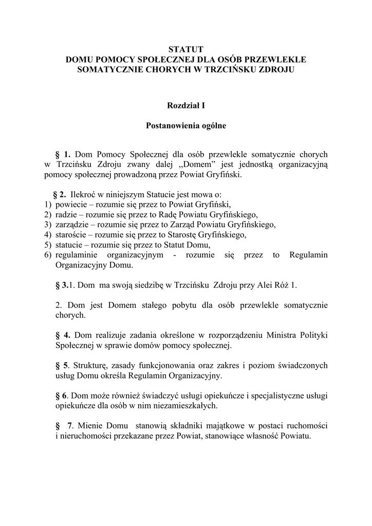 STATUT DOMU POMOCY SPOŁECZNEJ DLA OSÓB PRZEWLEKLE SOMATYCZNIE CHORYCH W TRZCIŃSKU ZDROJU Rozdział I Postanowienia ogólne § 1. Dom Pomocy Społecznej dla osób przewlekle somatycznie chorych w Trzcińsku Zdroju zwany dalej ,,Domem” jest jednostką organizacyjną pomocy społecznej prowadzoną przez Powiat Gryfiński. § 2. Ilekroć w niniejszym Statucie jest mowa o: 1) powiecie – rozumie się przez to Powiat Gryfiński, 2) radzie – rozumie się przez to Radę Powiatu Gryfińskiego, 3) zarządzie – rozumie się przez to Zarząd Powiatu Gryfińskiego, 4) staroście – rozumie się przez to Starostę Gryfińskiego, 5) statucie – rozumie się przez to Statut Domu, 6) regulaminie organizacyjnym - rozumie się przez to Organizacyjny Domu. Regulamin § 3.1. Dom ma swoją siedzibę w Trzcińsku Zdroju przy Alei Róż 1. 2. Dom jest Domem stałego pobytu dla osób przewlekle somatycznie chorych. § 4. Dom realizuje zadania określone w rozporządzeniu Ministra Polityki Społecznej w sprawie domów pomocy społecznej. § 5. Strukturę, zasady funkcjonowania oraz zakres i poziom świadczonych usług Domu określa Regulamin Organizacyjny. § 6. Dom może również świadczyć usługi opiekuńcze i specjalistyczne usługi opiekuńcze dla osób w nim niezamieszkałych. § 7. Mienie Domu stanowią składniki majątkowe w postaci ruchomości i nieruchomości przekazane przez Powiat, stanowiące własność Powiatu. Rozdział II Struktura organizacyjna § 8. 1. Strukturę organizacyjną stanowią: 1) dyrektor, 2) dział administracji i obsługi, 3) dział opiekuńczo- terapeutyczny. 2. Dyrektor wykonuje zadania ustawowe związane z organizacją i funkcjonowaniem Domu w oparciu o współpracę działów: administracyjnoobsługowego i opiekuńczo-terapeutycznego. § 9. Zasady kierowania Domem: 1. Dyrektor zatrudniony przez Zarząd kieruje Domem przy pomocy grupy decyzyjnej. 2. Stosunek pracy z dyrektorem Domu na podstawie umowy o pracę nawiązuje Starosta. 3. Dyrektor zarządza mieniem Domu. 4. Dyrektor jest pracodawcą w rozumieniu Kodeksu Pracy dla pracowników zatrudnionych w Domu. 5. Dyrektor reprezentuje Dom na zewnątrz a podczas jego nieobecności czyni to osoba wyznaczona na piśmie przez Dyrektora. 6. Zakres obowiązków Dyrektora określa regulamin. Rozdział III Gospodarka finansowa § 10.1 Dom jest jednostka budżetową sektora finansów publicznych, która pokrywa swoje wydatki bezpośrednio z budżetu a dochody przekazuje na rachunek Powiatu Gryfińskiego. 2. Dom prowadzi gospodarkę finansową według zasad określonych w ustawie o finansach publicznych. 3. Podstawą gospodarki finansowej jest plan dochodów i wydatków, zwany planem finansowym, opracowany przez dyrektora na okres każdego roku budżetowego, zatwierdzony przez Radę. 4. Dom może gromadzić dochody na utworzonym wydzielonym rachunku dochodów własnych. 5.W przypadku utworzenia rachunku dochodów własnych na wyżej wymienionym rachunku po wyczerpaniu procedury jego utworzenia mogą być gromadzone: − opłaty za udostępnianie dokumentacji przetargowej, − spadki, zapisy i darowizny w postaci pieniężnej na rzecz Domu; − odszkodowania i wpłaty za utracone lub uszkodzone mienie będące w zarządzie bądź użytkowaniu Domu. 7. Dom prowadzi odrębny rachunek bankowy Zakładowego Funduszu Świadczeń Socjalnych. Rozdział IV Postanowienia końcowe § 11. Zmiany niniejszego Statutu dokonywane są w trybie jego ustalenia.
