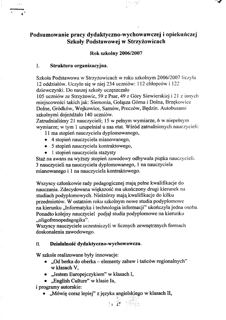 Podsumowanie pracy dydaktyczno-wychowawczej i opiekunczej SzkoJy Podstawowej w Strzyzowicach Rok szkolny 2006/2007 I. Struktura organizacyjna. Szkoia Podstawowa w Strzyzowicach w roku szkolnym 2006/2007 liczyla 12 oddzialow. Uczylo si§ w niej 234 uczniow: 112 chtopcow i 122 dziewczynki. Do naszej szkoty ucz?szczato 105 uczniow ze Strzyzowic, 59 z Psar, 49 z Gory Siewierskiej i 2 i z innych miejscowosci takich jak: Siemonia, Gola_sza Gorna i Dolna, Brzekowice Dolne, Grodkow, Wojkowice, Sarnow, Preczow, B^dzin. Autobusami szkolnymi dojezdzalo 140 uczniow. Zatrudnialismy 21 nauczycieli; 15 w pelnym wymiarze, 6 w niepehiym wymiarze; w tym 1 uzupemial u nas etat. Wsrod zatrudnionych nauczycieli: 11 ma stopien nauczyciela dyplomowanego, • 4 stopien nauczyciela mianowanego, • 5 stopien nauczyciela kontraktowego, • 1 stopien nauczyciela stazysty Staz na awans na wyzszy stopien zawodowy odbywaia piatka nauczycieli. 3 nauczycieli na nauczyciela dyplomowanego, 1 na nauczyciela mianowanego i 1 na nauczyciela kontraktowego. Wszyscy cztonkowie rady pedagogicznej majq. pelne kwalifikacje do nauczania. Zdecydowana wi^kszosc ma ukonczony drugi kierunek na studiach podyplomowych. Niektorzy maja_ kwalifikacje do kilku przedmiotow. W ostatnim roku szkolnym nowe studia podyplomowe na kierunku ,,Informatyka i technologia informacji" ukonczyla jedna osoba. Ponadto kolejny nauczyciel podjai studia podyplomowe na kierunku ,,ol igofrenopedagogika". Wszyscy nauczyciele uczestniczyli w licznych zewn^trznych formach doskonalenia zawodowego. II. Dzialalnosc dydaktyczno-wychowawcza. W szkole realizowane by}y innowacje: • ,,Od berka do oberka - elementy zabaw i tancow regionalnych" w klasach V, • ,Jestem Europejczykiem" w klasach I, • ,,English Culture" w klasie la, i programy autorskie: • ,,M6wi? coraz lepiej" z j^zyka angielskiego w klasach II, if ,Wykorzystanie rnet^yK^pchowej w ksztaiceniu zintegrowanym" w klasie Ha • ,,Magiczny swiat j?zyka angielskiego" w klasie Ila, • ,,EIementy informatyki w edukacji wczesnoszkolnej" w klasie Illb, • ,,Nie damy si? nudzie" - profilaktyka zdrowotna z elementami muzykoterapii realizowany w ramach swietlicy. W szkole funkcjonowaty kofka: komputerowe, SKS-u, jezyka angielskiego, wokalne, maiematyczne, historyczne, plastyczne, dziennikarskie Dziaiaf: • Uczniowski Samorzajd Szkolny, • Gromada Zuchowa ,,Lesne Skrzaty", • Klub Enropejski ,,Zakumplowani z Europe', • Klub Pilki Noznej. Na mocy zawartego porozumienia zajecia z przysposobienia czytelniczoinformacyjnego odbywaty si? w Bibliotece Publiczej w Psarach - Filia w Strzyzowicach. III. Imprezy organizowane przez placowk$. Szkola organizowala imprezy: • Uroczystosc jubileuszu 100 - lecia szkoly, • gminn% uroczystosc podsumowania konkursow o tematyce bozonarodzeniowej: plastycznego ,,Szopka" i komputerowego i ,,MaIowanie na ekranie", • konkurs ,,Matematyka na wesolo" dla uczniow ze szkoi z gminy Psary i Bobrowniki, • Bozonarodzeniowy Koncert dla Rodzicow, • Bal Noworoczny, • Gminny Turniej Tenisa StoJowego, • Zuchowy Wieczor Kol^d, • Dzieii Babci i Dziadka, • Piknik Rodzinny z okazji Dnia Mamy W ramach obchodow jubileuszu 100-lecia szkoly: • • Ufundowano nowy sztandar szkoly, Wydano publikacj? ,,100 lat Szkoly Podstawowej im. Stanisiawa Polakowskiego w Strzyzowicach", • • Przedstawiciele spolecznosci szkolnej byli w Poraju; zlozyli kwiaty na grobie patrona szkoty i odwiedzili cork? patrona Barbar? Polakowska^ Odbyiy si? spotkania absolwentow szkoly, i1 .-|(-*St» -E >wano wystaws fotofrafn, be_dacej podsumowaniem konkursu m^ szkoia w obiektywie", Cmizowano Spotkania z dedykacj^artystyczna.dla przyjaciot . J^crfonWwKGW.OSP.ZHPiPTIX, ^ . Utworzono strong internetowa. szkoty, . przygotowano prezentacje. multimedialna. ,,Histona Szkoty • podstawowej w Strzyzowicach, Przygotowano jubileuszowe wydanie gazetki szkolnej ,,Oczami Ucznia". Ponadto zgodnie z kalendarzem imprez organizowano apele szkoine i imprezy klasowe. Uczniowie klas pia.tych uczestniczyli w ogolnopolskim programie edukacyjnym ,,Kazdy uczen wie, co robic z ZSEE". W okresie ferii zimowych zorganizowalismy dla uczniow zimowisko w We_gierskiej Gorce. Uczniowie klas trzecich uczestniczyli w wyjezdzie srodrocznym na ,,zielona^szko^. Ponadto zorganizowalismy wycieczki edukacyjne, turystyczno-krajoznawcze do Pszczyny, Wytworni Filmow Rysunkowych w Bielsku-Bialej, do Wrodawia, Wesolego Miasteczka w Chorzowie,, do Grabowej, Krakowa, W?gierskiej Gorki , do kin i teatrow. W ramach otrzymanych nagrod uczniowie uczestniczyli ponadto w wycieczkach do Lesniowa i Cze_stochowy, do Warszawy i Wisfy. IV. Osiqgni^cia uczniow w roku szkolnym 2006/2007 1. Kasia Ferdyn finalistka. Wojewodzkiego Konkursu Interdyscyplinarnego, zakwalifikowanie si? Karoliny Makulskiej i Klaudii Smoty do rejonowego etapu konkursu interdyscyplinarnego. 2. Ania Sobieraj finalist^ Kasia Ferdyn, Maja Ligenza, Igor Kotula potfinalistami konkursu ,,Nudna Matematyka" organizowanego przez Palac Mlodziezy w Katowicach, 3. Pierwsze miejsca w powiecie Michala Jakobczyka, Igora Kotuly, Patryka Bubel, Wojtka Wyderki, Army Pierzchaty w Mistrzostwach Polski Dzieci i Mlodziezy ,,Kwadratura Kola", 4. II miejsce Jakuba Swobody, wyroznienie dla Sandry Przybylek w Konkursie ,,Maty OKR" w Katowicach, 5. I miejsce zuchow i solistek Kamili Zdenkowskiej i Dominiki Hamery na Festiwalu Piesni Maryjnych, Mce uczniow klasy Ifla i wyroznienie dla Jakuba Swobody - cztonka ze£ohi dzialajacego w Swietlicy w Preczowie w Przeglajizie Widowisk Teatralnych ,,Zywoty Swie_tych i Patronow", I miejsce Karoliny Makulskiej, II miejsce Kasi Ferdyn w Gminnym Konkursie Informatycznym, 8 Wyroznienie dla Igora Kotuty w Gminnym Konkursie ,,Matematyk Roku 2007" 9. I miejsce Jakuba Swobody w Gminnym Przegla^dzie Kabaretowym organizowanym przez Gminny Osrodek Kultury, 10.11 miejsce Karoliny Makulskiej w Powiatowym Konkursie Plastycznym Ozdoby wielkanocne", 11 .Zdobycie przez Angelik? Przybylek tytuhi laureata I