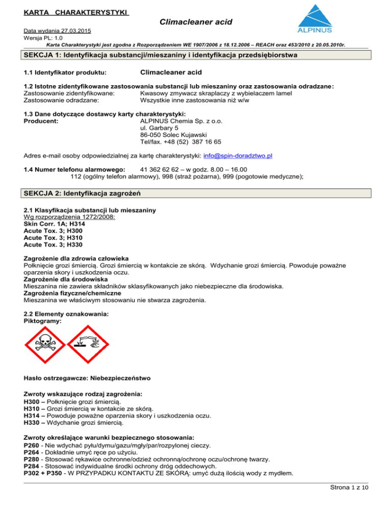 KARTA CHARAKTERYSTYKI Climacleaner acid Data wydania 27.03.2015 Wersja PL: 1.0 Karta Charakterystyki jest zgodna z Rozporządzeniem WE 1907/2006 z 18.12.2006 – REACH oraz 453/2010 z 20.05.2010r. SEKCJA 1: Identyfikacja substancji/mieszaniny i identyfikacja przedsiębiorstwa 1.1 Identyfikator produktu: Climacleaner acid 1.2 Istotne zidentyfikowane zastosowania substancji lub mieszaniny oraz zastosowania odradzane: Zastosowanie zidentyfikowane: Kwasowy zmywacz skraplaczy z wybielaczem lamel Zastosowanie odradzane: Wszystkie inne zastosowania niż w/w 1.3 Dane dotyczące dostawcy karty charakterystyki: Producent: ALPINUS Chemia Sp. z o.o. ul. Garbary 5 86-050 Solec Kujawski Tel/fax. +48 (52) 387 16 65 Adres e-mail osoby odpowiedzialnej za kartę charakterystyki: [email protected] 1.4 Numer telefonu alarmowego: 41 362 62 62 – w godz. 8.00 – 16.00 112 (ogólny telefon alarmowy), 998 (straż pożarna), 999 (pogotowie medyczne); SEKCJA 2: Identyfikacja zagrożeń 2.1 Klasyfikacja substancji lub mieszaniny Wg rozporządzenia 1272/2008: Skin Corr. 1A; H314 Acute Tox. 3; H300 Acute Tox. 3; H310 Acute Tox. 3; H330 Zagrożenie dla zdrowia człowieka Połknięcie grozi śmiercią. Grozi śmiercią w kontakcie ze skórą. Wdychanie grozi śmiercią. Powoduje poważne oparzenia skory i uszkodzenia oczu. Zagrożenie dla środowiska Mieszanina nie zawiera składników sklasyfikowanych jako niebezpieczne dla środowiska. Zagrożenia fizyczne/chemiczne Mieszanina we właściwym stosowaniu nie stwarza zagrożenia. 2.2 Elementy oznakowania: Piktogramy: Hasło ostrzegawcze: Niebezpieczeństwo Zwroty wskazujące rodzaj zagrożenia: H300 – Połknięcie grozi śmiercią. H310 – Grozi śmiercią w kontakcie ze skórą. H314 – Powoduje poważne oparzenia skory i uszkodzenia oczu. H330 – Wdychanie grozi śmiercią. Zwroty określające warunki bezpiecznego stosowania: P260 - Nie wdychać pyłu/dymu/gazu/mgły/par/rozpylonej cieczy. P264 - Dokładnie umyć ręce po użyciu. P280 - Stosować rękawice ochronne/odzież ochronną/ochronę oczu/ochronę twarzy. P284 - Stosować indywidualne środki ochrony dróg oddechowych. P302 + P350 - W PRZYPADKU KONTAKTU ZE SKÓRĄ: umyć dużą ilością wody z mydłem. Strona 1 z 10 KARTA CHARAKTERYSTYKI Climacleaner acid Data wydania 27.03.2015 Wersja PL: 1.0 Karta Charakterystyki jest zgodna z Rozporządzeniem WE 1907/2006 z 18.12.2006 – REACH oraz 453/2010 z 20.05.2010r. P305 + P351 + P338 - W PRZYPADKU DOSTANIA SIĘ DO OCZU: Ostrożnie płukać wodą przez kilka minut. Wyjąć soczewki kontaktowe, jeżeli są i można je łatwo usunąć. Nadal płukać. P310 - Natychmiast skontaktować się z OŚRODKIEM ZATRUĆ lub lekarzem. Zawiera: Kwas fosforowy (CAS: 7664-38-2), Kwas fluorowodorowy (CAS: 7664-39-3) 2.3 Inne zagrożenia: Brak informacji na temat spełnienia kryteriów PBT lub vPvB zgodnie z załącznikiem XIII rozporządzenia REACH. Odpowiednie badania nie były przeprowadzone. SEKCJA 3: Skład/informacja o składnikach 3.1 Substancje: Nie dotyczy 3.2 Mieszaniny: Niebezpieczne składniki: Identyfikator produktu Kwas fosforowy CAS: 7664-38-2 WE: 231-633-2 Nr indeksowy: 015-011-00-6 Nr REACH: substancja podlega przepisom okresu przejściowego Kwas fluorowodorowy CAS: 7664-39-3 WE: 231-634-8 Nr indeksowy: 009-002-00-6 Nr REACH: substancja podlega przepisom okresu przejściowego Zawartość % Klasyfikacja CLP Kody zwrotów Klasa zagrożenia i wskazujących kody kategorii rodzaj zagrożenia 8 -13 Skin Corr. 1B H314 7 -11 Acute Tox.2 Acute Tox.1 Acute Tox.2 Skin Corr.1A H330 H310 H300 H314 1-3 Acute Tox.4 Skin irrit. 2 Eye Irrit. 2 H302 H312 H332 H315 H319 2-butoksyetanol CAS: 111-76-2 WE: 203-905-0 Nr indeksowy: 603-014-00-0 Nr REACH: substancja podlega przepisom okresu przejściowego Pełna treść zwrotów H w sekcji 16 SEKCJA 4: Środki pierwszej pomocy 4.1 Opis środków pierwszej pomocy W przypadku kontaktu ze skórą: Zanieczyszczoną skórę umyć natychmiast dużą ilością wody – prysznic, a zanieczyszczoną odzież czy buty zdejmować pod prysznicem. Zanieczyszczoną przez kwas fluorowodorowy skórę należy zmyć woda jak najszybciej, w ciągu pierwszych 5 minut. Po umyciu skóry, skórę posmarować żelem z 5% glukonianem wapnia, aż do całkowitego ustąpienia bólu. Smarowanie skóry żelem z glukonianem należy wykonywać w gumowych rękawiczkach, aby uniknąć zanieczyszczenia skóry fluorowodorem. Alternatywnie, zamiast glukonianu wapnia można stosować lodowaty wodny lub alkoholowy roztwór 0,13% (1:750) chlorku benzalkoniowego (chlorek zefiranu) lub lodowaty 70% roztwór alkoholu albo lodowaty nasycony roztwór siarczanu magnezu (sól epsom) przez okres co najmniej 30 minut. Jeśli oparzenia są w miejscu trudnym do spłukania, wówczas lodowaty roztwór należy nanosić za pomocą kompresów, zmienianych co najmniej co 2 minuty. Jednak do chwili przybycia lekarza, należy kontynuować stosowanie jednego z wymienionych lodowatych roztworów nawet od dwóch do czterech godzin. W przypadków poparzenia znacznej powierzchni skóry, około 156 cm2 (25 cali kwadratowych) może wystąpić hipokalcemia. W takie sytuacji należy systematycznie podawać glukonian wapnia oraz monitorować poziom wapnia w surowicy i czynność nerek oraz wątroby. W przypadku kontaktu z oczami: Strona 2 z 10 KARTA CHARAKTERYSTYKI Climacleaner acid Data wydania 27.03.2015 Wersja PL: 1.0 Karta Charakterystyki jest zgodna z Rozporządzeniem WE 1907/2006 z 18.12.2006 – REACH oraz 453/2010 z 20.05.2010r. W przypadku nawet nieznacznego zanieczyszczenia oczu kwasem fluorowodorowym natychmiast należy płukać oczy bieżącą wodą, przy podwiniętych powiekach, przez 5 minut. Po tym wstępnym płukaniu, niezwłocznie płukać oczy, przez kolejne 5-10 minut, 1% roztworem glukonianu wapnia. Następnie co 2-3 godziny zakraplać oczy 1% roztworem glukonianu wapnia. Zasięgnąć niezwłocznie porady lekarza – okulisty. Bez zaleceń lekarza nie stosować żadnych olejów ani