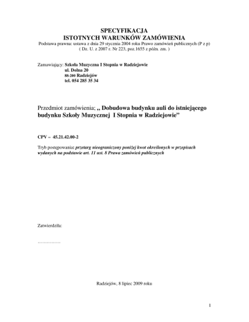 SPECYFIKACJA ISTOTNYCH WARUNKÓW ZAMÓWIENIA Podstawa prawna: ustawa z dnia 29 stycznia 2004 roku Prawo zamówie publicznych (P z p) ( Dz. U. z 2007 r. Nr 223, poz.1655 z pó n. zm. ) Zamawiaj cy: Szkoła Muzyczna I Stopnia w Radziejowie ul. Dolna 20 88-200 Radziejów tel. 054 285 35 34 Przedmiot zamówienia; „ Dobudowa budynku auli do istniej cego budynku Szkoły Muzycznej I Stopnia w Radziejowie” CPV – 45.21.42.00-2 Tryb post powania: przetarg nieograniczony poni ej kwot okre lonych w przepisach wydanych na podstawie art. 11 ust. 8 Prawa zamówie publicznych Zatwierdziła: …………… Radziejów, 8 lipiec 2009 roku 1 Specyfikacja istotnych warunków zamówienia ( SIWZ ) dla post powania o udzielenie zamówienia publicznego o warto ci poni ej kwot okre lonych w przepisach wydanych na podstawie art. 11 ust. 8 Prawa zamówie publicznych, prowadzonego w trybie przetargu nieograniczonego. 1. INFORMACJE OGÓLNE 1.1 Post powanie b dzie prowadzone na podstawie przepisów ustawy z dnia 29 stycznia 2004 r. – Prawo zamówie publicznych ( Dz. U. z 2007 r. Nr 223, poz. 1655 z pó n. zm. ) 1.2 W uzasadnionych przypadkach Zamawiaj cy mo e przed upływem terminu składania ofert zmieni tre Specyfikacji Istotnych Warunków Zamówienia ( dalej SIWZ). Dokonan zmian specyfikacji przekazuje niezwłocznie wszystkim Wykonawcom, którym przekazano specyfikacj oraz udost pnia na stronie internetowej na której opublikowano SIWZ. 1.3 Zamawiaj cy przedłu y termin składania ofert z uwzgl dnieniem czasu niezb dnego do wprowadzenia w ofertach zmian wynikaj cych z modyfikacji tre ci SIWZ. Informacj o przedłu eniu terminu składania ofert Zamawiaj cy przeka e niezwłocznie wszystkim Wykonawcom, którym przekazano SIWZ oraz zamie ci na stronie internetowej, na której opublikowano SIWZ. 1.4 Ka dy z Wykonawców mo e zwróci si do Zamawiaj cego o wyja nienie tre ci SIWZ. Zamawiaj cy udzieli wyja nie niezwłocznie, e pro ba o wyja nienie tre ci specyfikacji wpłyn ła chyba do Zamawiaj cego na mniej ni 6 dni przed terminem składania ofert. Tre wyja nienia zostanie przekazana jednocze nie wszystkim Wykonawcom, którym dor czono SIWZ, bez ujawniania ródła zapytania oraz zamieszczona na stronie internetowej. 1.5 Zamawiaj cy nie przewiduje zwołania zebrania wszystkich Wykonawców w celu wyja nienia w tpliwo ci dotycz cych tre ci SIWZ. 2. OPIS PRZEDMIOTU ZAMÓWIENIA 2.1 Przedmiotem zamówienia jest: dobudowa budynku auli do istniej cego budynku Szkoły Muzycznej I Stopnia poło onej przy ul. Dolnej 20 w Radziejowie. Budynek auli b dzie obiektem nie podpiwniczonym, parterowym, krytym dachem jednospadowym i dwuspadowym w cz ci ł cznika. Budynek auli w kształcie prostok ta nale y wykona w stanie surowym zamkni tym. Wymiary zewn trzne budynku – 12,30 x 15,00 m, Kubatura 870,92 m3 . Dobudowa auli w stanie surowym zamkni tym, stanowi I etap budowy w 2009 roku a pozostały zakres prac jako II etap budowy planowany jest na rok 2010. ( na II etap zostanie ogłoszony przetarg nieograniczony ) 2 2.2 Szczegółowy zakres zamówienia i sposób jego realizacji okre lony jest w przedmiarze robót ( kosztorysie ofertowym – nakłady ), dokumentacji projektowej, oraz specyfikacjach technicznych wykonania i odbioru robót budowlanych. 2.3 Prace wchodz ce w skład zamówienia musz by wykonywane zgodnie z dokumentacj techniczn , specyfikacjami technicznymi wykonania i odbioru robót budowlanych, zasadami sztuki budowlanej, obowi zuj cymi przepisami i normami oraz nale yt staranno ci . 2.4 Do Wykonawcy nale y zabezpieczenie i oznakowanie terenu robót, uporz dkowanie terenu po zako czeniu robót oraz dokonanie uzgodnie niezb dnych do prawidłowej realizacji i zako czenia oraz odbioru robót. 2.5 Wymaga si gwarancji – min 5 lat na przedmiot zamówienia. 2.6 Zamawiaj cy przekazuje nast puj ce dokumenty: - Pozwolenie na budow – Nr 40/2009 z dnia 17.03.2009. - Decyzj Wojewódzkiego Urz du Ochrony Zabytków w Toruniu Delegatury we Włocławku WOZU/W.AR. – 336/2009 z dnia 12.03.2009 – na prowadzenie prac w formie nadzoru archeologicznego - Decyzj Wojewódzkiego Urz du Ochrony Zabytków w Toruniu Delegatury we Włocławku Nr 57/2009 z dnia 16.03.2009. - Dokumentacj projektow : - Projekt budowlany – Dobudowa budynku auli do istniej cego budynku Szkoły Muzycznej I – go Stopnia w Radziejowie ( bran a – architektura, konstrukcja, instalacje sanitarne i elektryczne ) - Specyfikacja techniczna wykonania i odbioru robót – Dobudowa budynku auli do ist. Budynku Szkoły Muzycznej I-go Stopnia w Radziejowie ( bran a – budowlana ) - Przedmiar robót – Etap I - Kosztorys ofertowy – nakłady - Dokumentacja geotechniczna - Projekt zagospodarowania terenu 1: 500 2.11 W ramach obowi zków Wykonawcy jest równie : - obsługa geodezyjna budowy na koszt Wykonawcy - nadzór archeologiczny zgodnie z decyzj WOZU/W.AR – 336/2009 2.12 Zamawiaj cy wymaga wykonania co najmniej 51 % warto ci prac obj tych zamówieniem siłami Wykonawcy. Pozostałe prace mog by wykonane siłami podwykonawców. 2.13 Je eli Wykonawca zamierza powierzy wykonanie cz ci zamówienia podwykonawcom wymaga si , by w tre ci oferty wskazał te cz ci zamówienia oraz podał nazwy ( firmy ) proponowanych podwykonawców . 3 3. OPIS CZ CI ZAMÓWIENIA 3.1. Zamawiaj cy nie dopuszcza mo liwo ci składania ofert cz ciowych. 3.2. Zamawiaj cy nie przewiduje mo liwo ci udzielenia zamówie uzupełniaj cych. 3.3.Zamawiaj cy nie dopuszcza mo liwo ci składania ofert wariantowych. 3.4. Zamawiaj cy dopuszcza składanie ofert równowa nych. Ewentualne u ycie w dokumentacji projektowej okre le i nazw własnych ma jedynie charakter przykładowy i słu y okre leniu klasy i jako ci wbudowanych materiałów i dostarczonych urz dze . Zamawiaj cy wymaga by u yte materiały i urz dzenia, o ile s inne, posiadały parametry jako ciowe i techniczne nie gorsze ni okre lone w dokumentacji projektowo – technicznej. 4. TERMIN WYKONANIA ZAMÓWIENIA 4.1.Wykonawca zobowi zany jest zrealizowa 