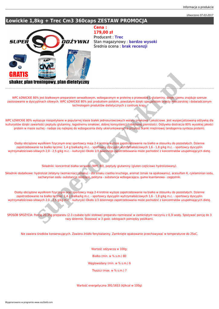 Informacje o produkcie Utworzono 07-03-2017 Łowickie 1,8kg + Trec Cm3 360caps ZESTAW PROMOCJA Cena : 179,00 zł .p l Producent : Trec Stan magazynowy : bardzo wysoki Średnia ocena : brak recenzji ki WPC ŁOWICKIE 80% jest białkowym preparatem serwatkowym, wzbogaconym w proteinę o przewadze L-glutaminy, dzięki czemu znajduje szersze zastosowanie w dyscyplinach siłowych. WPC ŁOWICKIE 80% jest produktem polskim, powstałym dzięki specjalistom branży mleczarskiej i doświadczonym technologom produktów dietetycznych z centrum kraju. ro dz y w WPC ŁOWICKIE 80% wykazuje niespotykane w popularnej klasie białek jednosurowcowych walory smakowe i jakościowe. Jest wyspecjalizowaną odżywką dla kulturystów dzięki zawartości peptydu glutaminy, łagodnemu smakowi, dobrej konsystencji i obniżonej pienistości. Odżywka dostracza 80% wysokiej jakości protein w masie suchej - nadaje się najlepiej do wzbogacenia diety ukierunkowanej na przyrost tkanki mięśniowej (endogenna synteza protein). Osoby obciążone wysiłkiem fizycznym oraz sportowcy mają 2-4 krotnie wyższe zapotrzebowanie na białko w stosunku do pozostałych. Dzienne zapotrzebowanie na białko łącznie: 1,4 g białka/kg m.c. - sportowcy dyscyplin wytrzymałościowych 1,6 - 1,8 g/kg m.c. - sportowcy dyscyplin wytrzymałościowo-siłowych 2,0 - 2,5 g/kg m.c. - kulturyści Około 1/3 dziennego zapotrzebowania może pochodzić z koncentratów uzupełniających dietę. Składniki: koncentrat białka serwatki (WPC 80), peptydy glutaminy (gluten częściowo hydrolizowany). pe Składniki dodatkowe: hydrolizat żelatyny (wzmacniacz smaku) - dla smaku ciastka kruchego, aromat (smak na opakowaniu), acesulfam K, cyklaminian sodu, sacharynian sodu -substancje słodzące, pektyna - substancja wzbogacająca, guma ksantanowa - zagęstnik. su Osoby obciążone wysiłkiem fizycznym oraz sportowcy mają 2-4 krotnie wyższe zapotrzebowanie na białko w stosunku do pozostałych. Dzienne zapotrzebowanie na białko łącznie: 1,4 g białka/kg m.c. - sportowcy dyscyplin wytrzymałościowych 1,6 - 1,8 g/kg m.c. - sportowcy dyscyplin wytrzymałościowo-siłowych 2,0 - 2,5 g/kg m.c. - kulturyści Około 1/3 dziennego zapotrzebowania może pochodzić z koncentratów uzupełniających dietę. SPOSÓB SPOŻYCIA: Porcję 20-35g preparatu (2-3 czubate łyżki stołowe) preparatu rozmieszać w zamkniętym naczyniu z 0,3l wody. Spożywać porcję do 3 razy dziennie. Stosować w 3 godz. odstępach pomiędzy posiłkami. Nie zawiera środków konserwujących. Zawiera źródło fenyloalaniny. Zamknięte opakowanie przechowywać w temperaturze do 25oC. Wartość odżywcza w 100g: Białko (min. w % s.m.) 80 Węglowodany (min. w % s.m.) 6 Tłuszcz (max. w % s.m.) 7 Wartość energetyczna 391/1653 (kJ/kcal w 100g) Wygenerowano w programie www.oscGold.com Zawartość aminokwasów w 100g białka: Alanina 5,41g Arginina 2,741g Kwas asparginowy 10,01g Cystyna 2,25g Kwas glutaminowy 20,60g Glicyna 2,68g Histydyna 1,46g Izoleucyna* 5,71g .p l Leucyna* 10,03g Lizyna 7,53g Fenyloalanina 3,75g Prolina 6,75g w Seryna 4,88g ki Metionina 2,31g Treonina 6,02g ro dz y Tryptofan 1,26g Tyrozyna 2,78g Walina* 5,14g *aminokwasy egzogenne Naturalna zawartość witamin i mikroelementów w 100g: su pe Witamina A 25,8mg(3,2%*) Witamina E 0,0612mg (0,6%*) Witamina D3 2,11mg (42%*) Witamina K1 0,07mg Wapń 395mg (49%*) Fosfor całkowity 251mg (31%*) Potas 385mg Magnez 58mg 19%*) Żelazo 1mg (7%*) Cynk 0,5mg (3%*) *% zalecanego dziennego spożycia Produkcja: POLSKA Produkt obecny w Rejestrze Środków Spożywczych Głównego Inspektora Sanitarnego, podlega monitoringowi sanitarnemu, spełnia standardy Polski i UE NAJSILNIEJSZY JABŁCZAN KREATYNY NA ŚWIECIE! Informacje o produkcie NAJSILNIEJSZE EFEKTY !!! UWAGA!!! NOWE POWIĘKSZONE OPAKOWANIE Z SERII V.I.P PRZEZNACZONE TYLKO DLA NAJLEPSZYCH SPRZEDAWCÓW !!! TERAZ NOWA FORMUŁA W NOWYM OPAKOWANIU ! .p l CM3 1250 jest preparatem zawierającym w swoim składzie udoskonaloną formułę kreatyny w jej najbardziej bio - dostępnej postaci jaką jest 100% jabłczan kreatyny (tri - creatine malate). Od wielu lat kreatyna jest jedną z najbardziej popularnych i efektywnych substancji używanych w kulturystyce oraz innych sportach wyczynowych w okresie budowania siły i masy mięśniowej. W porównaniu do tradycyjnego monohydratu kreatyny, jabłczan kreatyny charakteryzuje się lepszą stabilnością (nie ulega szybkiemu rozkładowi w kwaśnym środowisku soku kwasu żołądkowego do bezskutecznej kreatyniny), oraz przyswajalnością (znacznie szybciej wchłania się do krwioobiegu) co powoduje, że znacznie większa dawka kreatyny magazynowana jest w komórce mięśniowej. W efekcie przyczynia się to do wykorzystywania przez organizm jeszcze większych dawek składników o działaniu anabolicznym i erogenicznym, co daje jeszcze lepsze efekty w przyroście siły i masy mięśniowej w porównaniu z tradycyjnym monohydratem kreatyny. ki Preparat CM3 1250 należy do grupy dietetycznych środków spożywczych specjalnego przeznaczenia żywieniowego zaspokajających zapotrzebowanie organizmu przy intensywnym wysiłku fizycznym, zwłaszcza sportowców dyscyplin siłowych tj.: kulturystyka, podnoszenie ciężarów jak i dyscyplin szybkościowo - siłowych tj.: sporty walki czy biegi krótkodystansowe, w celu podwyższenia formy sportowej. w Zalecana dzienna porcja do spożycia to 2 - 3 x dziennie po 3 - 4 kapsułki: W dni treningowe : CM3 1250 najlepiej przyjmować: I porcja: 30 min przed śniadaniem, II porcja 30 minut przed treningiem, III porcja bezpośrednio po treningu. ro dz y W dni nietreningowe: CM3 1250 najlepiej przyjmować: I porcja: 30 minut przed śniadaniem, II porcja 30 minut przed kolacją. Preparat należy popić wodą w ilości od 200 - 300ml. KING SIZE MAX DOSE - jest znakiem towarowym określającym maksymalną dawkę substancji aktywnej, w tym przypadku jabłczanu kreatyny -1250 mg, jaką udało się uzyskać w warunkach laborato