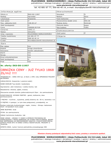 PŁUCIENNIK NIERUCHOMOŚCI | Aleja Politechniki 22/24 Łódź, lokal 201 pośrednictwo | obsługa transakcji | doradztwo | kredyty | opinie | analizy | administrowani _______________ www.pluciennik-nieruchomosci.pl _______________ tel. 42 681 67 77, 500 60 40 14, e-mail: [email protected] Informacje ogólne Nieruchomość Oferta nr EKS-DS-11957 Standard 2 Rodzaj sprzedaż Balkon duży Lokalizacja Ksawerów Ilość balkonów 2 Ilość pokoi 7 Powierzchnia działki [m2] 955.00 Pow. całkowita [m2] 190.00 m² Rodzaj domu bliźniak Ilość kondygnacji 3 Pokrycie dachu papa Cena 350000.00 PLN Rok budowy 1991 Cena/m2 1842.11 Status aktualna Imię i nazwisko PŁUCIENNIK NIERUCHOMOŚCI Telefon komórkowy 42 681 67 77 Telefon 500 60 40 14 E-mail [email protected] Pomieszczenia Ilość pokoi 7 Zdjęcia Opis Plac zabaw nie Dojazd droga utwardzona Otoczenie działki zabudowane Alarm nie Winda nie Drzwi antywłamaniowe nie Ilość kondygnacji 3 Prąd tak Nr. oferty: EKS-DS-11957 OBNIŻKA CENY - JUŻ TYLKO 1868 ZŁ/m2 !!!! TRANSAKCJA : CENA 355 tys. zł Dom z 1991 roku SPRZEDAŻ POŁOWY BLIŹNIAKA LOKALIZACJA: Ksawerów ( granice Łodzi) DANE OGÓLNE Typ działki: budowlana Ogrodzenie: płot metalowy i siatka brama. tak Nasadzenia: drzewa, iglaki, krzewy Otoczenie:osiedle domów jednorodzinnych Stan : do zamieszkania KONDYGNACJE: WYSOKI PARTER : garaż, kotłownie, dwa pomieszczenie I PIĘTRO : kuchnia , sypialnia, pokój dzienny ok. 30 m, łazienka z wc II PIĘTRO: 4 pokoje ( w tym dwa połączone), przedpokój, wc Rodzaj materiału budowlanego: cegła , ściany : Stropy: betonowe Dach :stropodach kryty papą INNE BUDYNKI: brak STAN: do zamieszkania Odbiór techniczny budynku: tak INNE UWAGI : UWAGA !!! DANE O OFERCIE POCHODZĄ OD OFERUJĄCEGO I MOGĄ ODBIEGAĆ OD STANU FAKTYCZNEGO. BIURO NIE ODPOWIADA ZA NIEZGODNOŚĆ DANYCH Z RZECZYWISTOŚCIĄ. OFERTA MOŻE BYĆ W DANEJ CHWILI NIEAKTUALNA. PROSIMY O TELEFON. OFERTA DNIA. numer licencji pośrednika prowadzącego 490 Klientom chcemy poświęcać odpowiednią ilość czasu, prosimy o umawianie spotkań. PŁUCIENNIK NIERUCHOMOŚCI | Aleja Politechniki 22/24 Łódź, lokal 201 pośrednictwo | obsługa transakcji | doradztwo | kredyty | opinie | analizy | administrowani _______________ www.pluciennik-nieruchomosci.pl _______________ tel. 42 681 67 77, 500 60 40 14, [email protected]