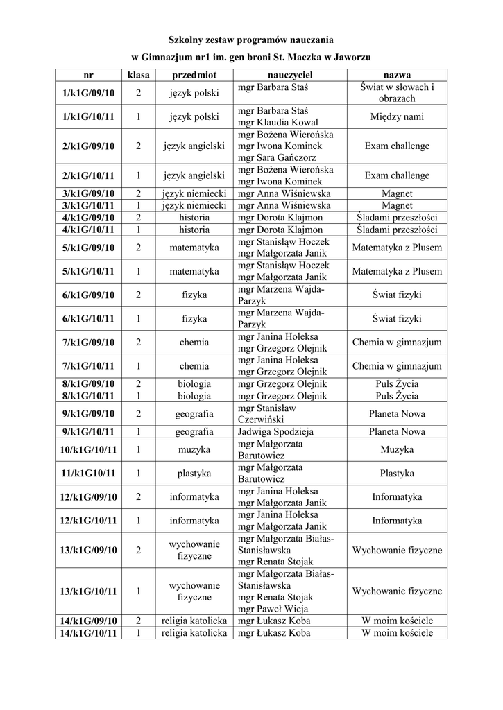 Szkolny zestaw programów nauczania w Gimnazjum nr1 im. gen