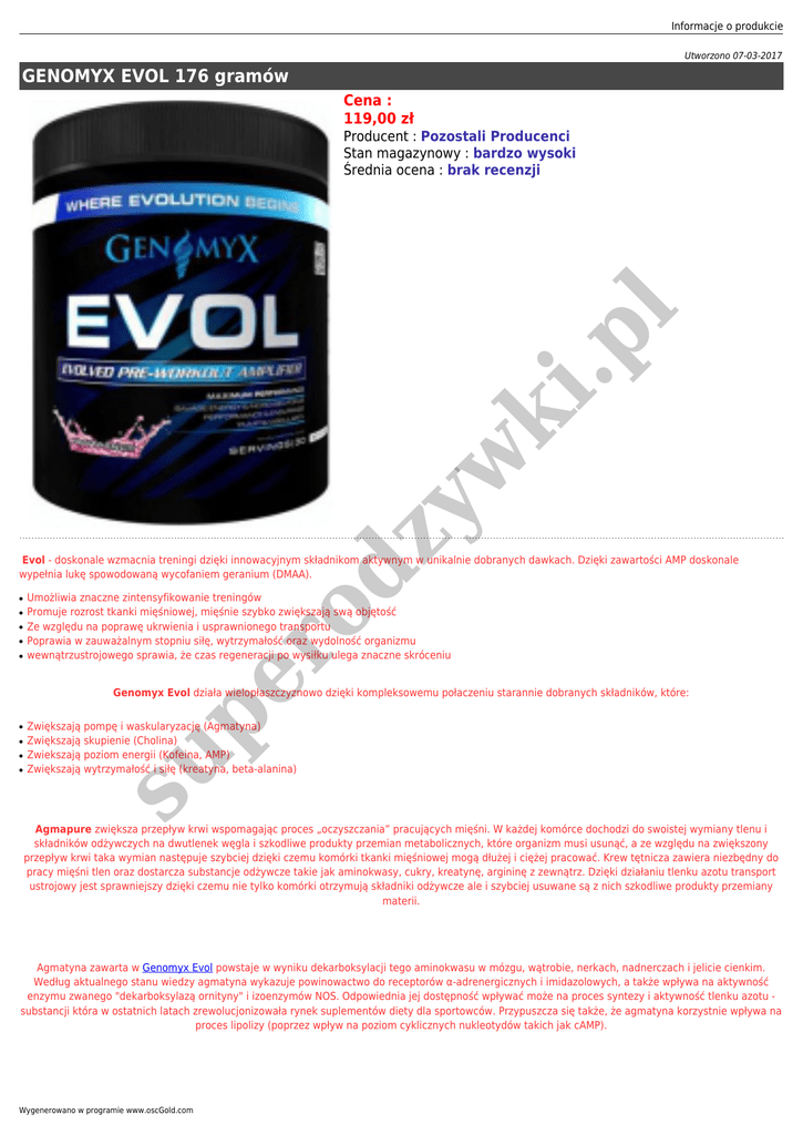 Informacje o produkcie Utworzono 07-03-2017 GENOMYX EVOL 176 gramów Cena : 119,00 zł ro dz y w ki .p l Producent : Pozostali Producenci Stan magazynowy : bardzo wysoki Średnia ocena : brak recenzji Evol - doskonale wzmacnia treningi dzięki innowacyjnym składnikom aktywnym w unikalnie dobranych dawkach. Dzięki zawartości AMP doskonale wypełnia lukę spowodowaną wycofaniem geranium (DMAA). ● ● ● ● Umożliwia znaczne zintensyfikowanie treningów Promuje rozrost tkanki mięśniowej, mięśnie szybko zwiększają swą objętość Ze względu na poprawę ukrwienia i usprawnionego transportu Poprawia w zauważalnym stopniu siłę, wytrzymałość oraz wydolność organizmu wewnątrzustrojowego sprawia, że czas regeneracji po wysiłku ulega znaczne skróceniu pe ● Genomyx Evol działa wielopłaszczyznowo dzięki kompleksowemu połaczeniu starannie dobranych składników, które: ● ● ● Zwiększają pompę i waskularyzację (Agmatyna) Zwiększają skupienie (Cholina) Zwiekszają poziom energii (Kofeina, AMP) Zwiększają wytrzymałość i siłę (kreatyna, beta-alanina) su ● Agmapure zwiększa przepływ krwi wspomagając proces „oczyszczania” pracujących mięśni. W każdej komórce dochodzi do swoistej wymiany tlenu i składników odżywczych na dwutlenek węgla i szkodliwe produkty przemian metabolicznych, które organizm musi usunąć, a ze względu na zwiększony przepływ krwi taka wymian następuje szybciej dzięki czemu komórki tkanki mięśniowej mogą dłużej i ciężej pracować. Krew tętnicza zawiera niezbędny do pracy mięśni tlen oraz dostarcza substancje odżywcze takie jak aminokwasy, cukry, kreatynę, argininę z zewnątrz. Dzięki działaniu tlenku azotu transport ustrojowy jest sprawniejszy dzięki czemu nie tylko komórki otrzymują składniki odżywcze ale i szybciej usuwane są z nich szkodliwe produkty przemiany materii. Agmatyna zawarta w Genomyx Evol powstaje w wyniku dekarboksylacji tego aminokwasu w mózgu, wątrobie, nerkach, nadnerczach i jelicie cienkim. Według aktualnego stanu wiedzy agmatyna wykazuje powinowactwo do receptorów α-adrenergicznych i imidazolowych, a także wpływa na aktywność enzymu zwanego "dekarboksylazą ornityny" i izoenzymów NOS. Odpowiednia jej dostępność wpływać może na proces syntezy i aktywność tlenku azotu substancji która w ostatnich latach zrewolucjonizowała rynek suplementów diety dla sportowców. Przypuszcza się także, że agmatyna korzystnie wpływa na proces lipolizy (poprzez wpływ na poziom cyklicznych nukleotydów takich jak cAMP). Wygenerowano w programie www.oscGold.com Ilość w porcji (4 400mg) EVOL Propietary Blend:3 290 mg Muscle Performance AMPenergy: Creapure CarnoSyn Agmapure Choline Bitartrate Caffeine anhydrous 4-Amino-2-Methylpentane Citrate (AMP) su pe ro dz y w ki .p l Składniki aktywne: