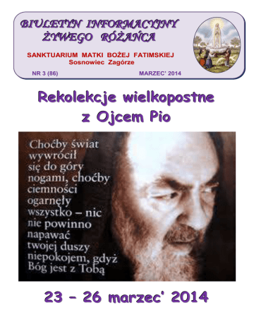 BIULETYN INFORMACYJNY ŻYWEGO RÓŻAŃCA SANKTUARIUM MATKI BOŻEJ FATIMSKIEJ Sosnowiec Zagórze NR 3 (86) MARZEC’ 2014 Rekolekcje wielkopostne z Ojcem Pio 23 – 26 marzec’ 2014 P PA AP PIIE ES SK KIIE E IIN NT TE EN NCCJ JE E A APPO OS ST TO OLLS ST TW WA A M MO OD DLLIIT TW WY Y OGÓLNA Aby we wszystkich kulturach szanowano prawa i godność kobiet. MISYJNA Aby liczni młodzi ludzie odpowiedzieli na zaproszenie Pana do poświęcenia życia głoszeniu Ewangelii. IIN NT TE EN NCCJ JA A KKR RU UCCJ JA AT TY Y R RÓ ÓŻ ŻA AŃ ŃCCO OW WE EJ J Z Maryją Królową Polski módlmy się o Polskę wierną Bogu, Krzyżowi i Ewangelii, o wypełnienie Jasnogórskich Ślubów Narodu. IIN NT TE EN NCCJ JE E PPA AR RA AFFIIA ALLN NE E Módlmy się: o potrzebne łaski i dary Ducha Świętego dla Ojca Świętego Franciszka w posłudze Kościołowi na następne lata pontyfikatu; o potrzebne łaski i dary Ducha Świętego, a w sposób szczególny o łaskę zdrowia dla Benedykta XVI; dziękczynnie za dar błogosławionego papieża Jana Pawła II i o dobre przygotowanie się do uroczystości Jego kanonizacji; za wszystkich, którzy ucierpieli z powodu walk w ostatnich dniach i w czasie całej wojny w Republice Środkowej Afryki, a w sposób szczególny za misjonarki i misjonarzy tam posługujących; za wszystkich, którzy zginęli i ucierpieli w czasie walk na Ukrainie oraz o pokojowe rozwiązanie konfliktu i demokrację w tym państwie; w intencji parafialnych rekolekcji wielkopostnych, aby Duch Święty otworzył nasze serca na głębokie i owocne przeżycie tego czasu łaski; o potrzebne łaski i dary Ducha Świętego dla ojców kapucynów głoszących rekolekcje wielkopostne oraz dla księży spowiedników; o Boże błogosławieństwo, opiekę Matki Bożej oraz Światło Ducha Świętego dla Biskupa Grzegorza na kolejne lata pasterskiej posługi w naszej diecezji; o Boże błogosławieństwo i potrzebne łaski dla Barbary i Piotra, a zwłaszcza o łaskę zrozumienia, że wspólne życie małżeńskie warto planować jedynie w oparciu o sakramentalny związek; o rozwiązanie spraw rodzinnych zgodnie z wolą Bożą dla Marzeny i Piotra oraz Ani i Dariusza; dziękczynnie za pomyślne rozwiązanie spraw rodzinnych dla Beaty i Wiktora i z prośbą o dalszą opiekę i Boże błogosławieństwo dla Rodziny; o Boże błogosławieństwo, opiekę Matki Bożej Fatimskiej w sposób szczególny o łaskę zdrowia dla Andrzeja i rodziny; o potrzebne łaski i światło Ducha Świętego dla Bogdana; o łaskę zdrowia i dobre przygotowanie się do operacji kolana dla Reni; o Boże błogosławieństwo, opiekę Matki Bożej Fatimskiej i wspomożenie w ciężkiej chorobie dla Marii Kieraś; o Boże błogosławieństwo, opiekę Matki Bożej Fatimskiej, w sposób szczególny o zdrowie i potrzebne łaski dla Haliny Kubańskiej; o pomyślny przebieg radioterapii i łaskę powrotu do zdrowia dla Ewy; o łaskę zdrowia i szczęśliwy przebieg operacji dla Adama; o wybudzenie ze śpiączki i łaskę zdrowia dla malutkiej Lilusi; o uwolnienie z nałogu tytoniowego dla Marii oraz dla Joanny; o łaskę zdrowia i wytrwania w cierpieniu dla Ireny, Wiesławy oraz dla Beaty; o powrót do zdrowia dla Janiny Tomalskiej; o pełny powrót do zdrowia dla Krystyny Ilukowicz; o pomyślny przebieg zabiegu dla Kacperka oraz o Boże błogosławieństwo, opiekę Matki Bożej i łaskę zdrowia po zabiegu; o cud uzdrowienia dla 14. letniego Ernesta – żeby mógł chodzić i mówić; o Boże błogosławieństwo i łaskę zdrowia dla malutkiej Laury i jej rodziców; o łaskę zdrowia i pomyślny przebieg operacji serca dla malutkiej Oli; o poprawę zdrowia po wszczepieniu endoprotezy dla Krystyny Stępnickiej; o pomyślny przebieg leczenia i łaskę powrotu do zdrowia dla Danuty; o zdrowie i pomyślny przebieg ciąży dla Katarzyny; dziękczynnie za łaskę szczęśliwego rozwiązania i z prośbą o Boże błogosławieństwo i opiekę Matki Bożej Fatimskiej dla Magdy i Rafała oraz ich synka Oliwierka; o łaskę uwolnienia z nałogu alkoholizmu i znalezienie pracy dla Zbyszka i Tomka oraz dla Sławomira; o nawrócenie Marcina i Piotra; o łaskę znalezienie pracy dla Doroty, Aleksandry, Eweliny i Mariusza oraz dla Krystyny; dziękczynnie za łaskę poczęcia i z prośbą o pomyślny przebieg ciąży dla Edyty; o łaskę upragnionego potomstwa dla Agaty i Jakuba oraz Agnieszki i Michała; o łaskę pocieszenia i ukojenia w bólu po utracie nowonarodzonego dzieciątka dla Eweliny i Gabriela oraz by Dobry Bóg przyjął dzieciątko do grona aniołków; o łaskę wiecznego zbawienia dla śp. Teodory Kopeć mamy Zofii Kwoka z Róży św. Faustyny; o łaskę wiecznego zbawienia w królestwie niebieskim dla Wiesławy oraz dla Ireny Błażejewskiej; o wysłuchanie wszystkich intencji osób, które prosiły nas o modlitwę. W tym numerze biuletynu przypomnijmy sobie kalendarium procesu beatyfikacyjnego i kanonizacyjnego Jana Pawła II ROK 2005 2 kwietnia – o godz. 21,37 w swym pokoju w Watykanie zmarł Jan Paweł II. W następnych dniach do Rzymu przybyły ponad trzy miliony osób z całego świata, aby go pożegnać. 8 kwietnia – uroczysty pogrzeb Ojca Świętego na placu św. Piotra. Przewodniczył mu dziekan Kolegium Kardynalskiego kard. Joseph Ratzinger. Na placu św. Piotra zgromadziło się ponad sto tysięcy osób. Wielu skandowało santo subito, czyli „święty natychmiast”. 9 maja (oficjalne ogłoszenie 13 maja) – Benedykt XVI zezwolił na odstąpienie od wymaganego przez przepisy kościelne okresu pięciu lat od śmierci danej osoby i na rozpoczęcie procesu beatyfikacyjnego Jana Pawła II od zaraz. 18 maja – ogłoszenie edyktu zachęcającego wszystkich wiernych, aby przekazywali Trybunałowi Diecezjalnemu Wikariatu Rzymu informacje, które mogą zawierać jakiekolwiek elementy przemawiające na korzyść bądź przeciwko opinii świętości Jana Pawła II. Dokument ten wisiał przez dwa miesiące na bramie Wikariatu Rzymu, a ta