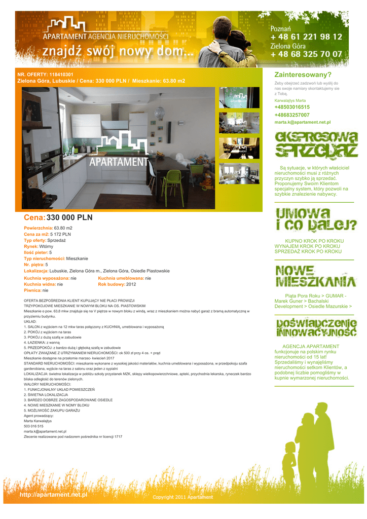Zainteresowany? NR. OFERTY: 118410301 Zielona Góra, Lubuskie / Cena: 330 000 PLN / Mieszkanie: 63.80 m2 Żeby obejrzeć zadzwoń lub wyślij do nas swoje namiary skontaktujemy sie z Tobą. Karwalajtys Marta +48503016515 +48683257007 [email protected] Są sytuacje, w których właściciel nieruchomości musi z różnych przyczyn szybko ją sprzedać. Proponujemy Swoim Klientom specjalny system, który pozwoli na szybkie znalezienie nabywcy. Cena: 330 000 PLN Powierzchnia: 63.80 m2 Cena za m2: 5 172 PLN Typ oferty: Sprzedaż Rynek: Wtórny Ilość pieter: 5 Typ nieruchomości: Mieszkanie Nr. piętra: 5 Lokalizacja: Lubuskie, Zielona Góra m., Zielona Góra, Osiedle Piastowskie Kuchnia wyposażona: nie Kuchnia widna: nie Piwnica: nie Kuchnia umeblowana: nie Rok budowy: 2012 OFERTA BEZPOŚREDNIA KLIENT KUPUJĄCY NIE PŁACI PROWIZJI TRZYPOKOJOWE MIESZKANIE W NOWYM BLOKU NA OS. PIASTOWSKIM Mieszkanie o pow. 63,8 mkw znajduje się na V piętrze w nowym bloku z windą, wraz z mieszkaniem można nabyć garaż z bramą automatyczną w przyziemiu budynku. UKŁAD: 1. SALON z wyjściem na 12 mkw taras połączony z KUCHNIĄ, umeblowana i wyposażoną 2. POKÓJ z wyjściem na taras 3. POKÓJ z dużą szafą w zabudowie 4. ŁAZIENKA: z wanną 5. PRZEDPOKÓJ: z bardzo dużą i głęboką szafą w zabudowie OPŁATY ZWIĄZANE Z UTRZYMANIEM NIERUCHOMOŚCI: ok 500 zł przy 4 os. + prąd Mieszkanie dostępne na przełomie marzec- kwiecień 2017 STANDARD NIERUCHOMOŚCI: mieszkanie wykonane z wysokiej jakości materiałów, kuchnia umeblowana i wyposażona, w przedpokoju szafa garderobiana, wyjście na taras z salonu oraz jeden z sypialni LOKALIZACJA: świetna lokalizacja w pobliżu szkoły przystanek MZK, sklepy wielkopowierzchniowe, apteki, przychodnia lekarska, ryneczek bardzo bliska odległość do terenów zielonych. WALORY NIERUCHOMOŚCI: 1. FUNKCJONALNY UKŁAD POMIESZCZEŃ 2. ŚWIETNA LOKALIZACJA 3. BARDZO DOBRZE ZAGOSPODAROWANE OSIEDLE 4. NOWE MIESZKANIE W NOMY BLOKU 5. MOŻLIWOŚĆ ZAKUPU GARAŻU Agent prowadzący: Marta Karwalajtys 503 016 515 [email protected] Zlecenie realizowane pod nadzorem pośrednika nr licencji 1717 http://apartament.net.pl KUPNO KROK PO KROKU WYNAJEM KROK PO KROKU SPRZEDAŻ KROK PO KROKU Piąta Pora Roku > GUMAR Marek Guner > Bachalski Development > Osiedle Mazurskie > AGENCJA APARTAMENT funkcjonuje na polskim rynku nieruchomości od 15 lat! Sprzedaliśmy i wynajęliśmy nieruchomości setkom Klientów, a podobnej liczbie pomogliśmy w kupnie wymarzonej nieruchomości.