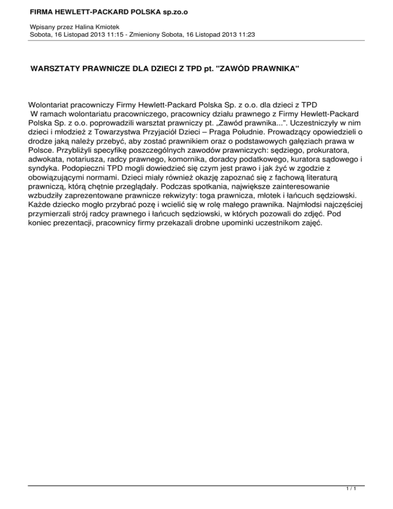 FIRMA HEWLETT-PACKARD POLSKA sp.zo.o Wpisany przez Halina Kmiotek Sobota, 16 Listopad 2013 11:15 - Zmieniony Sobota, 16 Listopad 2013 11:23 WARSZTATY PRAWNICZE DLA DZIECI Z TPD pt. "ZAWÓD PRAWNIKA" Wolontariat pracowniczy Firmy Hewlett-Packard Polska Sp. z o.o. dla dzieci z TPD W ramach wolontariatu pracowniczego, pracownicy działu prawnego z Firmy Hewlett-Packard Polska Sp. z o.o. poprowadzili warsztat prawniczy pt. „Zawód prawnika...”. Uczestniczyły w nim dzieci i młodzież z Towarzystwa Przyjaciół Dzieci – Praga Południe. Prowadzący opowiedzieli o drodze jaką należy przebyć, aby zostać prawnikiem oraz o podstawowych gałęziach prawa w Polsce. Przybliżyli specyfikę poszczególnych zawodów prawniczych: sędziego, prokuratora, adwokata, notariusza, radcy prawnego, komornika, doradcy podatkowego, kuratora sądowego i syndyka. Podopieczni TPD mogli dowiedzieć się czym jest prawo i jak żyć w zgodzie z obowiązującymi normami. Dzieci miały również okazję zapoznać się z fachową literaturą prawniczą, którą chętnie przeglądały. Podczas spotkania, największe zainteresowanie wzbudziły zaprezentowane prawnicze rekwizyty: toga prawnicza, młotek i łańcuch sędziowski. Każde dziecko mogło przybrać pozę i wcielić się w rolę małego prawnika. Najmłodsi najczęściej przymierzali strój radcy prawnego i łańcuch sędziowski, w których pozowali do zdjęć. Pod koniec prezentacji, pracownicy firmy przekazali drobne upominki uczestnikom zajęć. 1/1