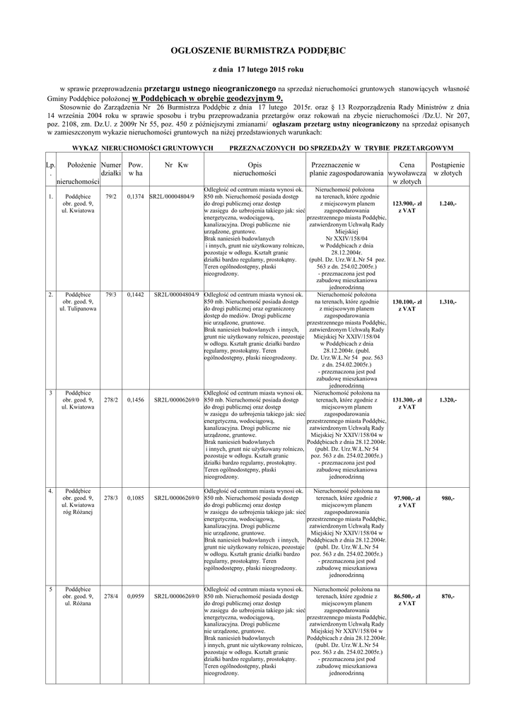 OGŁOSZENIE BURMISTRZA PODDĘBIC z dnia 17 lutego 2015 roku w sprawie przeprowadzenia przetargu ustnego nieograniczonego na sprzedaż nieruchomości gruntowych stanowiących własność Gminy Poddębice położonej w Poddębicach w obrębie geodezyjnym 9. Stosownie do Zarządzenia Nr 26 Burmistrza Poddębic z dnia 17 lutego 2015r. oraz § 13 Rozporządzenia Rady Ministrów z dnia 14 września 2004 roku w sprawie sposobu i trybu przeprowadzania przetargów oraz rokowań na zbycie nieruchomości /Dz.U. Nr 207, poz. 2108, zm. Dz.U. z 2009r Nr 55, poz. 450 z późniejszymi zmianami/ ogłaszam przetarg ustny nieograniczony na sprzedaż opisanych w zamieszczonym wykazie nieruchomości gruntowych na niżej przedstawionych warunkach: WYKAZ NIERUCHOMOŚCI GRUNTOWYCH Lp. . 1. 2. 3 4. 5 Położenie Numer Pow. działki w ha nieruchomości Poddębice obr. geod. 9, ul. Kwiatowa 79/2 Poddębice obr. geod. 9, ul. Tulipanowa 79/3 Poddębice obr. geod. 9, ul. Kwiatowa Poddębice obr. geod. 9, ul. Kwiatowa róg Różanej Poddębice obr. geod. 9, ul. Różana Nr Kw PRZEZNACZONYCH DO SPRZEDAŻY W TRYBIE PRZETARGOWYM Opis nieruchomości Przeznaczenie w Cena Postąpienie planie zagospodarowania wywoławcza w złotych w złotych Odległość od centrum miasta wynosi ok. Nieruchomość położona 850 mb. Nieruchomość posiada dostęp na terenach, które zgodnie do drogi publicznej oraz dostęp z miejscowym planem 123.900,- zł w zasięgu do uzbrojenia takiego jak: sieć zagospodarowania z VAT energetyczna, wodociągową, przestrzennego miasta Poddębic, kanalizacyjna. Drogi publiczne nie zatwierdzonym Uchwałą Rady urządzone, gruntowe. Miejskiej Brak naniesień budowlanych Nr XXIV/158/04 i innych, grunt nie użytkowany rolniczo, w Poddębicach z dnia pozostaje w odłogu. Kształt granic 28.12.2004r. działki bardzo regularny, prostokątny. (publ. Dz. Urz.W.Ł.Nr 54 poz. Teren ogólnodostępny, płaski 563 z dn. 254.02.2005r.) nieogrodzony. - przeznaczona jest pod zabudowę mieszkaniowa jednorodzinną SR2L/00004804/9 Odległość od centrum miasta wynosi ok. Nieruchomość położona 850 mb. Nieruchomość posiada dostęp na terenach, które zgodnie 130.100,- zł do drogi publicznej oraz ograniczony z miejscowym planem z VAT dostęp do mediów. Drogi publiczne zagospodarowania nie urządzone, gruntowe. przestrzennego miasta Poddębic, Brak naniesień budowlanych i innych, zatwierdzonym Uchwałą Rady grunt nie użytkowany rolniczo, pozostaje Miejskiej Nr XXIV/158/04 w odłogu. Kształt granic działki bardzo w Poddębicach z dnia regularny, prostokątny. Teren 28.12.2004r. (publ. ogólnodostępny, płaski nieogrodzony. Dz. Urz.W.Ł.Nr 54 poz. 563 z dn. 254.02.2005r.) - przeznaczona jest pod zabudowę mieszkaniowa jednorodzinną Odległość od centrum miasta wynosi ok. Nieruchomość położona na SR2L/00006269/0 850 mb. Nieruchomość posiada dostęp terenach, które zgodnie z 131.300,- zł do drogi publicznej oraz dostęp miejscowym planem z VAT w zasięgu do uzbrojenia takiego jak: sieć zagospodarowania energetyczna, wodociągową, przestrzennego miasta Poddębic, kanalizacyjna. Drogi publiczne nie zatwierdzonym Uchwałą Rady urządzone, gruntowe. Miejskiej Nr XXIV/158/04 w Brak naniesień budowlanych Poddębicach z dnia 28.12.2004r. i innych, grunt nie użytkowany rolniczo, (publ. Dz. Urz.W.Ł.Nr 54 pozostaje w odłogu. Kształt granic poz. 563 z dn. 254.02.2005r.) działki bardzo regularny, prostokątny. - przeznaczona jest pod Teren ogólnodostępny, płaski zabudowę mieszkaniowa nieogrodzony. jednorodzinną 0,1374 SR2L/00004804/9 0,1442 278/2 0,1456 278/3 0,1085 278/4 0,0959 Odległość od centrum miasta wynosi ok. Nieruchomość położona na SR2L/00006269/0 850 mb. Nieruchomość posiada dostęp terenach, które zgodnie z do drogi publicznej oraz dostęp miejscowym planem w zasięgu do uzbrojenia takiego jak: sieć zagospodarowania energetyczna, wodociągową, przestrzennego miasta Poddębic, kanalizacyjna. Drogi publiczne zatwierdzonym Uchwałą Rady nie urządzone, gruntowe. Miejskiej Nr XXIV/158/04 w Brak naniesień budowlanych i innych, Poddębicach z dnia 28.12.2004r. grunt nie użytkowany rolniczo, pozostaje (publ. Dz. Urz.W.Ł.Nr 54 w odłogu. Kształt granic działki bardzo poz. 563 z dn. 254.02.2005r.) regularny, prostokątny. Teren - przeznaczona jest pod ogólnodostępny, płaski nieogrodzony. zabudowę mieszkaniowa jednorodzinną Odległość od centrum miasta wynosi ok. Nieruchomość położona na SR2L/00006269/0 850 mb. Nieruchomość posiada dostęp terenach, które zgodnie z do drogi publicznej oraz dostęp miejscowym planem w zasięgu do uzbrojenia takiego jak: sieć zagospodarowania energetyczna, wodociągową, przestrzennego miasta Poddębic, kanalizacyjna. Drogi publiczne zatwierdzonym Uchwałą Rady nie urządzone, gruntowe. Miejskiej Nr XXIV/158/04 w Brak naniesień budowlanych Poddębicach z dnia 28.12.2004r. i innych, grunt nie użytkowany rolniczo, (publ. Dz. Urz.W.Ł.Nr 54 pozostaje w odłogu. Kształt granic poz. 563 z dn. 254.02.2005r.) działki bardzo regularny, prostokątny. - przeznaczona jest pod Teren ogólnodostępny, płaski zabudowę mieszkaniowa nieogrodzony. jednorodzinną 1.240,- 1.310,- 1.320,- 97.900,- zł z VAT 980,- 86.500,- zł z VAT 870,- 6 7 8 9 Poddębice obr. geod. 9, ul. Różana 278/5 0,0938 Poddębice obr. geod. 9, ul. Tulipanowa 278/6 0,1468 Poddębice obr. geod. 9, ul. Różana 278/7 0,0917 278/8 0,1029 Poddębice obr. geod. 9, ul. Różana, róg Tulipanowej Odległość od centrum miasta wynosi ok. Nieruchomość położona na SR2L/00006269/0 850 mb. Nieruchomość posiada dostęp terenach, które zgodnie z do drogi publicznej oraz dostęp miejscowym planem w zasięgu do uzbrojenia takiego jak: sieć zagospodarowania energetyczna, wodociągową, przestrzennego miasta Poddębic, kanalizacyjna. Drogi publiczne zatwierdzonym Uchwałą Rady nie urządzone, gruntowe. Miejskiej Nr XXIV/158/04 w Brak naniesień budowlanych Poddębicach z dnia 28.12.2