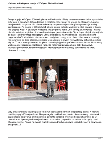 Całkiem subiektywna relacja z XC-Open Piedrahita 2008 Wpisany przez Tomo i Greg Druga edycja XC-Open 2008 odbyła się w Piedrahicie. Bilety zarezerwowałem już w styczniu bo były tanie a poza tym doświadczenia z zeszłego roku kazały mi wrócić do Hiszpanii. Latanie tam jest dość taktyczne. Po pierwsze lata się po północnej stronie gór co powoduje trochę zamieszania. Po drugie w którąkolwiek stronę sie nie poleci z wiatrem to i tak zawsze w końcu leci się pod wiatr. A poza tym Hiszpania jest po prostu fajna. Jest trochę jak w Polsce - na wsi nikt nie mówi po angielsku, trudno złapać stopa, generalnie mają Cię w dupie ale jak się wejdzie do baru - a barów mają najwięcej w EU w przeliczeniu na mieszkańca - to zawsze można pogadać choć i tak nikt nic nie zrozumie. I mają tam przepyszne oliwki. Hiszpanie z prowincji nie rozumieją do tego stopnia, że stojąc vis a vis rury z piwem nie wystarczy pokazać, że chce się 'to'. Trzeba wyartykułować, że 'piwo' i to najlepiej po hiszpańsku 'cerveza' bo na 'birra' robią wielkie oczy i bezradnie rozkładają ręce. Są natomiast zawsze chętni żeby tłumaczyć. Tłumaczą cokolwiek, byleby coś gadać. Prawdopodobnie możnaby dowiedzieć się wielu ciekawych rzeczy. Gdy przyjechaliśmy to pani przez 40 minut opowiadała nam n/t eksploatacji domu, w którym mieliśmy spędzić kolejne 9 dni. Nie pomagały znaki rękami, że nic nie rozumiemy. Meldunek i papierologia zajęły dwa dni bo pani nie potrafiła odróżnić imienia od nazwiska mimo, że w dowodzie stoi po angielsku co jest imię a co nazwisko, a polskie nazwiska kończą się dość charakterycznie. No ale na kwicie musi być dokładnie bo co powie urzędnik, który z pewnością zna polski...? 1/7 Całkiem subiektywna relacja z XC-Open Piedrahita 2008 Wpisany przez Tomo i Greg To wszystko to jednak miły folklor, podobne 'nieporozumienia' zawsze kończą się śmiechem i są częścią przygody. Nikt do nikogo nie ma pretensji, na wszystko jest czas, z reguły jutro, i ogólnie jest miło. Latania w tym roku nie mieliśmy dużo ale i tak więcej niż na rozpoczętych zaraz po XC-Open zawodach niemieckich. Na 8 dni mieliśmy 4 dni lotne, z których 2 były naprawdę fajne, z tych dwóch 1 był mega, a pozostałe 2 raczej ciężkie. Niektórzy latali w dniu kiedy latać naszym zdaniem się nie powinno a Maurer tego właśnie dnia poleciał 170km. Warunki były takie, że 10 min od otwarcia okna, gdy pierwsze glajty wzbiły się w powietrze i w tym samym momencie zostały poskładane, organizator anulował konkurencję. Polecieli Ci co chcieli. Polaków wśród nich nie było. Wracając do tych dobrych dni - szło nam, znaczy polskiej grupie całkiem przyzwoicie. Po pierwszym dniu gdy polecieliśmy do Avili, spowrotem połowę drogi do Piedrahity i jeszcze raz do Avili większość Polaków była na pierwszej stronie wyników tj. w pierwszej dwudziestce. Ten dzień był w pewnym sensie dniem treningowym z podstawami na 2700m npm. Leciało się bardzo logicznie choć nie szybko. W okolicach Avili wciągnęła mnie chmura i poraz pierwszy w chmurze zwariował mi GPS. Dramaturgii dodawał fakt, że tuż przed zassaniem latałem w jednym kominie z niebieskim UP Edge'em, który prawdopodobnie też został wciągnięty i musiał być gdzieś obok mnie. Nie pomagały spirale, tzn. pomagały trochę bo zamiast 12m/s miałem 2m/s do góry. Więcej boję się kręcić bo nie jestem akrobatą. Do tego poniżej, w tym samym kominie kręciło jeszcze 5 czy 6 glajtów i nie bardzo uśmiechało mi się wypadać w jakiś 2/7 Całkiem subiektywna relacja z XC-Open Piedrahita 2008 Wpisany przez Tomo i Greg karkołomnych konfiguracjach prosto w lecących pode mną gości. Miałem nawet przez chwilę taki plan żeby dać się pożreć bo chmury tego dnia nie były bardzo grube. Ale jakoś ten plan mi nie wypalił. Koniec końców udało się bez strat. Kolejny dzień został określony przez szefa górki - Stefka Szynkę (Steve Ham) jako klasyczny dzień w Piedrahicie. Słaby wiatr SW. Po starcie poleciałem do przełęczy Villatoro jakieś 15km na ENE od statu - normalna trasa. Za przełęczą się zaczęło. Dwie chmury w odległości jakiś 3km ode mnie, pod którymi krażyły glajty. Obie dobre, można wybrać co komu pasuje bardziej. Póżniej było jeszcze lepiej. Podstawy 3700m, wiaterek w plecy tak, że leciało się ok 60kmh na 1/2 - 2/3 spida. Mój Poison2 jest do tego stworzony. Tylko Greg meldował, że padł na przełęczy. W taki warun! Zaraz potem odezwał sie Kacper z 50km - był bardzo szybki i poleciał za daleko od chmur. Gleba. Cóż, zwykły pech. 70-ty kilometr - okolice Avili. Podstawy nie mniej niż 3500m, do wyboru dwa szlaki, może nawet trzy, mocne, szerokie noszenia 5-6m/s. 20km za Avilą zaczyna się strefa podejścia lotniska w Madrycie. Max. dozwolony pułap 3000m albo dyskwalifikacja od momentu przekroczenia tej wysokości. No i zaczął się festiwal spiral i klap - warun aż piszczał - pełna bela 4m/s do góry po prostej i... sztuczny sufit. I lecieliśmy tak do samego końca klnąc to ograniczenie na czym świat stoi. Prawdę mówiąc jeszcze podczas odprawy nie przejmowaliśmy sie nim zbytnio bo za Avilę nie dolatuje się codziennie. To był dzień na 200km z haczykiem ale ten cholerny sufit 3/7 Całkiem subiektywna relacja z XC-Open Piedrahita 2008 Wpisany przez Tomo i Greg wszystkich nas ograniczył. Umiejętności z resztą też. Od setnego kilometra lecieliśmy w ustalonej grupie 6 glajtów, z Klaudyną i Bartkiem i jeszcze trzema Niemcami. Dzień miał się ku końcowi, dochodziła 18:30. W radiu co jakiś czas odzywał się Janusz podając swoją pozycję. Był 8-9km przed nami. Spadliśmy dość nisko, na jakieś 1450m, ok. 300m nad ziemią. Ale bez stresu bo o tej porze ziemia jest tak wygrzana, że nie ma mowy o szybkim lądowaniu. No i zgłosił sie Janusz, że właśnie wylądował bo task time się skończył. Owszem sko