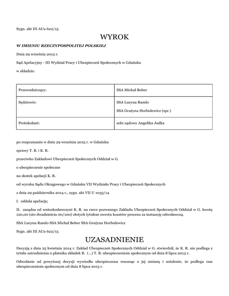 Sygn. akt III AUa 622/15 WYROK W IMIENIU RZECZYPOSPOLITEJ POLSKIEJ Dnia 29 września 2015 r. Sąd Apelacyjny - III Wydział Pracy i Ubezpieczeń Społecznych w Gdańsku w składzie: Przewodniczący: SSA Michał Bober Sędziowie: SSA Lucyna Ramlo SSA Grażyna Horbulewicz (spr.) Protokolant: sekr.sądowy Angelika Judka po rozpoznaniu w dniu 29 września 2015 r. w Gdańsku sprawy T. B. i K. R. przeciwko Zakładowi Ubezpieczeń Społecznych Oddział w G. o ubezpieczenie społeczne na skutek apelacji K. R. od wyroku Sądu Okręgowego w Gdańsku VII Wydziału Pracy i Ubezpieczeń Społecznych z dnia 29 października 2014 r., sygn. akt VII U 1035/14 I. oddala apelację; II. zasądza od wnioskodawczyni K. R. na rzecz pozwanego Zakładu Ubezpieczeń Społecznych Oddział w G. kwotę 120,00 (sto dwadzieścia 00/100) złotych tytułem zwrotu kosztów procesu za instancję odwoławczą. SSA Lucyna Ramlo SSA Michał Bober SSA Grażyna Horbulewicz Sygn. akt III AUa 622/15 UZASADNIENIE Decyzją z dnia 25 kwietnia 2014 r. Zakład Ubezpieczeń Społecznych Oddział w G. stwierdził, że K. R. nie podlega z tytułu zatrudnienia u płatnika składek B. (...) T. B. ubezpieczeniom społecznym od dnia 8 lipca 2013 r. Odwołanie od powyższej decyzji wywiodła ubezpieczona wnosząc o jej zmianę i ustalenie, że podlega ona ubezpieczeniom społecznym od dnia 8 lipca 2013 r. Odwołanie od powyższej decyzji wniósł również płatnik składek T. B., wnosząc o jej zmianę i ustalenie, że ubezpieczona podlega ubezpieczeniom społecznym tj. emerytalnemu, rentowym, chorobowemu i wypadkowemu od dnia 8 lipca 2013 r. W odpowiedzi na odwołania pozwany wniósł o ich oddalenie oraz zasądzenie na rzecz pozwanego kosztów zastępstwa procesowego według norm przepisanych. Zarządzeniem z dnia 24 czerwca 2014 r., Sąd na mocy art. 219 k.p.c. połączył sprawy z odwołań obydwu skarżących do wspólnego rozpoznania i dalszego prowadzenia pod sygn. akt VII U 1035/14. Wyrokiem z dnia 29 października 2014 r. Sąd Okręgowy w Gdańsku VII Wydział Pracy i Ubezpieczeń Społecznych w punkcie 1 oddalił odwołania i w punkcie 2 zasądził od T. B. i K. R. na rzecz pozwanego kwoty po 60 zł tytułem zwrotu kosztów zastępstwa procesowego. Uzasadniając swoje stanowisko Sąd wskazał, że T. B. od 17 sierpnia 2009 r. prowadzi działalność gospodarczą w zakresie transportu drogowego towarów pod firmą (...) w S.. K. R., urodzona (...), została zatrudniona u płatnika składek B. (...) T. B. w S. na podstawie umowy o pracę z dnia 5 lipca 2013 r. w pełnym wymiarze czasu pracy na stanowisku spedytora, kadrowej z wynagrodzeniem zasadniczym w kwocie 6.800 zł brutto miesięcznie. Zgłoszenie wnioskodawczyni do ubezpieczeń społecznych nastąpiło z dniem 8 lipca 2013 r. z kodem 0110 00 (pracownik). Za lipiec 2013 r. płatnik składek wykazał dla ubezpieczonej podstawę wymiaru składek na ubezpieczenia społeczne w kwocie 5.321,74 zł, zaś za sierpień i wrzesień 2013 r. w kwocie 6.800 zł. Do zakresu obowiązków służbowych ubezpieczonej, jako pracownika płatnika należało przyjmowanie oraz zdobywanie zleceń spedycji na terenie Europy (dokonanie wyboru odpowiedniego w danej sytuacji i dla danego towaru środka transportu), pozyskiwanie klienta, zawieranie umów o przewóz, zapewnienie właściwego ubezpieczenia przewożonych ładunków, stworzenie niezbędnej dokumentacji transportowej, przesłanie wszystkich niezbędnych dokumentów umożliwiających realizację zlecenia w odpowiedni sposób i bez żadnych przeszkód, stały kontakt i nadzór kierowców, sporządzanie i wystawianie faktur sprzedaży, kompletowanie dokumentacji związanej z danym ładunkiem oraz przekazanie odpowiednich dokumentów klientowi, nadzór nad płatnościami związanymi z wykonaną usługą transportową. W imieniu płatnika ubezpieczona wystawiła szereg zleceń o numerach od (...) do (...) na usługi transportowe oraz faktury VAT (...) - nie podpisywała wskazanych dokumentów. Ubezpieczona zajmowała się również wysyłaniem w imieniu płatnika korespondencji w Urzędzie Pocztowym w S.. W siedzibie płatnika wnioskodawczyni zajmowała miejsce przy biurku – w tym samym pomieszczeniu, w jakim przebywał płatnik T. B. i D. B. (1) (brat płatnika, prowadzący tego samego rodzaju działalność). Ubezpieczona wykonywała prace przy komputerze, zajmowała się również wykonywaniem telefonów służbowych – kontaktując się z pracownikami płatnika oraz klientami. Rozmowy dotyczyły załadunku i rozładunku, spedycji – prowadzone były w języku polskim, niemieckim i angielskim. Przyjmowała zlecenia przewozowe, wystawiała związane z ich realizacją dokumenty spedycyjne, nadzorowała pracę kierowców i kontaktowała się z nimi w imieniu płatnika. Wyszukiwała również zlecenia przewozowe, zapewniając towar do przewozu do zapełnienia naczep pojazdów z taboru płatnika. Nadto zajmowała się znajdowaniem transportów dla zleceń, przyjętych przez płatnika, jako zleceniodawcę na zasadzie podzlecania tańszym przewoźnikom. Obsługa przez ubezpieczoną przewozów i usług spedycyjnych płatnika odbywała się zarówno w biurze, jak i poza nim. Ubezpieczona pozostawała do dyspozycji płatnika, kierowców i klientów pod telefonem również w godzinach wieczornych. Część prac typowo biurowych i związanych z rozliczeniami skarżąca wykonywała w biurze płatnika, po pracy w szkole w godzinach popołudniowych, część zaś – przy pomocy laptopa firmowego – w godzinach wieczornych w domu. W ciągu dnia zajmowała się także dostarczaniem nadawanej przez płatnika korespondencji do placówki pocztowej. W tożsamym z zatrudnieniem ubezpieczonej okresie płatnik składek zatrudnił dodatkowego kierowcę – M. K.. Nie przedłożono akt osobowych ubezpieczonego, jako pracownika płatnika. Ubezpieczona nie była u płatnika zobowiązana do podpisywania list obecności. Płatnik – po przejściu przez ubezpieczoną 