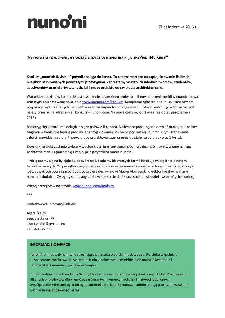 27 października 2016 r. TO OSTATNI DZWONEK, BY WZIĄĆ UDZIAŁ W KONKURSIE „NUNO’NI: INVISIBLE” Konkurs „nuno’ni: INvisible” powoli dobiega do końca. To ostatni moment na zaprojektowanie linii mebli miejskich inspirowanych powstałymi prototypami. Zapraszamy wszystkich młodych twórców, studentów, absolwentów uczelni artystycznych, jak i grupy projektowe czy studia architektoniczne. Warunkiem udziału w konkursie jest stworzenie autorskiego projektu linii nowoczesnych mebli w oparciu o dwa prototypy prezentowane na stronie www.nunoni.com/konkurs. Kompletne zgłoszenie to takie, które zawiera propozycje wykorzystanych materiałów oraz rozwiązań technologicznych. Gotowe koncepcje w formacie .pdf należy przesłać na adres e-mail [email protected]. Na prace czekamy od 1 września do 31 października 2016 r. Rozstrzygnięcie konkursu odbędzie się w połowie listopada. Nadesłane prace będzie oceniać profesjonalne jury. Nagrodą w konkursie będzie produkcja zaprojektowanej linii mebli pod nazwą „nuno’ni city” i sygnowanie całości nazwiskiem autora / nazwą grupy projektowej, zaproszenie do stałej współpracy oraz 1 tys. zł. Zwycięski projekt zostanie wybrany według kryterium funkcjonalności i oryginalności, by stworzone na jego podstawie meble zgadzały się z misją, jaka przyświeca marce nuno’ni. – Nie godzimy się na bylejakość, odtwórczość. Szukamy klasycznych form i inspirujemy się ich prostotą w tworzeniu nowych. Od początku swojej działalności chcemy promować i wspierać młodych twórców, którzy z rzeczy zwykłych potrafią zrobić coś, co zapiera dech – mówi Maciej Albinowski, dyrektor kreatywny marki nuno’ni. I dodaje: – Życzymy sobie, aby udział w konkursie dodał uczestnikom skrzydeł i wspomógł ich karierę. Więcej szczegółów na stronie www.nunoni.com/konkurs. *** Dodatkowych informacji udzieli: Agata Źrałko specjalistka ds. PR [email protected] +48 663 107 777 INFORMACJE O MARCE nuno’ni to młoda, dynamiczne rozwijająca się marka o polskim rodowodzie. Portfolio wypełniają niespotykane, modułowe rozwiązania, funkcjonalne meble miejskie, niebanalne oświetlenie i designerskie elementy wyposażenia wnętrz. nuno’ni należy do rodziny Terra Group, która działa na polskim rynku już od ponad 15 lat. Zrealizowała kilka tysięcy projektów dla klientów, zarówno tych komercyjnych, jak i instytucji publicznych. Współpracuje z firmami ogrodniczymi, architektami, branżą HoReCa i administracją publiczną. W swoim wachlarzu ma aż dziewięć marek.