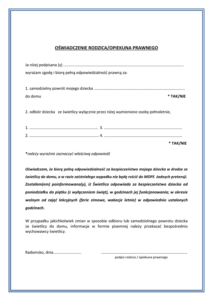 OŚWIADCZENIE RODZICA/OPIEKUNA PRAWNEGO Ja niżej podpisana (y) ............................................................................................................... wyrażam zgodę i biorę pełną odpowiedzialność prawną za: 1. samodzielny powrót mojego dziecka .................................................................................... * TAK/NIE do domu 2. odbiór dziecka ze świetlicy wyłącznie przez niżej wymienione osoby pełnoletnie, 1. ............................................................... 3. ........................................................................ 2. ................................................................ 4. ........................................................................ * TAK/NIE *należy wyraźnie zaznaczyć właściwą odpowiedź Oświadczam, że biorę pełną odpowiedzialność za bezpieczeństwo mojego dziecka w drodze ze świetlicy do domu, a w razie zaistniałego wypadku nie będę rościć do MOPS żadnych pretensji. Zostałam(em) poinformowana(y), iż Świetlica odpowiada za bezpieczeństwo dziecka od poniedziałku do piątku (z wyłączeniem świąt), w godzinach jej funkcjonowania; w okresie wolnym od zajęć lekcyjnych (ferie zimowe, wakacje letnie) w odpowiednio ustalonych godzinach. W przypadku jakichkolwiek zmian w sposobie odbioru lub samodzielnego powrotu dziecka ze świetlicy do domu, informacje w formie pisemnej należy przekazać bezpośrednio wychowawcy świetlicy. Radomsko, dnia.......................... …………………………………………………………………………… podpis rodzica / opiekuna prawnego