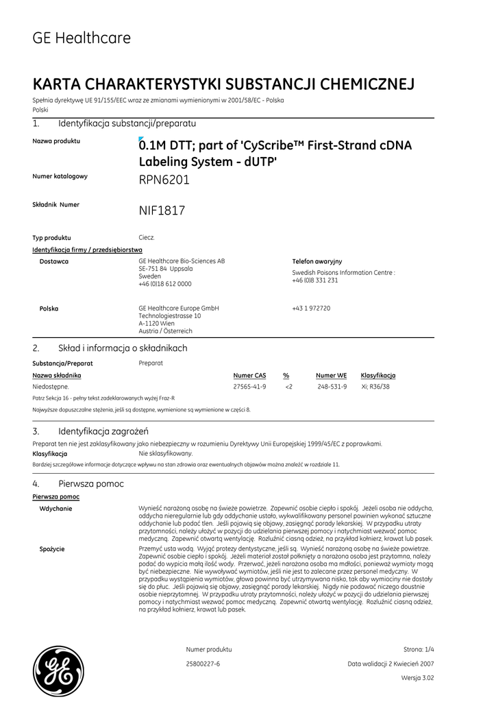 GE Healthcare KARTA CHARAKTERYSTYKI SUBSTANCJI CHEMICZNEJ Spełnia dyrektywę UE 91/155/EEC wraz ze zmianami wymienionymi w 2001/58/EC - Polska Polski 1. Identyfikacja substancji/preparatu Nazwa produktu Numer katalogowy 0.1M DTT; part of 'CyScribe™ First-Strand cDNA Labeling System - dUTP' RPN6201 Składnik Numer NIF1817 Typ produktu Ciecz. Identyfikacja firmy / przedsiębiorstwa Dostawca Telefon awaryjny Swedish Poisons Information Centre : +46 (0)8 331 231 GE Healthcare Europe GmbH Technologiestrasse 10 A-1120 Wien Austria / Österreich Polska 2. GE Healthcare Bio-Sciences AB SE-751 84 Uppsala Sweden +46 (0)18 612 0000 +43 1 972720 Skład i informacja o składnikach Substancja/Preparat Preparat Nazwa składnika Numer CAS Niedostępne. 27565-41-9 % <2 Numer WE Klasyfikacja 248-531-9 Xi; R36/38 Patrz Sekcja 16 - pełny tekst zadeklarowanych wyżej Fraz-R Najwyższe dopuszczalne stężenia, jeśli są dostępne, wymienione są wymienione w części 8. 3. Identyfikacja zagrożeń Preparat ten nie jest zaklasyfikowany jako niebezpieczny w rozumieniu Dyrektywy Unii Europejskiej 1999/45/EC z poprawkami. Nie sklasyfikowany. Klasyfikacja Bardziej szczegółowe informacje dotyczące wpływu na stan zdrowia oraz ewentualnych objawów można znaleźć w rozdziale 11. 4. Pierwsza pomoc Pierwsza pomoc Wdychanie Wynieść narażoną osobę na świeże powietrze. Zapewnić osobie ciepło i spokój. Jeżeli osoba nie oddycha, oddycha nieregularnie lub gdy oddychanie ustało, wykwalifikowany personel powinien wykonać sztuczne oddychanie lub podać tlen. Jeśli pojawią się objawy, zasięgnąć porady lekarskiej. W przypadku utraty przytomności, należy ułożyć w pozycji do udzielania pierwszej pomocy i natychmiast wezwać pomoc medyczną. Zapewnić otwartą wentylację. Rozluźnić ciasną odzież, na przykład kołnierz, krawat lub pasek. Spożycie Przemyć usta wodą. Wyjąć protezy dentystyczne, jeśli są. Wynieść narażoną osobę na świeże powietrze. Zapewnić osobie ciepło i spokój. Jeżeli materiał został połknięty a narażona osoba jest przytomna, należy podać do wypicia małą ilość wody. Przerwać, jeżeli narażona osoba ma mdłości, ponieważ wymioty mogą być niebezpieczne. Nie wywoływać wymiotów, jeśli nie jest to zalecane przez personel medyczny. W przypadku wystąpienia wymiotów, głowa powinna być utrzymywana nisko, tak aby wymiociny nie dostały się do płuc. Jeśli pojawią się objawy, zasięgnąć porady lekarskiej. Nigdy nie podawać niczego doustnie osobie nieprzytomnej. W przypadku utraty przytomności, należy ułożyć w pozycji do udzielania pierwszej pomocy i natychmiast wezwać pomoc medyczną. Zapewnić otwartą wentylację. Rozluźnić ciasną odzież, na przykład kołnierz, krawat lub pasek. Numer produktu 25800227-6 Strona: 1/4 Data walidacji 2 Kwiecień 2007 Wersja 3.02 0.1M DTT; part of 'CyScribe™ First-Strand cDNA Labeling System - dUTP' RPN6201 Kontakt ze skórą Spłukać skażoną skórę dużą ilością wody. Zdjąć skażoną odzież i buty. Jeśli pojawią się objawy, zasięgnąć porady lekarskiej. Uprać odzież przed ponownym użyciem. Wyczyścić dokładnie buty przed ponownym założeniem. Kontakt z okiem Natychmiast przepłukać oczy dużą ilością wody, od czasu do czasu podnosząc górna i dolna powiekę. Usunąć szkła kontaktowe jeżeli są. Należy kontynuować płukanie przez co najmniej 10 minut. Zasięgnąć porady lekarskiej, jeśli pojawi się podrażnienie. Ochrona osób udzielających pierwszej pomocy Nie należy podejmować żadnych działań, które stwarzałyby ryzyko dla kogokolwiek chyba, że jest się odpowiednio przeszkolonym. Bardziej szczegółowe informacje dotyczące wpływu na stan zdrowia oraz ewentualnych objawów można znaleźć w rozdziale 11. 5. Postępowanie w przypadku pożaru Środki gaśnicze Odpowiednie Nieodpowiednie Szczególne ryzyko narażenia Specjalne wyposażenie ochronne dla strażaków 6. Użyć środka gaśniczego, właściwego dla otaczającego ognia. Nie znane. W ogniu oraz w razie ogrzania dochodzi do wzrostu ciśnienia i pojemnik może wybuchnąć. Szybko izolować teren przez wyprowadzenie wszystkich osób z najbliższej okolicy wypadku, jeżeli wybuchł pożar. Nie należy podejmować żadnych działań, które stwarzałyby ryzyko dla kogokolwiek chyba, że jest się odpowiednio przeszkolonym. Strażacy powinni nosić odpowiednie urządzenia ochronne oraz indywidualne aparaty oddechowe (SCBA) z maska zakrywającą całą twarz działająca przy dodatnim ciśnieniu. Postępowanie w przypadku niezamierzonego uwolnienia do środowiska Osobiste środki ostrożności Nie należy podejmować żadnych działań, które stwarzałyby ryzyko dla kogokolwiek chyba, że jest się odpowiednio przeszkolonym. Ewakuować ludzi z okolicznych terenów. Nie udzielać zezwolenia na wejście - niepotrzebnemu i nie zabezpieczonemu personelowi. Nie dotykać, ani nie przechodzić, po rozlanym materiale. Unikać wdychania par lub mgły. Zapewnić właściwą wentylację. W razie niewystarczającej wentylacji, należy nosić odpowiednią maskę. Nosić właściwe wyposażenie ochrony osobistej (patrz część 8). Zabezpieczenia środowiskowe Należy unikać rozprzestrzeniania się rozlanego materiału jego spływania do gleby lub kontaktu z glebą, ciekami wodnymi, drenami i kanalizacją. Należy poinformować odpowiednie władze, w przypadku kiedy produkt spowodował zanieczyszczenie środowiska (ścieków, cieków wodnych, gleby lub powietrza). Duże rozlanie Zatrzymać wyciek, jeśli jest to możliwe bez narażenia na niebezpieczeństwo. Wynieść pojemniki z obszaru rozlania. Zbliżać się do miejsca wylotowego od nawietrznej. Zabezpieczyć ujścia kanalizacji, instalacji wodnych oraz wejścia do piwnic i obszarów zamkniętych. Należy zmyć rozlany/rozsypany materiał do oczyszczalni ścieków lub postępować w następujący sposób. Rozlane lub rozsypane substancje, należy zebrać 