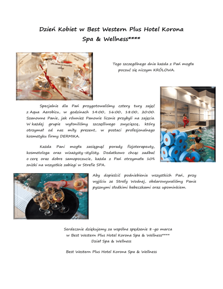 Dzień Kobiet w Best Western Plus Hotel Korona Spa & Wellness**** Tego szczególnego dnia każda z Pań mogła poczuć się niczym KRÓLOWA. Specjalnie dla Pań przygotowaliśmy cztery tury zajęć z Aqua Aerobicu, w godzinach 14:00, 16:00, 18:00, 20:00. Szanowne Panie, jak również Panowie licznie przybyli na zajęcia. W każdej grupie otrzymał od wyłoniliśmy nas miły szczęśliwego prezent, zwycięzcę, który w postaci profesjonalnego zasięgnąć porady fizjoterapeuty, kosmetyku firmy DERMIKA. Każda Pani mogła kosmetologa oraz wizażysty-stylisty. Dodatkowo chcąc zadbać o cerę oraz dobre samopoczucie, każda z Pań otrzymała 10% zniżki na wszystkie zabiegi w Strefie SPA. Aby dopieścić podniebienia wszystkich Pań, przy wyjściu ze Strefy Wodnej, obdarowywaliśmy Panie pysznymi słodkimi babeczkami oraz upominkiem. Serdecznie dziękujemy za wspólne spędzenie 8-go marca w Best Western Plus Hotel Korona Spa & Wellness**** Dział Spa & Wellness Best Western Plus Hotel Korona Spa & Wellness