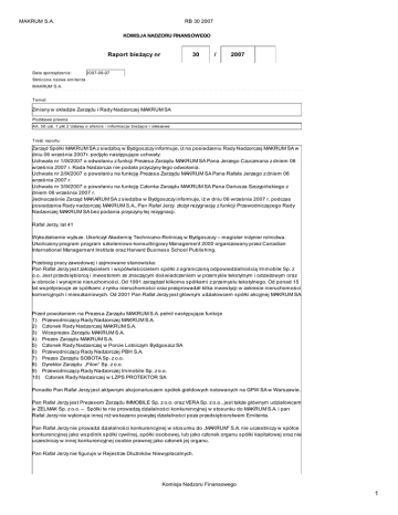 MAKRUM S.A. RB 30 2007 KOMISJA NADZORU FINANSOWEGO Raport bieŜący nr Data sporządzenia: 30 / 2007 2007-09-07 Skrócona nazwa emitenta MAKRUM S.A. Temat Zmiany w składzie Zarządu i Rady Nadzorczej MAKRUM SA Podstawa prawna Art. 56 ust. 1 pkt 2 Ustawy o ofercie - informacje bieŜące i okresowe Treść raportu: Zarząd Spółki MAKRUM SA z siedzibą w Bydgoszczy informuje, iŜ na posiedzeniu Rady Nadzorczej MAKRUM SA w dniu 06 września 2007r. podjęto następujące uchwały: Uchwała nr 1/IX/2007 o odwołaniu z funkcji Prezesa Zarządu MAKRUM SA Pana Jerzego Czuczmana z dniem 06 września 2007 r. Rada Nadzorcza nie podała przyczyny tego odwołania. Uchwała nr 2/IX/2007 o powołaniu na funkcję Prezesa Zarządu MAKRUM SA Pana Rafała Jerzego z dniem 06 września 2007 r. Uchwała nr 3/IX/2007 o powołaniu na funkcję Członka Zarządu MAKRUM SA Pana Dariusza Szczypińskiego z dniem 06 września 2007 r. Jednocześnie Zarząd MAKARUM SA z siedziba w Bydgoszczy informuje, iŜ w dniu 06 września 2007 r. podczas posiedzenia Rady nadzorczej MAKRUM S.A., Pan Rafał Jerzy złoŜył rezygnację z funkcji Przewodniczącego Rady Nadzorczej MAKRUM SA bez podania przyczyny tej rezygnacji. Rafał Jerzy, lat 41 Wykształcenie wyŜsze. Ukończył Akademię Techniczno-Rolniczą w Bydgoszczy – magister inŜynier rolnictwa. Ukończony program program szkoleniowo-konsultingowy Management 2000 organizowany przez Canadian International Management Institute oraz Harvard Business School Publishing. Przebieg pracy zawodowej i zajmowane stanowiska: Pan Rafał Jerzy jest załoŜycielem i współwłaścicielem spółki z ograniczoną odpowiedzialnością Immobile Sp. z o.o. Jest przedsiębiorcą i inwestorem ze znaczącym doświadczeniem w przemyśle tekstylnym i odzieŜowym oraz w obrocie i wynajmie nieruchomości. Od 1991 zarządzał kilkoma spółkami z przemysłu tekstylnego. Od ponad 15 lat współpracuje ze spółkami z rynku nieruchomości oraz przeprowadził kilka inwestycji w zakresie nieruchomości komercyjnych i mieszkaniowych. Od 2001 Pan Rafał Jerzy jest głównym udziałowcem spółki akcyjnej MAKRUM SA Przed powołaniem na Prezesa Zarządu MAKRUM S.A. pełnił następujące funkcje 1) Przewodniczący Rady Nadzorczej MAKRUM S.A. 2) Członek Rady Nadzorczej MAKRUM S.A. 3) Wiceprezes Zarządu MAKRUM S.A. 4) Prezes Zarządu MAKRUM S.A. 5) Członek Rady Nadzorczej w Porcie Lotniczym Bydgoszcz SA 6) Przewodniczący Rady Nadzorczej PBH S.A. 7) Prezes Zarządu SOBOTA Sp. z o.o. 8) Dyrektor Zarządu „Filon” Sp. z o.o. 9) Przewodniczący Rady Nadzorczej Immobile Sp. z o.o. 10) Członek Rady Nadzorczej w LZPS PROTEKTOR SA Ponadto Pan Rafał Jerzy jest aktywnym akcjonariuszem spółek giełdowych notowanych na GPW SA w Warszawie. Pan Rafał Jerzy jest Prezesem Zarządu IMMOBILE Sp. z o.o. oraz VERA Sp. z o.o., jest takŜe głównym udziałowcem w ZELMAK Sp. z o.o. – Spółki te nie prowadzą działalności konkurencyjnej w stosunku do MAKRUM S.A. i pan Rafał Jerzy nie wykonuje innej niŜ wskazano powyŜej działalności poza przedsiębiorstwem Emitenta. Pan Rafał Jerzy nie prowadzi działalności konkurencyjnej w stosunku do „MAKRUM” S.A. nie uczestniczy w spółce konkurencyjnej jako wspólnik spółki cywilnej, spółki osobowej, lub jako członek organu spółki kapitałowej oraz nie uczestniczy w innej konkurencyjnej osobie prawnej jako członek jej organu. Pan Rafał Jerzy nie figuruje w Rejestrze DłuŜników Niewypłacalnych. Komisja Nadzoru Finansowego 1 MAKRUM S.A. RB 30 2007 Dariusz Szczypiński lat 34 Wykształcenie wyŜsze ekonomiczne; ukończył Uniwersytet Mikołaja Kopernika w Toruniu na kierunku Zarządzanie i Marketing; studiował na Uniwersytecie w Saarbrucken „Universitat des Saarlandes” (Niemcy); ukończył Podyplomowe Studium Rachunkowości na Akademii Ekonomicznej w Poznaniu oraz Podyplomowe Studium Bankowości w WyŜszej Szkole Bankowej w Poznaniu. Przed powołaniem na członka zarządu Amica Wronki S.A. pełnił następujące funkcje: 1) Analityk kredytowy w Banku Gdańskim S.A. 2) Analityk kredytowy w Bankgesellschaft Berlin Polska S.A. 3) Specjalista ds. inŜynierii finansowej w Amica Wronki S.A. 4) Główny specjalista ds. planowania finansowego w Amica Wronki S.A. 5) Dyrektor ekonomiczny w Amica Wronki S.A. 6) Członek rady nadzorczej Amica Sport S.S.A. 7) Członek rady nadzorczej Gram Domestic AS (Dania) 8) Członek Zarządu - dyrektor ds. finansowych w Amica Wronki S.A. Pan Dariusz Szczypiński nie wykonuje innej działalności poza przedsiębiorstwem Emitenta. Pan Dariusz Szczypiński nie prowadzi działalności konkurencyjnej w stosunku do „MAKRUM” S.A. nie uczestniczy w spółce konkurencyjnej jako wspólnik spółki cywilnej, spółki osobowej, lub jako członek organu spółki kapitałowej oraz nie uczestniczy w innej konkurencyjnej osobie prawnej jako członek jej organu. Pan Dariusz Szczypiński nie figuruje w Rejestrze DłuŜników Niewypłacalnych. MAKRUM SPÓŁKA AKCYJNA (pełna nazwa emitenta) MAKRUM S.A. Przemysł inne (pin) (skróc ona nazwa emitenta) 85-676 (sektor wg. klasyfikacji GPW w W-wie) Bydgoszcz (kod pocztowy) (miejscowość) Leśna 11-19 (ulica) (numer) 052 3236401 (telefon) (fax) [email protected] www.makrum.pl (e-mail) (www) 9540309005 090549380 (NIP) (REGON) PODPISY OSÓB REPREZENTUJĄCYCH SPÓŁKĘ Data Imię i Nazwisko Stanowisko/Funkc ja 2007-09-07 Rafał Jerzy Prezes Zarządu 2007-09-07 Stanisław Reszkowski Prokurent Podpis Komisja Nadzoru Finansowego 2
