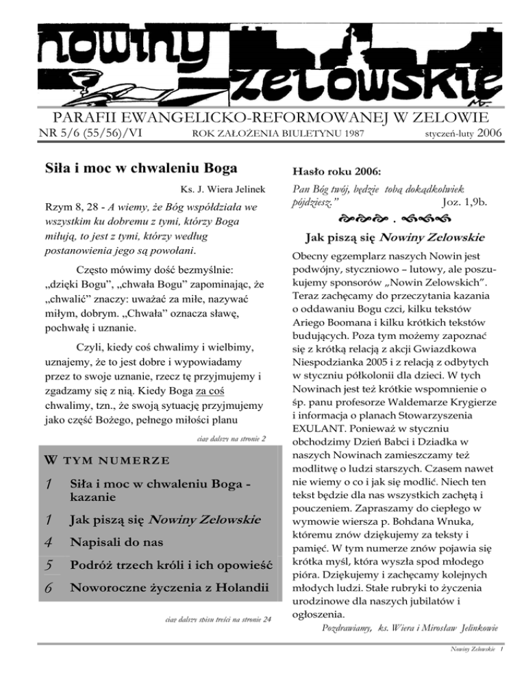 PARAFII EWANGELICKO-REFORMOWANEJ W ZELOWIE NR 5/6 (55/56)/VI ROK ZAŁOŻENIA BIULETYNU 1987 Siła i moc w chwaleniu Boga Ks. J. Wiera Jelinek Rzym 8, 28 - A wiemy, że Bóg współdziała we wszystkim ku dobremu z tymi, którzy Boga miłują, to jest z tymi, którzy według postanowienia jego są powołani. Często mówimy dość bezmyślnie: „dzięki Bogu”, „chwała Bogu” zapominając, że „chwalić” znaczy: uważać za miłe, nazywać miłym, dobrym. „Chwała” oznacza sławę, pochwałę i uznanie. Czyli, kiedy coś chwalimy i wielbimy, uznajemy, że to jest dobre i wypowiadamy przez to swoje uznanie, rzecz tę przyjmujemy i zgadzamy się z nią. Kiedy Boga za coś chwalimy, tzn., że swoją sytuację przyjmujemy jako część Bożego, pełnego miłości planu ciąg dalszy na stronie 2 W TYM NUMERZE 1 Siła i moc w chwaleniu Boga kazanie 1 4 5 6 Jak piszą się Nowiny Zelowskie Napisali do nas Podróż trzech króli i ich opowieść Noworoczne życzenia z Holandii ciąg dalszy spisu treści na stronie 24 styczeń-luty 2006 Hasło roku 2006: Pan Bóg twój, będzie tobą dokądkolwiek pójdziesz.” Joz. 1,9b. [[[ . \\\ Jak piszą się Nowiny Zelowskie Obecny egzemplarz naszych Nowin jest podwójny, styczniowo – lutowy, ale poszukujemy sponsorów „Nowin Zelowskich”. Teraz zachęcamy do przeczytania kazania o oddawaniu Bogu czci, kilku tekstów Ariego Boomana i kilku krótkich tekstów budujących. Poza tym możemy zapoznać się z krótką relacją z akcji Gwiazdkowa Niespodzianka 2005 i z relacją z odbytych w styczniu półkolonii dla dzieci. W tych Nowinach jest też krótkie wspomnienie o śp. panu profesorze Waldemarze Krygierze i informacja o planach Stowarzyszenia EXULANT. Ponieważ w styczniu obchodzimy Dzień Babci i Dziadka w naszych Nowinach zamieszczamy też modlitwę o ludzi starszych. Czasem nawet nie wiemy o co i jak się modlić. Niech ten tekst będzie dla nas wszystkich zachętą i pouczeniem. Zapraszamy do ciepłego w wymowie wiersza p. Bohdana Wnuka, któremu znów dziękujemy za teksty i pamięć. W tym numerze znów pojawia się krótka myśl, która wyszła spod młodego pióra. Dziękujemy i zachęcamy kolejnych młodych ludzi. Stałe rubryki to życzenia urodzinowe dla naszych jubilatów i ogłoszenia. Pozdrawiamy, ks. Wiera i Mirosław Jelinkowie Nowiny Zelowskie 1 ciąg dalszy ze strony 1 względem naszego życia i że się z tym zgadzamy nawet wówczas, jeśli w grę wchodzą ciężar, choroba... Nie chodzi o to, byśmy chwalili Boga za coś, za co faktycznie w ogóle nie jesteśmy wdzięczni. A nie możemy być wdzięczni za coś, z czego się nie cieszymy. Dlatego ręka w rękę z chwaleniem i wielbieniem idą wdzięczność i radość. Zwróćmy uwagę na następującą prawidłowość - już zwykła rzecz, że dziękujemy Bogu za swoją sytuację udowadnia, że czynimy Boga za tę sytuację odpowiedzialnym - w przeciwnym razie przecież nie byłoby sensu Go chwalić i wielbić. Czytamy w Piśmie Świętym: „Zawsze się radujcie! Bez przestanku się módlcie! Za wszystko dziękujcie!; taka jest bowiem wola Boża względem was” (I Tes. 5,16-18). Znamy ludzi, którzy mogą chwalić Pana za swoją ciężką sytuację po prostu dlatego, że przyjęli Boże słowo, które każe im dziękować za wszystko. Chwaląc i dziękując, człowiek szybko dochodzi do stanu ustawicznej wdzięczności i radości, wiara rośnie a wdzięczność i uwielbienie Boga stają się stylem życia. Inni ludzie z kolei uważają to za rzecz trudną i kłopotliwą. „Po prostu tego nie rozumiem” - mówią. Staram się chwalić Boga, ale naprawdę jest mi ciężko we wszystkim trudnym, przez co przechodzę w moim życiu widzieć Bożą rękę.” Mówimy, że tego nie rozumiemy i tkwimy w tej postawie nie podając jej żadnym zmianom. Nasze zrozumienie rzeczy staje się nam kamieniem zgorszenia w stosunku do Boga. Ale Pan Bóg ma swój doskonały plan również dla naszego rozumienia i, jeśli używamy go według Bożej woli, przestanie być kamieniem obrazy a stanie się kosztowną pomocą dla naszej wiary. Ponieważ wolą Bożą nie jest, abyśmy odsunęli albo zdeptali swoją zdolność pojmowania i mówili z zaciętymi zębami „wprawdzie tego nie rozumiem, ale chwalę Boga, nawet gdybym miał zginąć, jeśli to jest jedyna możliwość wydostania się tych tarapatów”. Takie zachowanie nie byłoby jednak oddawaniem Bogu chwały, ale manipulacją. I, przyznajmy, próbowaliśmy już w swoim życiu manipulować w taki sposób Panem Bogiem. Na szczęście Bóg jest pełen łaski i w Jezusie Chrystusie odpuszcza nam wszystkie wyznane Mu grzechy. A my mamy Go chwalić mądrze i rozumnie, nie na przekór rozumowi. Nasz system pojmowania nas zamęczy, jeśli będziemy chcieli dociec dlaczego Bóg dopuszcza konkretne okoliczności w naszym życiu. Nigdy w pełni nie pojmiemy dlaczego i jak Bóg coś robi, ale mamy po prostu zrozumieć i uznać, że to robi. Bóg chce nas nauczyć rozumieć, że nas kocha i że ma dla naszego życia swój plan: „Wiemy, że Bóg współdziała we wszystkim ku dobremu z tymi, którzy Boga miłują.” (Rzym. 8,28a) Może jesteś akurat w jakiejś niełatwej sytuacji? Starasz się rozpaczliwie pojąć dlaczego coś takiego przytrafiło się akurat tobie? Spróbuj przyjąć rozumem, że Bóg ciebie kocha, i że dopuścił te okoliczności dlatego, że wie iż służą ci ku dobremu. Chwal Go za to, co umieścił w twoim życiu; uczyń to świadomie, z pełnym uczestnictwem twojego umysłu. Przyjrzyjmy się kilku konkretnym sytuacjom: Pewne małżeństwo ma córkę psychicznie chorą... może się buntować i wołać: „my mamy podziękować? - Ależ to by było bluźnierstwo, gdybyśmy Bogu podziękowali za coś tak strasznego... Nowiny Zelowskie 2 gdybyśmy Mu podziękowali, to by znaczyło, że Go obwiniamy za to, że naszą córkę umyślnie męczy... a to się nie zgadza z naszym wyobrażeniem Boga pełnego miłości.” 