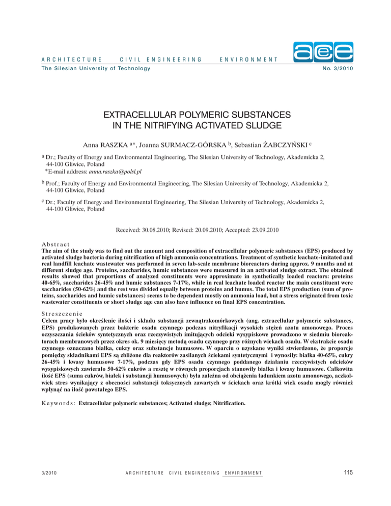 A R C H I T E C T U R E C I V I L E N G I N E E R I N G E N V I R O N M E N T T h e S i l e s i a n U n i v e r s i t y o f Te c h n o l o g y N o. 3 / 2 0 1 0 EXTRACELLULAR POLYMERIC SUBSTANCES IN THE NITRIFYING ACTIVATED SLUDGE Anna RASZKA a*, Joanna SURMACZ-GÓRSKA b, Sebastian ŻABCZYŃSKI c a Dr.; Faculty of Energy and Environmental Engineering, The Silesian University of Technology, Akademicka 2, 44-100 Gliwice, Poland *E-mail address: [email protected] b Prof.; Faculty of Energy and Environmental Engineering, The Silesian University of Technology, Akademicka 2, 44-100 Gliwice, Poland c Dr.; Faculty of Energy and Environmental Engineering, The Silesian University of Technology, Akademicka 2, 44-100 Gliwice, Poland Received: 30.08.2010; Revised: 20.09.2010; Accepted: 23.09.2010 Abstract The aim of the study was to find out the amount and composition of extracellular polymeric substances (EPS) produced by activated sludge bacteria during nitrification of high ammonia concentrations. Treatment of synthetic leachate-imitated and real landfill leachate wastewater was performed in seven lab-scale membrane bioreactors during approx. 9 months and at different sludge age. Proteins, saccharides, humic substances were measured in an activated sludge extract. The obtained results showed that proportions of analyzed constituents were approximate in synthetically loaded reactors: proteins 40-65%, saccharides 26-45% and humic substances 7-17%, while in real leachate loaded reactor the main constituent were saccharides (50-62%) and the rest was divided equally between proteins and humus. The total EPS production (sum of proteins, saccharides and humic substances) seems to be dependent mostly on ammonia load, but a stress originated from toxic wastewater constituents or short sludge age can also have influence on final EPS concentration. Streszczenie Celem pracy było określenie ilości i składu substancji zewnątrzkomórkowych (ang. extracellular polymeric substances, EPS) produkowanych przez bakterie osadu czynnego podczas nitryfikacji wysokich stężeń azotu amonowego. Proces oczyszczania ścieków syntetycznych oraz rzeczywistych imitujących odcieki wysypiskowe prowadzono w siedmiu bioreaktorach membranowych przez okres ok. 9 miesięcy metodą osadu czynnego przy różnych wiekach osadu. W ekstrakcie osadu czynnego oznaczano białka, cukry oraz substancje humusowe. W oparciu o uzyskane wyniki stwierdzono, że proporcje pomiędzy składnikami EPS są zbliżone dla reaktorów zasilanych ściekami syntetycznymi i wynosiły: białka 40-65%, cukry 26-45% i kwasy humusowe 7-17%, podczas gdy EPS osadu czynnego poddanego działaniu rzeczywistych odcieków wysypiskowych zawierało 50-62% cukrów a resztę w równych proporcjach stanowiły białka i kwasy humusowe. Całkowita ilość EPS (suma cukrów, białek i substancji humusowych) była zależna od obciążenia ładunkiem azotu amonowego, aczkolwiek stres wynikający z obecności substancji toksycznych zawartych w ściekach oraz krótki wiek osadu mogły również wpłynąć na ilość powstałego EPS. K e y w o r d s : Extracellular polymeric substances; Activated sludge; Nitrification. 3/2010 ARCHITECTURE CIVIL ENGINEERING ENVIRONMENT 115
