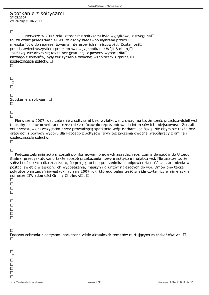 Gmina Chojnów - Strona główna Spotkanie z sołtysami 27.02.2007. Zmieniony 19.06.2007. Pierwsze w 2007 roku zebranie z sołtysami było wyjątkowe, z uwagi na to, że cześć przedstawicieli wsi to osoby niedawno wybrane przez mieszkańców do reprezentowania interesów ich miejscowości. Zostali oni przedstawieni wszystkim przez prowadzącą spotkanie Wójt Barbarę Jasińską. Nie obyło się także bez gratulacji z powody wyboru dla każdego z sołtysów, były też życzenia owocnej współpracy z gminą i społecznością sołectw. Spotkanie z sołtysami Pierwsze w 2007 roku zebranie z sołtysami było wyjątkowe, z uwagi na to, że cześć przedstawicieli wsi to osoby niedawno wybrane przez mieszkańców do reprezentowania interesów ich miejscowości. Zostali oni przedstawieni wszystkim przez prowadzącą spotkanie Wójt Barbarę Jasińską. Nie obyło się także bez gratulacji z powody wyboru dla każdego z sołtysów, były też życzenia owocnej współpracy z gminą i społecznością sołectw. Podczas zebrania sołtysi zostali poinformowani o nowych zasadach rozliczania dojazdów do Urzędu Gminy, przedyskutowano także sposób przekazania nowym sołtysom majątku wsi. Nie znaczy to, że sołtysi coś otrzymali, oznacza to, że przejęli oni po poprzednikach odpowiedzialność za stan mienia w postaci świetlic wiejskich, ich wyposażenia, maszyn i gruntów należących do wsi. Omówiono także pokrótce plan zadań inwestycyjnych na 2007 rok, którego pełną treść znajdą czytelnicy w niniejszym numerze Wiadomości Gminy Chojnów. Podczas zebrania z sołtysami poruszono wiele aktualnych tematów nurtujących mieszkańców wsi. http://gmina-chojnow.pl/www Kreator PDF Utworzono 7 March, 2017, 14:56 Gmina Chojnów - Strona główna onownie zapoznano sołtysów z zasadami wynajmu świetlic, nowi otrzymali regulaminy dotyczące sposobu ich wynajmowania i użytkowania. Poproszono sołtysów o przypomnienie mieszkańcom-rolnikom o obowiązku ubezpieczenia gospodarstw, oraz o tym, iż gmina będzie wypełnienie tego obowiązku kontrolować. O możliwości kolejnych tym razem dobrowolnych ubezpieczeń mówiła tez zastępca wójta Wanda Chomiczewska. Poinformowała także o możliwości dopłat do materiału siewnego, ponieważ nie zapadły jeszcze w tej sprawie ostateczne decyzję sołtysi zostaną o temacie poinformowani w terminie późniejszym. Ucieszą się z pewnością mieszkańcy Dzwonowa, Biskupina i Budziwojowa, kiedy dowiedzą się, że to w tych wsiach w tym roku zostaną zamontowane dodatkowe lampy oświetleniowe (po 1 szt. na wieś). Miejsce ich ustawienia sołtysi powinni uzgodnić z mieszkańcami. Przypomniano sołtysom, że można zgłaszać akces do organizacji jednej z imprez gminnych. Wiemy, że do organizacji dożynek zgłosiły się już Strupice i Rokitki, na razie nie wybrano jednak wsi, gdzie święto plonów się odbędzie. Czekamy na zgłoszenia do organizacji Święta Ludowego. Sołtysi spotkali się także z przedstawicielami Banku Zachodniego, którzy przedstawili ofertę dla rolników AGRO PAKIET w zakresie prowadzenia rachunków, finansowania wydatków bieżących lub inwestycji, lokowania nadwyżki środków finansowych, korzystania z Banku przez internet oraz finansowania wydatków przy użyciu kart płatniczych. Monika Sobczak Przedstawiciele Banku Zachodniego przedstawili ofertę dla rolników AGRO PAKIET. http://gmina-chojnow.pl/www Kreator PDF Utworzono 7 March, 2017, 14:56 Gmina Chojnów - Strona główna Elżbieta Ląd jest jedną z sześciu nowych sołtysów gminy Chojnów. http://gmina-chojnow.pl/www Kreator PDF Utworzono 7 March, 2017, 14:56