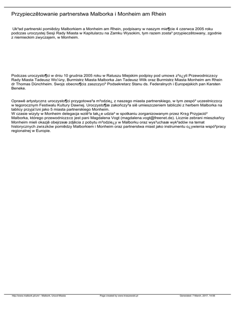 Przypieczêtowanie partnerstwa Malborka i Monheim am Rhein Uk³ad partnerski pomiêdzy Malborkiem a Monheim am Rhein, podpisany w naszym mie¶cie 4 czerwca 2005 roku podczas uroczystej Sesji Rady Miasta w Kapitularzu na Zamku Wysokim, tym razem zosta³ przypieczêtowany, zgodnie z niemieckim zwyczajem, w Monheim. Podczas uroczysto¶ci w dniu 10 grudnia 2005 roku w Ratuszu Miejskim podpisy pod umow± z³o¿yli Przewodnicz±cy Rady Miasta Tadeusz Wo¼ny, Burmistrz Miasta Malborka Jan Tadeusz Wilk oraz Burmistrz Miasta Monheim am Rhein dr Thomas Dünchheim. Swoj± obecno¶ci± zaszczyci³ Podsekretarz Stanu ds. Federalnych i Europejskich pan Karsten Beneke. Oprawê artystyczn± uroczysto¶ci przygotowa³a m³odzie¿ z naszego miasta partnerskiego, w tym zespó³ uczestnicz±cy w tegorocznym Festiwalu Kultury Dawnej. Uroczysto¶æ zakoñczy³a siê umieszczeniem tabliczki z herbem Malborka na tablicy przyja¼ni jako 5 miasta partnerskiego Monheim. W czasie wizyty w Monheim delegacja wziê³a tak¿e udzia³ w spotkaniu zorganizowanym przez Kr±g Przyjació³ Malborka, którego przewodnicz±c± jest pani Magdalena Vogt ([email protected]). Licznie zebrani mieszkañcy Monheim mieli okazjê obejrzeæ zdjêcia z pobytu m³odzie¿y w Malborku oraz wys³uchaæ wyk³adów na temat historycznych zwi±zków pomiêdzy Malborkiem i Monheim oraz partnerstwa miast jako instrumentu o¿ywienia wspó³pracy regionalnej w Europie. http://www.malbork.pl/um/ - Malbork, Urz±d Miasta Page created by www.kraszewski.pl Generated: 7 March, 2017, 14:56