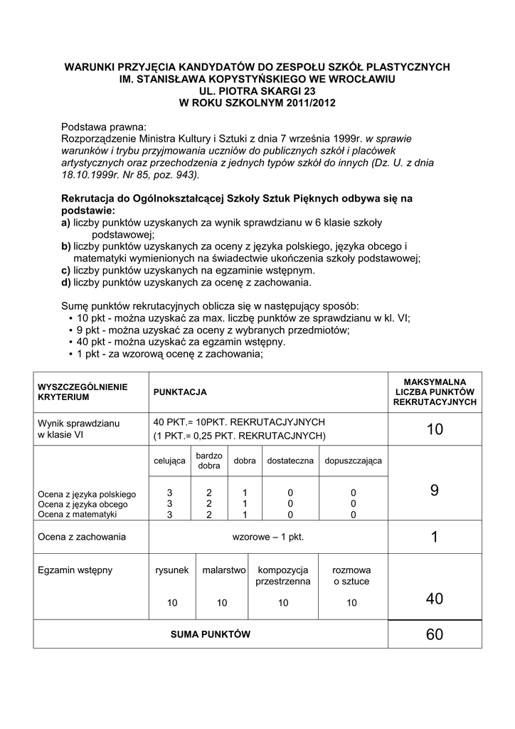WARUNKI PRZYJĘCIA KANDYDATÓW DO ZESPOŁU SZKÓŁ PLASTYCZNYCH IM. STANISŁAWA KOPYSTYŃSKIEGO WE WROCŁAWIU UL. PIOTRA SKARGI 23 W ROKU SZKOLNYM 2011/2012 Podstawa prawna: Rozporządzenie Ministra Kultury i Sztuki z dnia 7 września 1999r. w sprawie warunków i trybu przyjmowania uczniów do publicznych szkół i placówek artystycznych oraz przechodzenia z jednych typów szkół do innych (Dz. U. z dnia 18.10.1999r. Nr 85, poz. 943). Rekrutacja do Ogólnokształcącej Szkoły Sztuk Pięknych odbywa się na podstawie: a) liczby punktów uzyskanych za wynik sprawdzianu w 6 klasie szkoły podstawowej; b) liczby punktów uzyskanych za oceny z języka polskiego, języka obcego i matematyki wymienionych na świadectwie ukończenia szkoły podstawowej; c) liczby punktów uzyskanych na egzaminie wstępnym. d) liczby punktów uzyskanych za ocenę z zachowania. Sumę punktów rekrutacyjnych oblicza się w następujący sposób: ▪ 10 pkt - można uzyskać za max. liczbę punktów ze sprawdzianu w kl. VI; ▪ 9 pkt - można uzyskać za oceny z wybranych przedmiotów; ▪ 40 pkt - można uzyskać za egzamin wstępny. ▪ 1 pkt - za wzorową ocenę z zachowania; MAKSYMALNA LICZBA PUNKTÓW REKRUTACYJNYCH WYSZCZEGÓLNIENIE KRYTERIUM PUNKTACJA Wynik sprawdzianu w klasie VI 40 PKT.= 10PKT. REKRUTACJYJNYCH (1 PKT.= 0,25 PKT. REKRUTACJNYCH) Ocena z języka polskiego Ocena z języka obcego Ocena z matematyki celująca bardzo dobra dobra dostateczna dopuszczająca 3 3 3 2 2 2 1 1 1 0 0 0 0 0 0 Ocena z zachowania Egzamin wstępny 10 1 wzorowe – 1 pkt. rysunek malarstwo kompozycja przestrzenna rozmowa o sztuce 10 10 10 10 SUMA PUNKTÓW 9 40 60 Rekrutacja do Liceum Plastycznego odbywa się na podstawie: a) liczby punktów uzyskanych za wynik egzaminu gimnazjalnego; b) liczby punktów uzyskanych za oceny z języka polskiego, języka obcego i matematyki wymienionych na świadectwie ukończenia gimnazjum; c) liczby punktów uzyskanych za osiągnięcia w konkursach plastycznych. d) liczby punktów uzyskanych na egzaminie wstępnym. Sumę punktów rekrutacyjnych oblicza się w następujący sposób: ▪ 10 pkt - można uzyskać za max. liczbę punktów uzyskanych na egzaminie gimnazjalnym; ▪ 9 pkt - można uzyskać za oceny z wybranych przedmiotów; ▪ 1 pkt - za osiągnięcia w konkursach plastycznych; ▪ 40 pkt - można uzyskać za egzamin wstępny. WYSZCZEGÓLNIENIE KRYTERIUM Wynik egzaminu gimnazjalnego Ocena z języka polskiego Ocena z języka obcego Ocena z matematyki MAKSYMALNA LICZBA PUNKTÓW REKRUTACYJNYCH PUNKTACJA 100 pkt. - 10pkt. REKRUTACJYJNYCH (1 pkt. - 0,1 pkt. REKRUTACJNYCH) celująca bardzo dobra dobra dostateczna dopuszczająca 3 3 3 2 2 2 1 1 1 0 0 0 0 0 0 Osiągnięcia w konkursach plastycznych Egzamin wstępny 10 1 1 pkt. rysunek malarstwo kompozycja przestrzenna 9 rozmowa o sztuce 40 10 10 SUMA PUNKTÓW 10 10 60 UWAGA: Laureaci konkursu „Zdolny Ślązak” przystępują do egzaminu wstępnego, a w części rekrutacji obejmującej przedmioty ogólnokształcące uzyskują maksymalną liczbę punktów. Terminarz dla kandydatów do OSSP i LP Egzamin wstępny odbędzie się w dniach: do Zespołu Szkół Plastycznych we Wrocławiu 20.06.2011r. godz. 9.00 – egzamin z rysunku, malarstwa, kompozycji przestrzennej. 21.06.2011r. godz. 9.00 – rozmowa kwalifikacyjna z przedmiotu "sztuka". 22 - 28 28 czerwca 2011 2011 – składanie świadectw i zaświadczeń o egzaminie gimnazjalnym 29 czerwca 2011 godz. 12.00 — OGŁOSZENIE LISTY PRZYJĘTYCH Na egzamin w dniu 20.06.2011r. kandydat zobowiązany jest posiadać: blok rysunkowy nr 2 (format A3), pędzel okrągły, nożyczki, farby akwarele, małe naczynie na wodę, ołówki różnej twardości, klej do papieru, papier kolorowy.