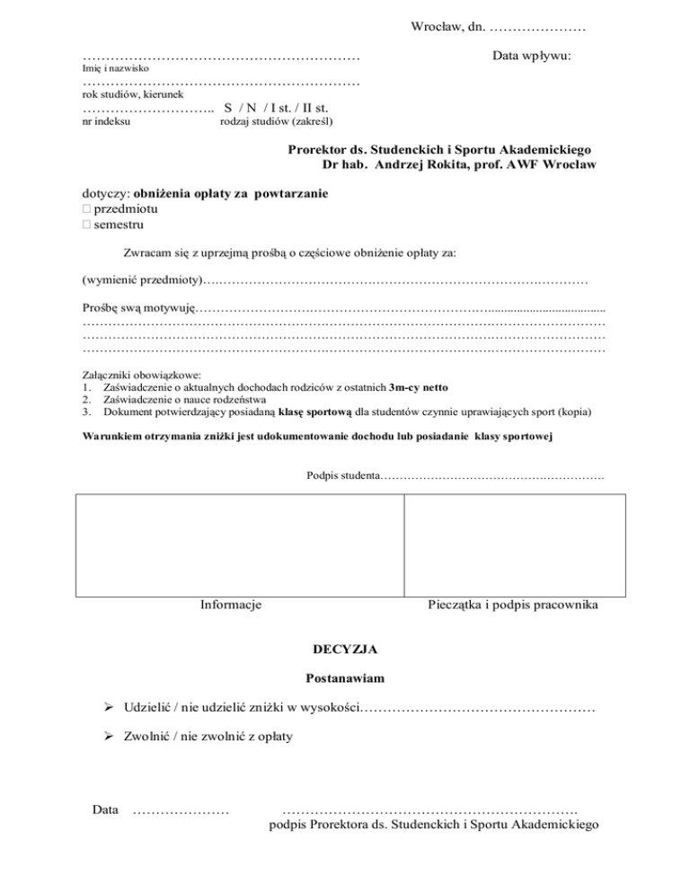 Wrocław, dn. ………………… …………………………………………………… Data wpływu: Imię i nazwisko …………………………………………………… rok studiów, kierunek ……………………….. S / N / I st. / II st. nr indeksu rodzaj studiów (zakreśl) Prorektor ds. Studenckich i Sportu Akademickiego Dr hab. Andrzej Rokita, prof. AWF Wrocław dotyczy: obniżenia opłaty za powtarzanie przedmiotu semestru Zwracam się z uprzejmą prośbą o częściowe obniżenie opłaty za: (wymienić przedmioty)….…………………………………………………………………………… Prośbę swą motywuję……………………………………………………………..................................... …………………………………………………………………………………………………………… …………………………………………………………………………………………………………… …………………………………………………………………………………………………………… Załączniki obowiązkowe: 1. Zaświadczenie o aktualnych dochodach rodziców z ostatnich 3m-cy netto 2. Zaświadczenie o nauce rodzeństwa 3. Dokument potwierdzający posiadaną klasę sportową dla studentów czynnie uprawiających sport (kopia) Warunkiem otrzymania zniżki jest udokumentowanie dochodu lub posiadanie klasy sportowej Podpis studenta…………………………………………………. Informacje Pieczątka i podpis pracownika DECYZJA Postanawiam Ø Udzielić / nie udzielić zniżki w wysokości…………………………………………… Ø Zwolnić / nie zwolnić z opłaty Data ………………… ………………………………………………………. podpis Prorektora ds. Studenckich i Sportu Akademickiego